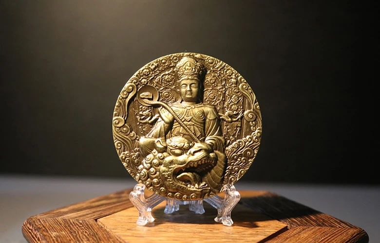 文殊头戴天冠,瑞相慈祥;青狮昂首阔口,气势雄壮。以文殊善相和青狮威吼彰显恩威尊崇,启迪迷众智慧。