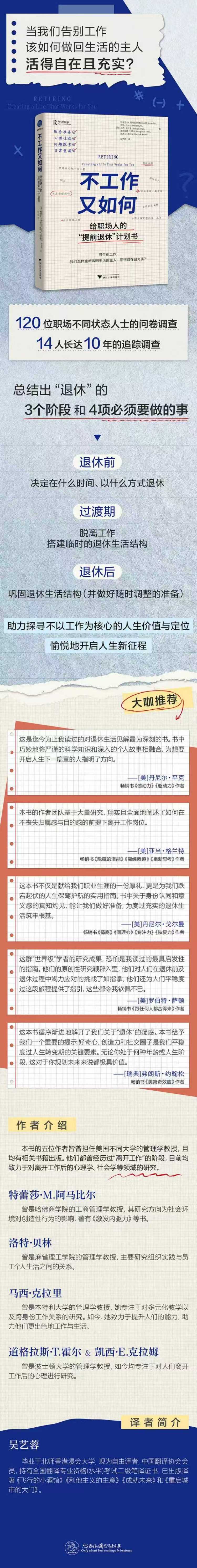 本书的五位作者皆曾担任美国不同大学的管理学教授,且均有相关书籍出版。他们都曾经历过;离开工作的阶段,目前均致力于对离开工作后的心理学、社会学等领域的研究。