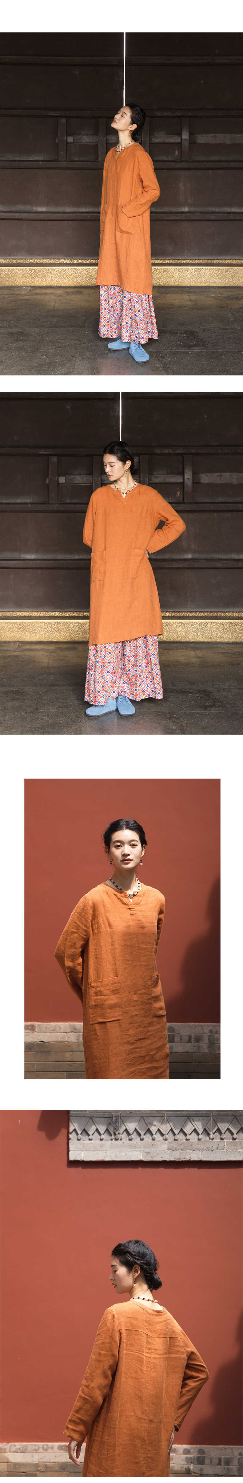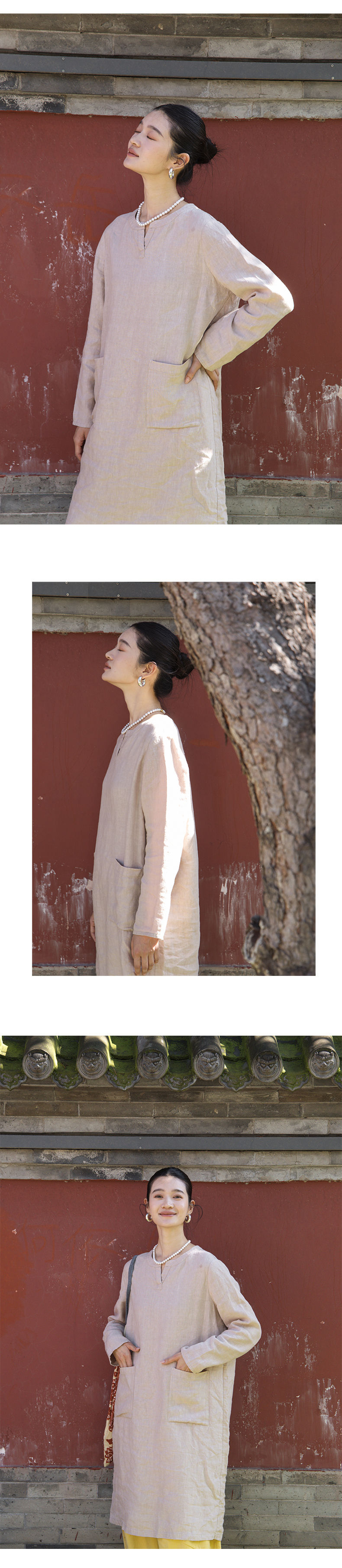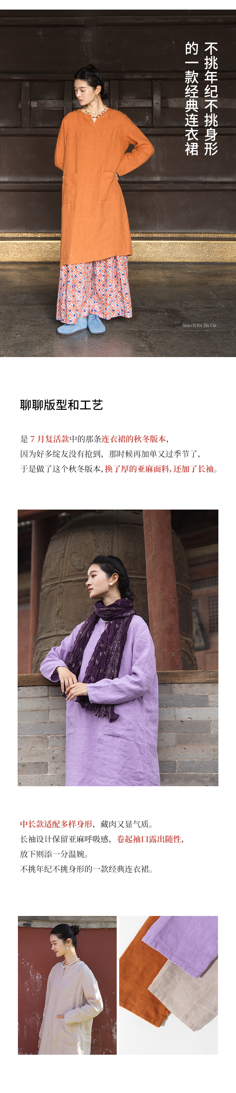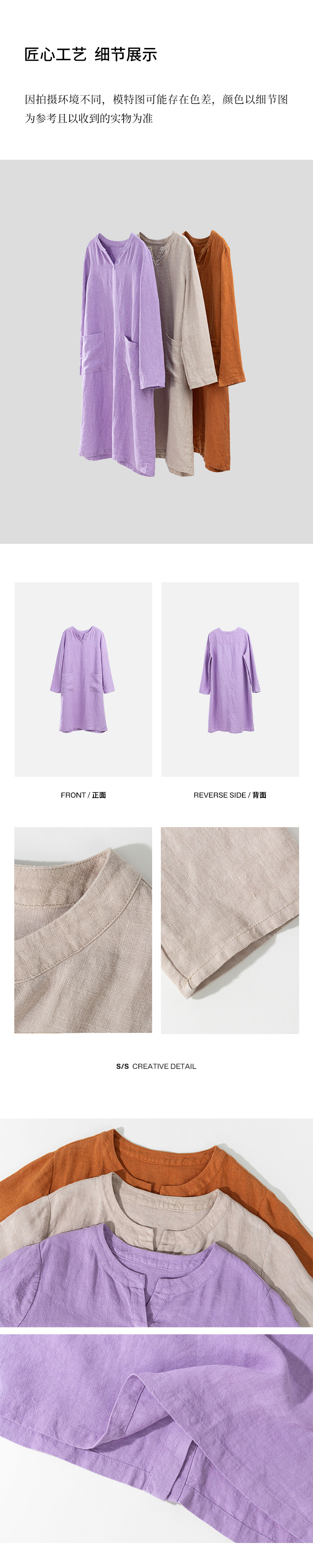 绽放557朵/重磅皱纹砂洗亚麻开V领宽松文艺长袖中长款连衣裙女秋