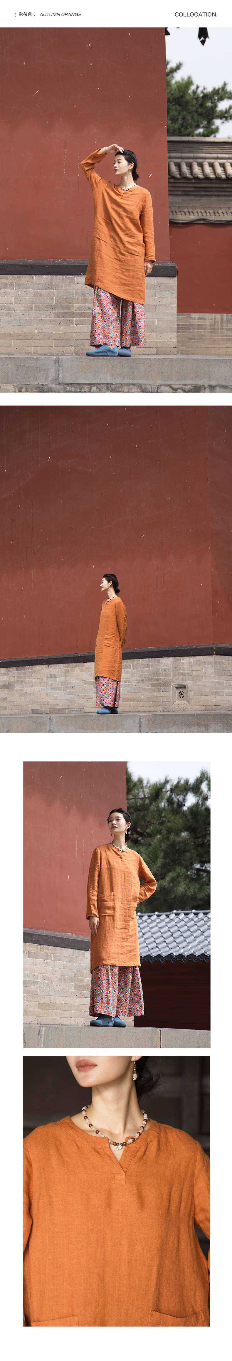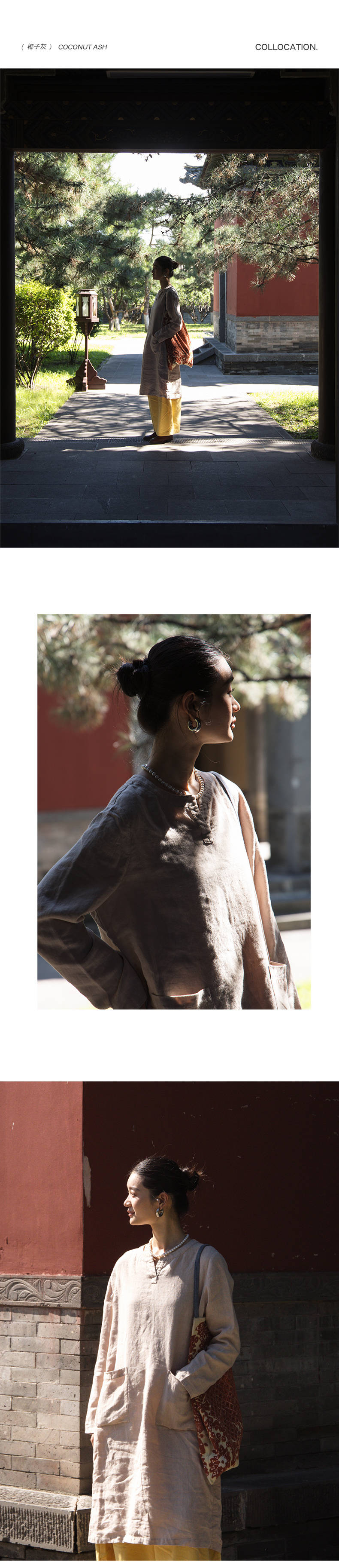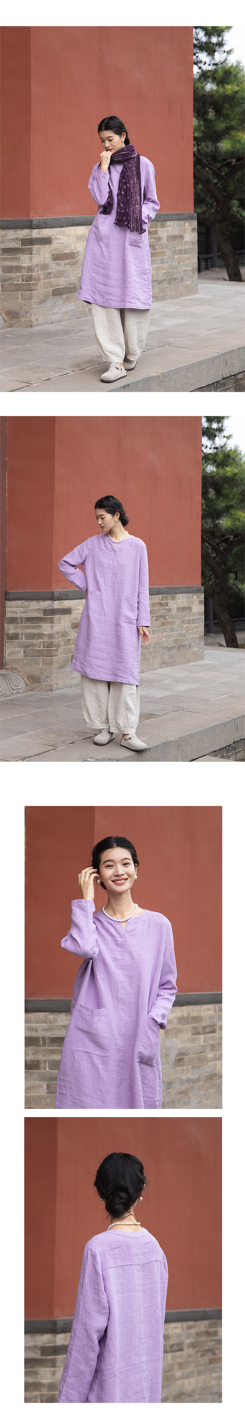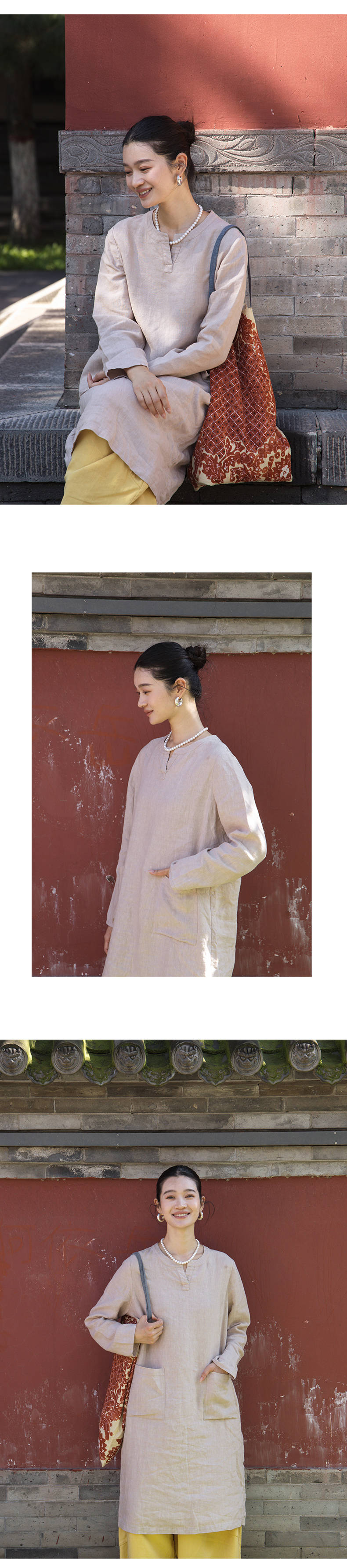 绽放557朵/重磅皱纹砂洗亚麻开V领宽松文艺长袖中长款连衣裙女秋