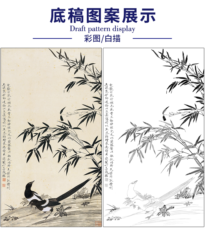 于非闇花鸟工笔画白描底稿《墨竹双鹊》临摹勾线高清打印稿HS27