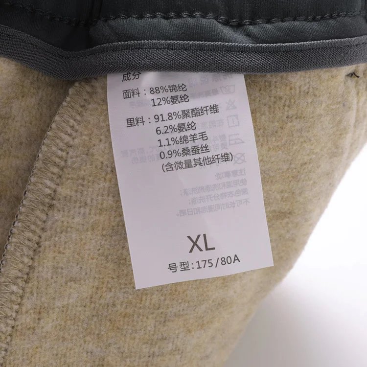 里料:95.3%聚酯纤维 3.1%氨纶 0.8%绵羊毛 0.8%桑蚕丝