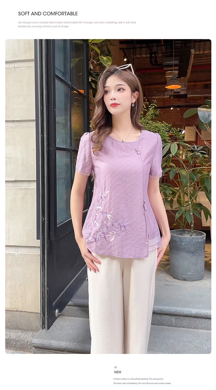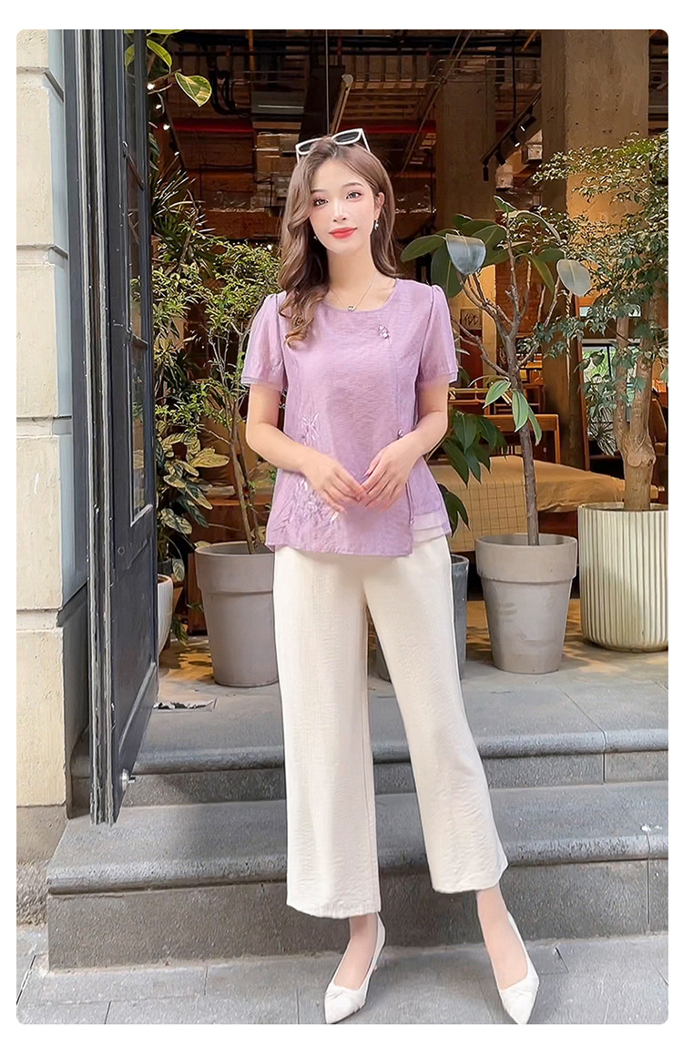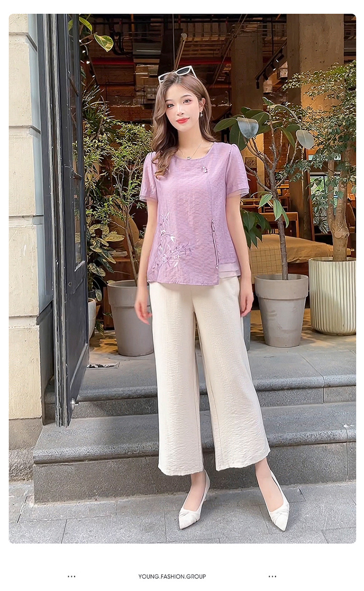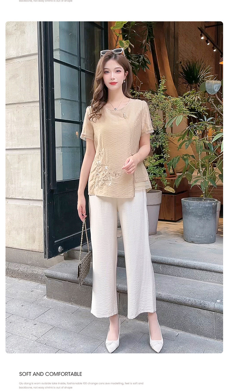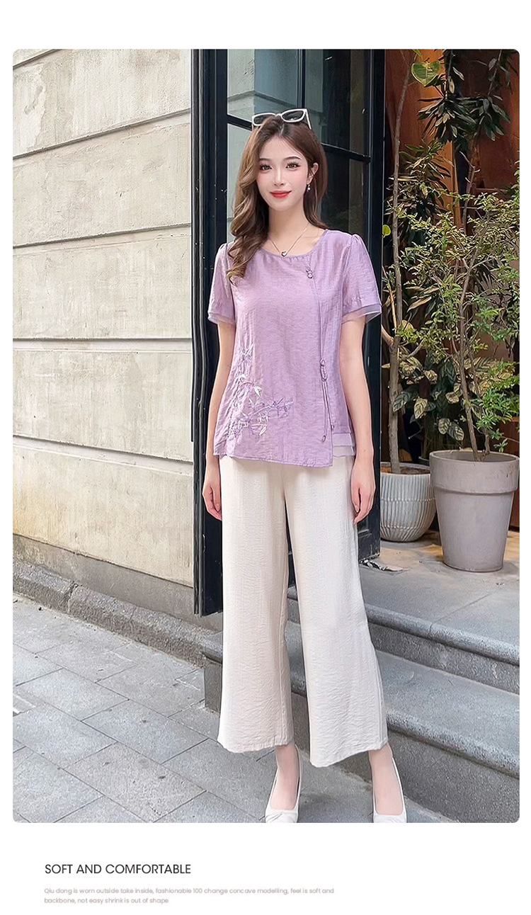 QYM YZY2467-Y妈妈装休闲两件套不对称小衫+直筒裤套装
