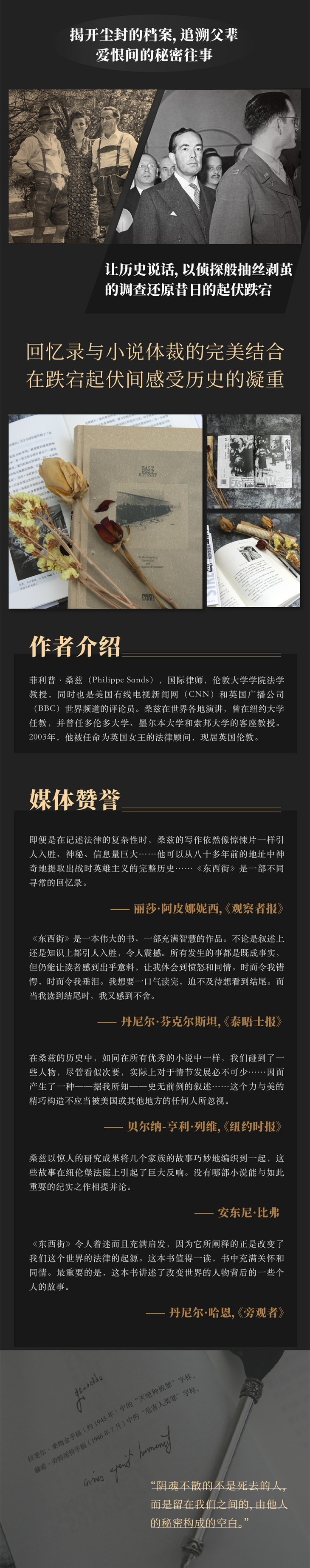 《东西街》令人着迷而且充满启发,因为它所阐释的正是改变了我们这个世界的法律的起源。这本书值得一读,书中充满关怀和同情。最重要的是,这本书讲述了改变世界的人物背后的一些个人的故事。