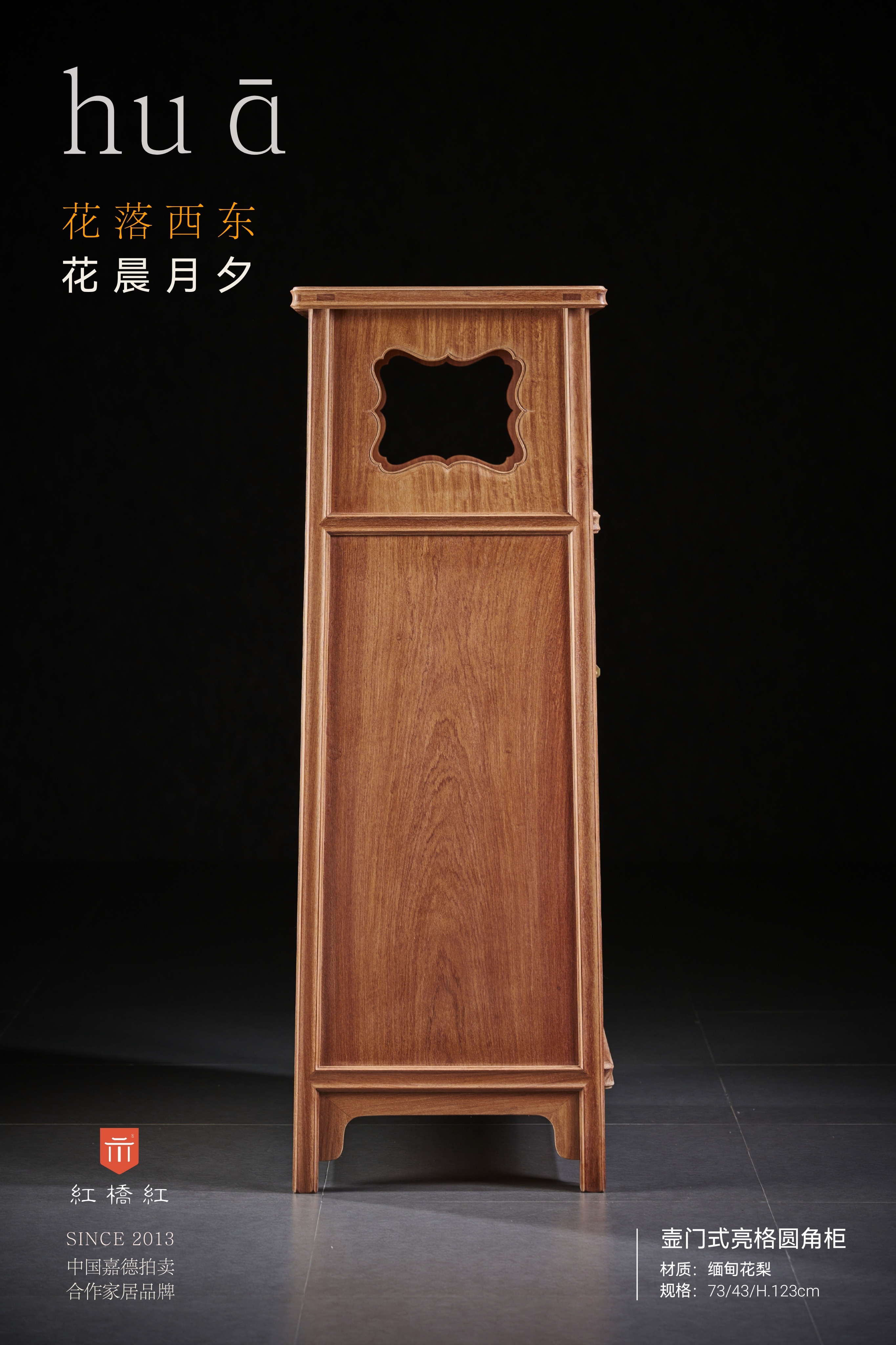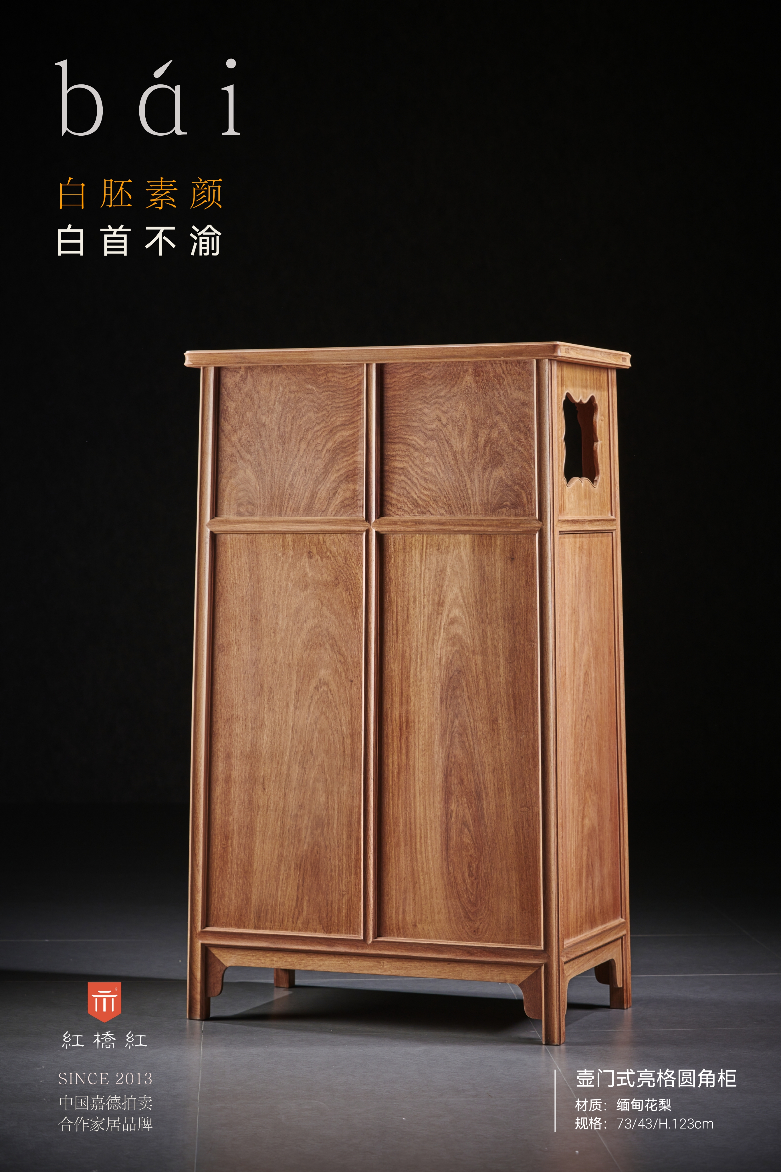 此柜整器独板制,柜体呈A字型,器型文雅有度,气韵犹如传统圆角柜。此柜柜帽喷出,顶部有穿带承托柜顶;上格后背装板,三面敞开,亮格正面安壸门式券口,沿边起阳线,中央出尖,弧线刚劲有力,又不失优美;两侧安洼堂肚式圈口牙子。