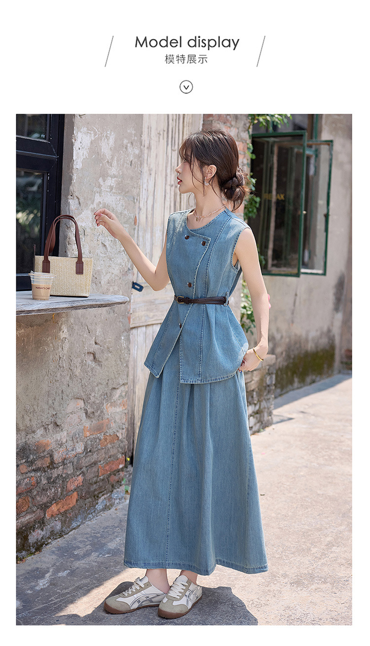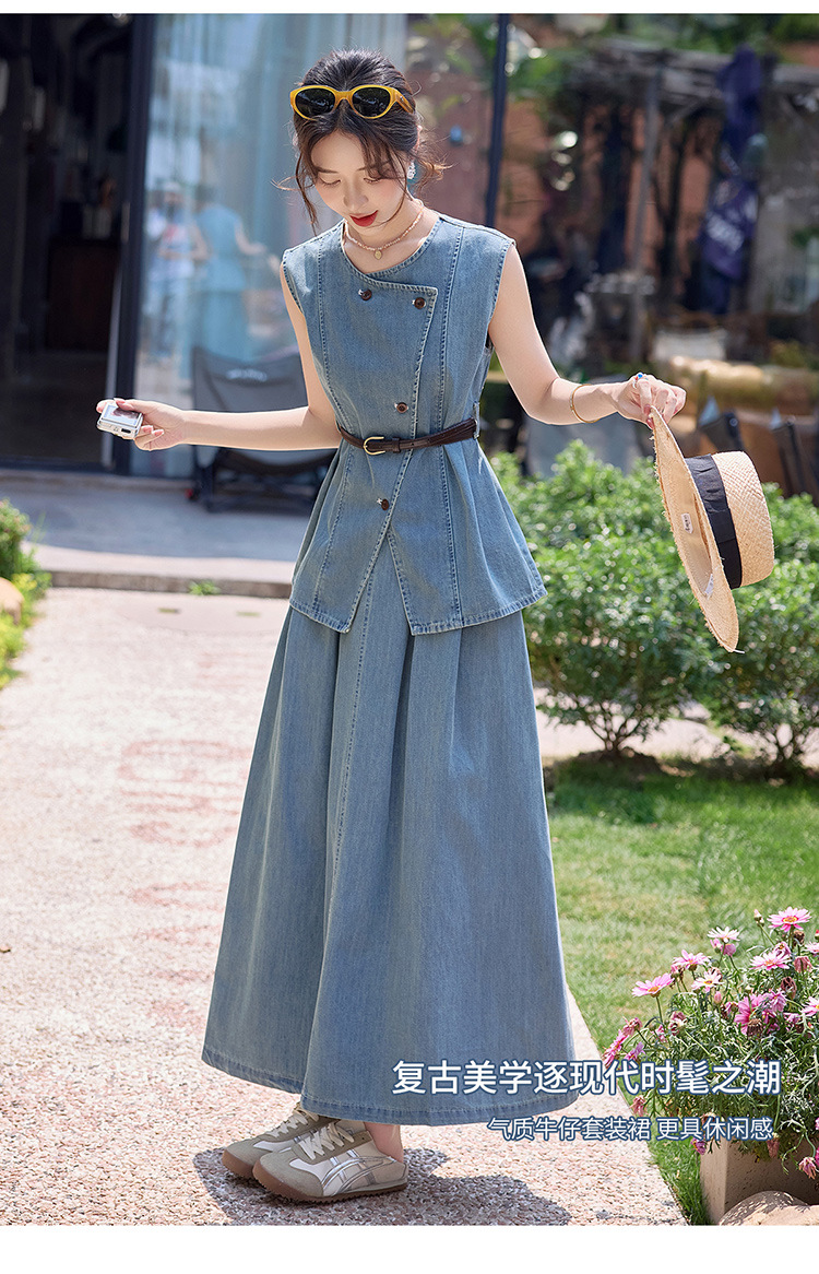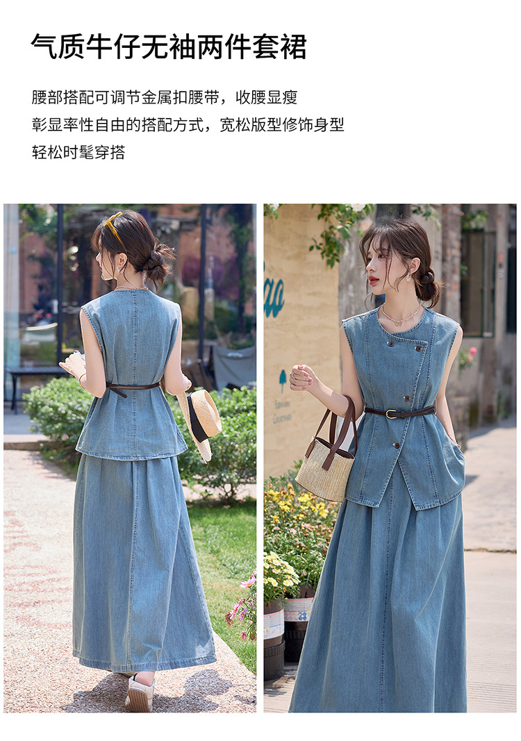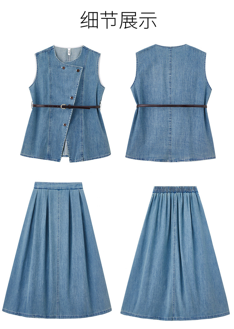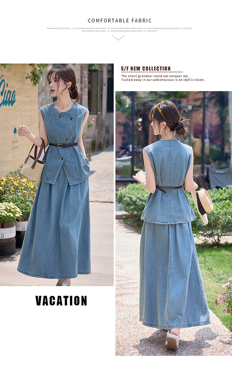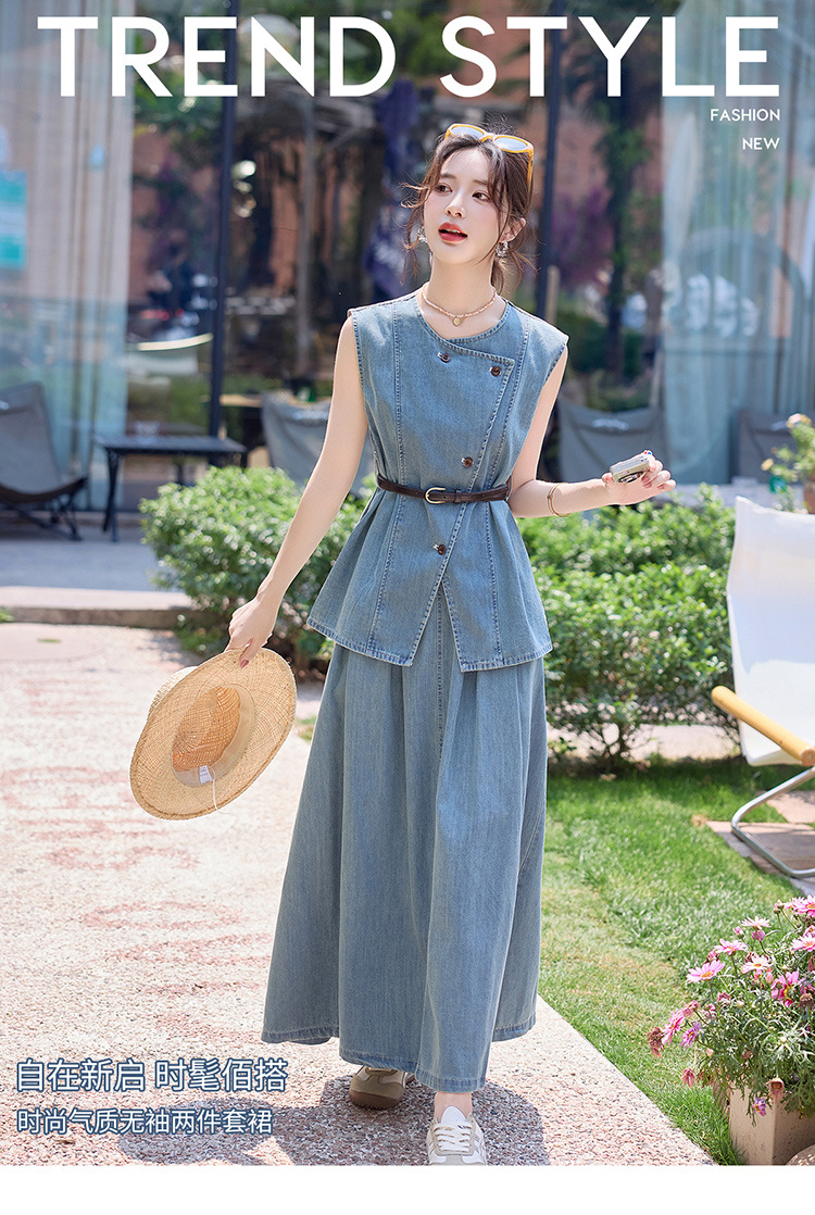 牛仔无袖上衣半身裙两件套,气质修身牛仔套装HR-YLFS9003