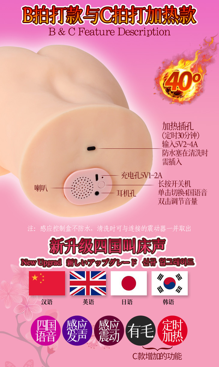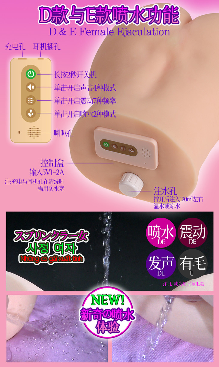 喷水款功能:内置7频震动,4种发声,2模式喷水,进口SRFS原料,双色双通道,逼真上色,电池容量:2000mA