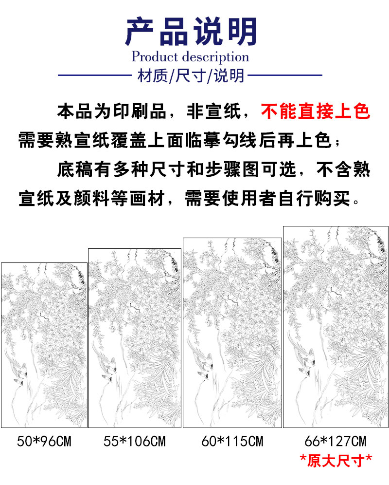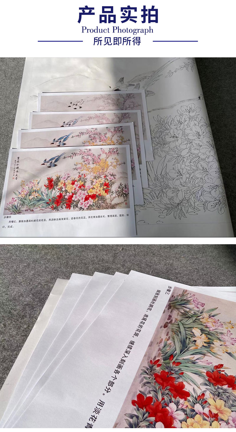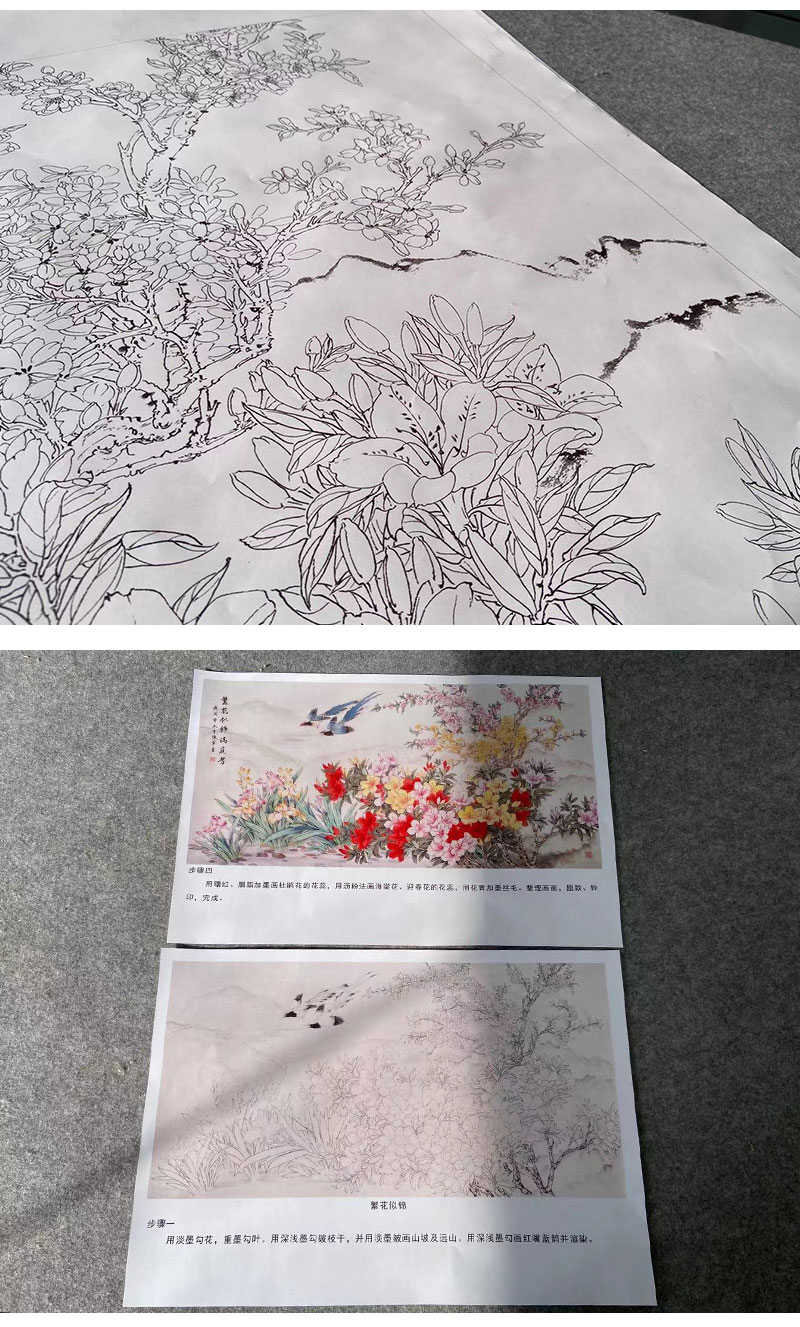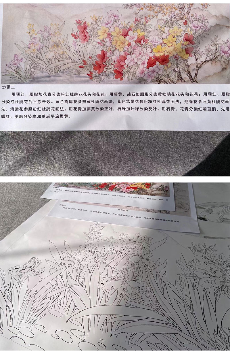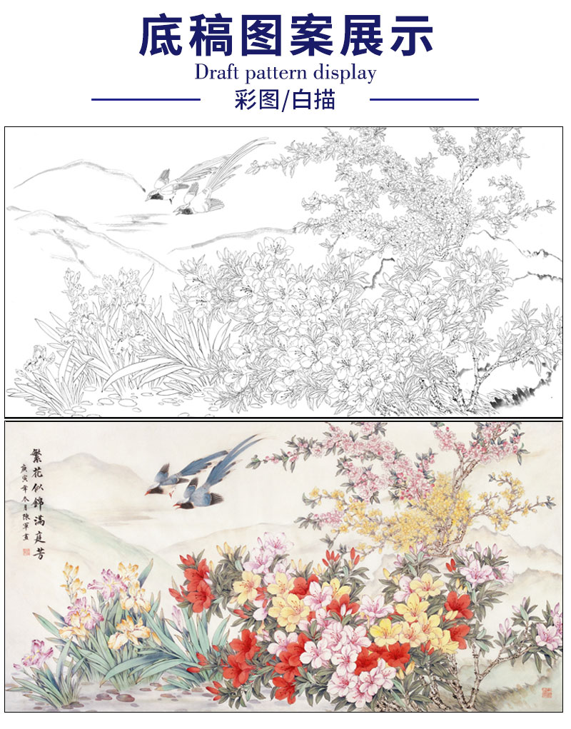 【有步骤】陈军横幅工笔画白描底稿《繁花似锦》蓝鹊杜鹃花初学者临摹花鸟线稿CJ16