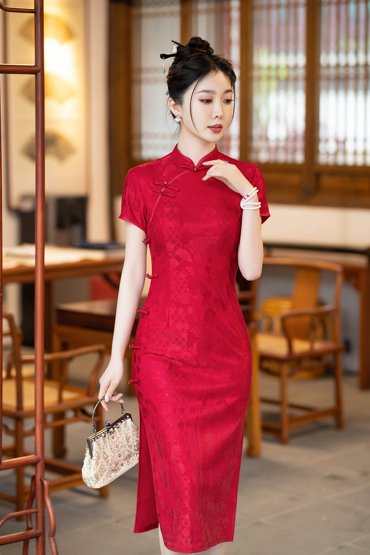 ZAYS024夏季新款改良蕾丝红色婚宴礼服短袖气质立领长旗袍裙