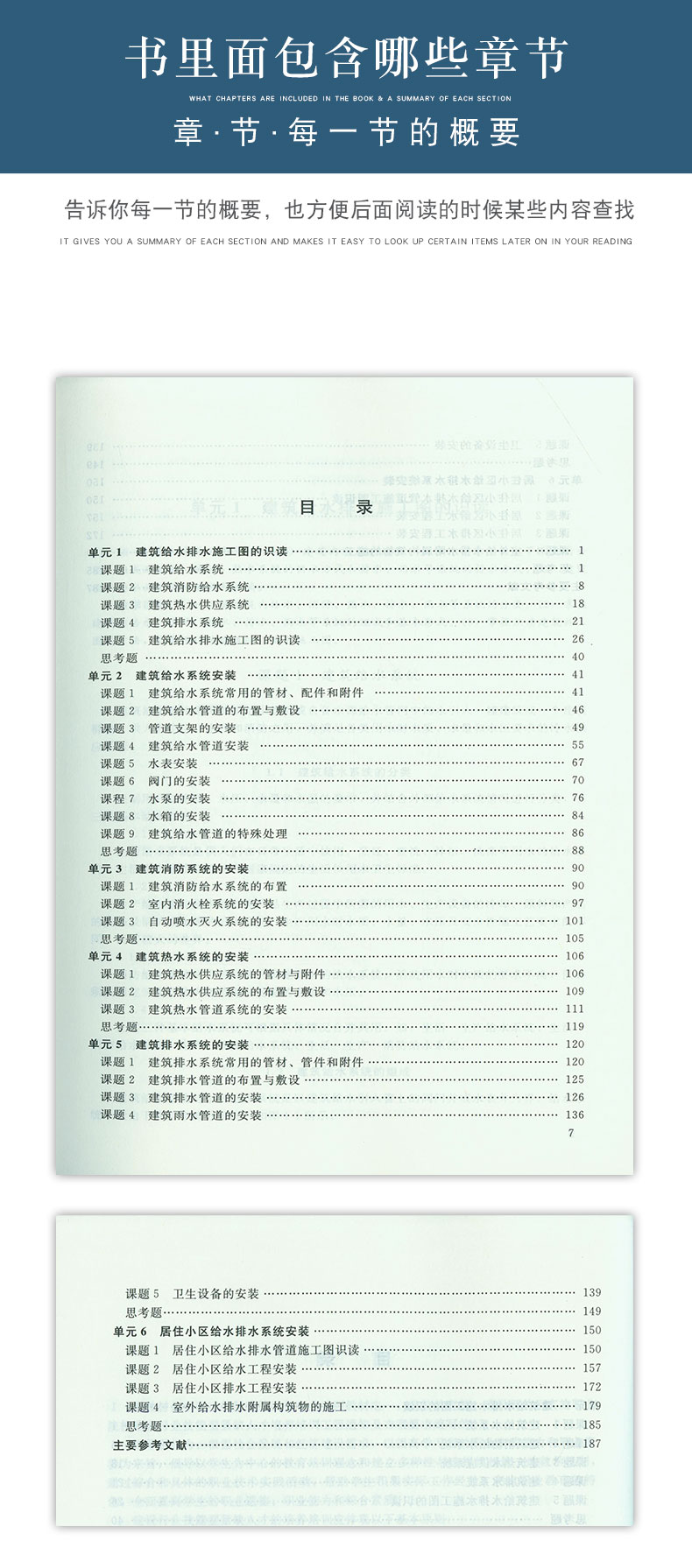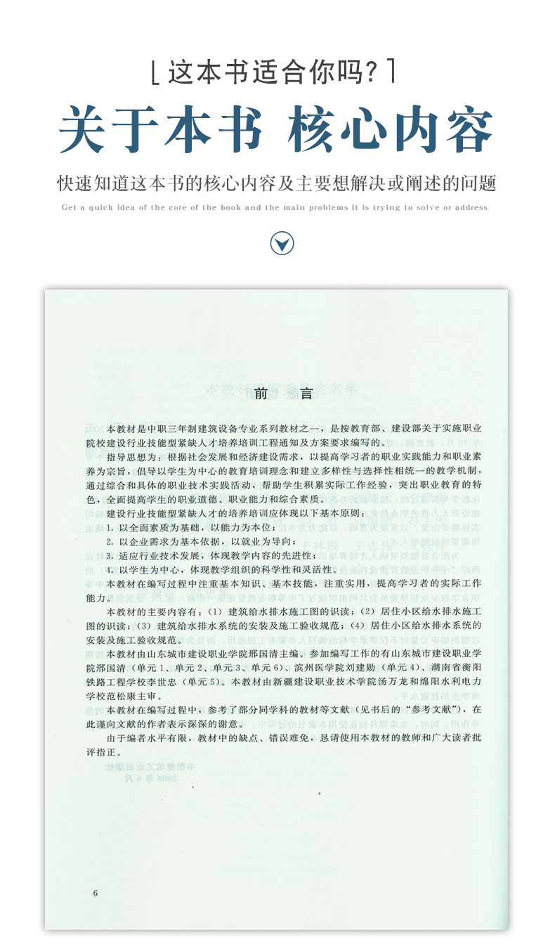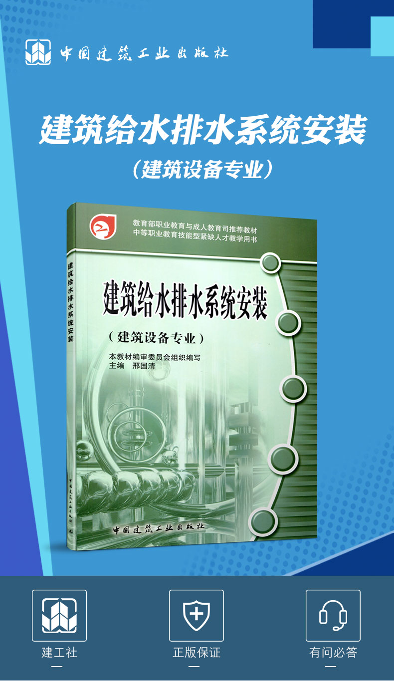 本书是根据教育部、建设部组织编制的“中等职业学校建设行业技能型紧缺人才建筑设备专业培养方案”编写的。全书共分6个单元,单元1为建筑给水排水施工图的识图,主要讲述建筑的给水系统、消防系统、热水系统、排水系统及其施工图的识读;单元2为建筑给水系统的安装,主要讲述建筑给水系统常用的管材、配件与附件,建筑给水管道的布置与敷设,管道支架、建筑给水管道、水表、阀门、水泵、水箱的安装,建筑给水管道的特殊处理;单元3为建筑消防给水系统的安装,主要讲述建筑消防给水系统的布置,室内消火栓系统及自动喷水灭火系统的安装;单元4为建筑热水供应系统的安装,主要讲述建筑热水供应系统的管材与附件、建筑热水供应系统的布置与敷设、建筑热水管道系统的安装;单元5为建筑排水系统的安装,主要讲述建筑排水系统常用的管材、管件和附件,建筑排水管道的布置与敷设,建筑排水管道、建筑雨水管道及卫生设备的安装;单元6为居住小区给水排水系统的安装,主要讲述居住小区给水排水管道施工图的识读,给水工程及排水工程安装,室外给水排水附属构筑物的施工。 本书突出中等职业教育特色,有实用性、针对性强,除可作为建筑类中等职业学校建筑设备专业的教材外,也可作为从事建筑设备工作的中等技术管理施工人员学习的参考书。