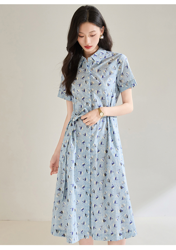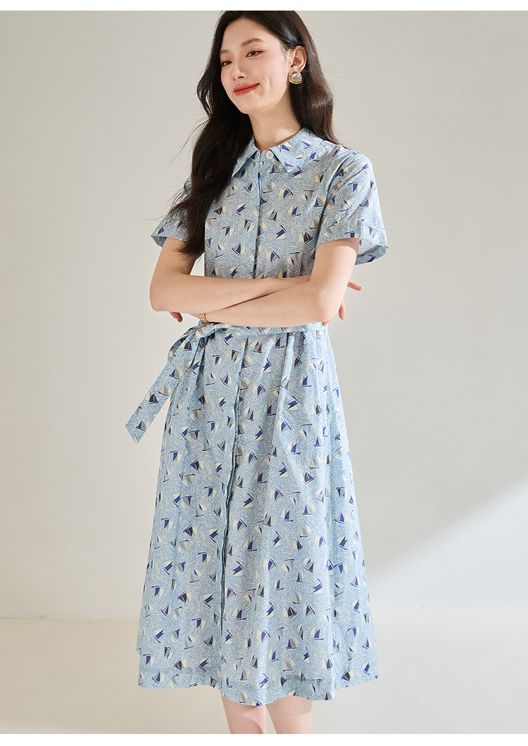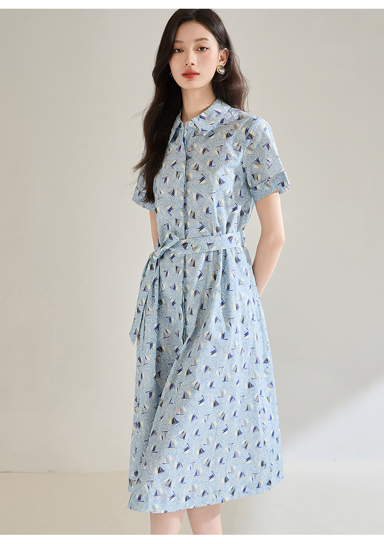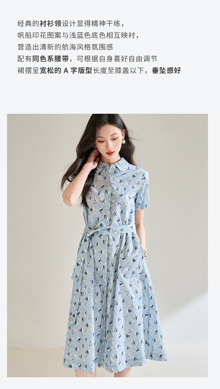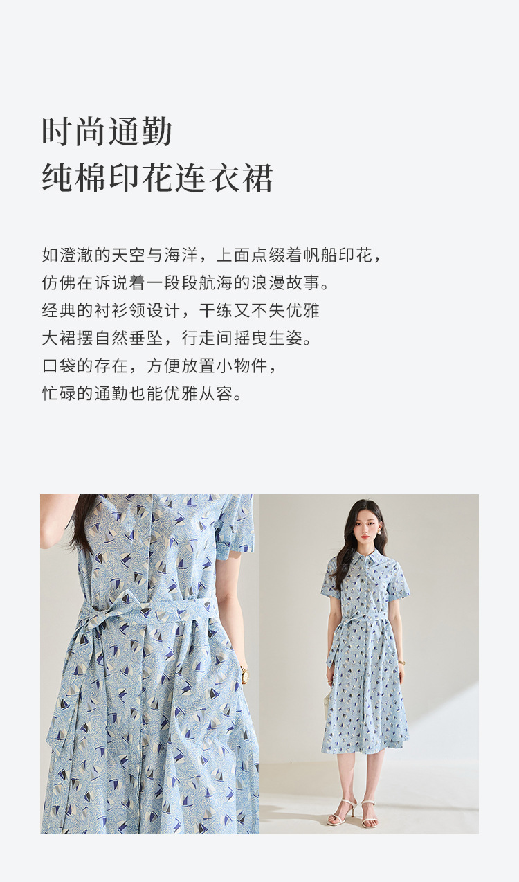 百媚生 夏季抗皱全棉印花蓝色帆船圆领长款连衣裙18830
