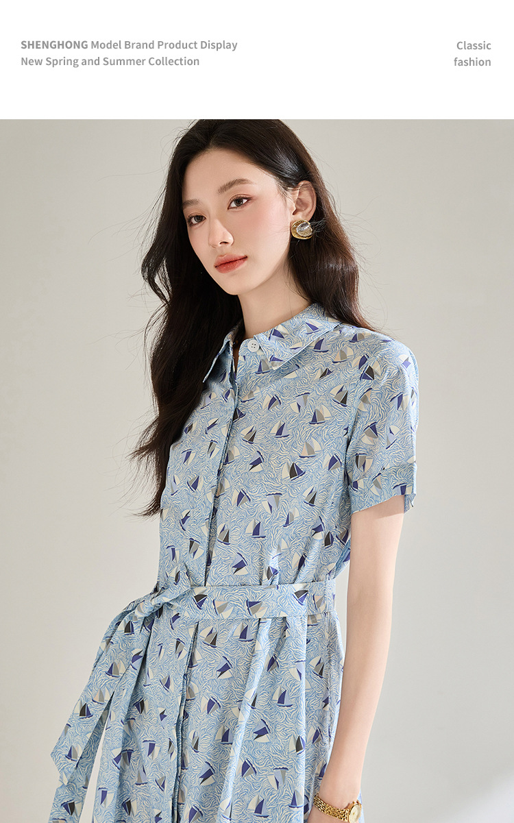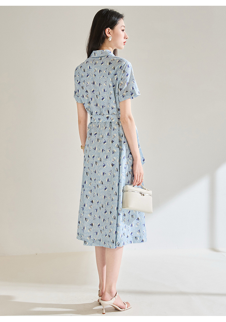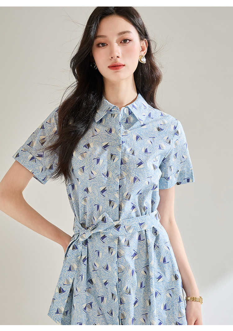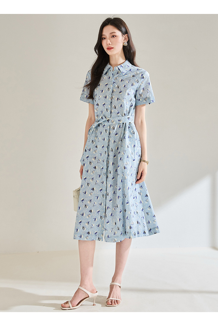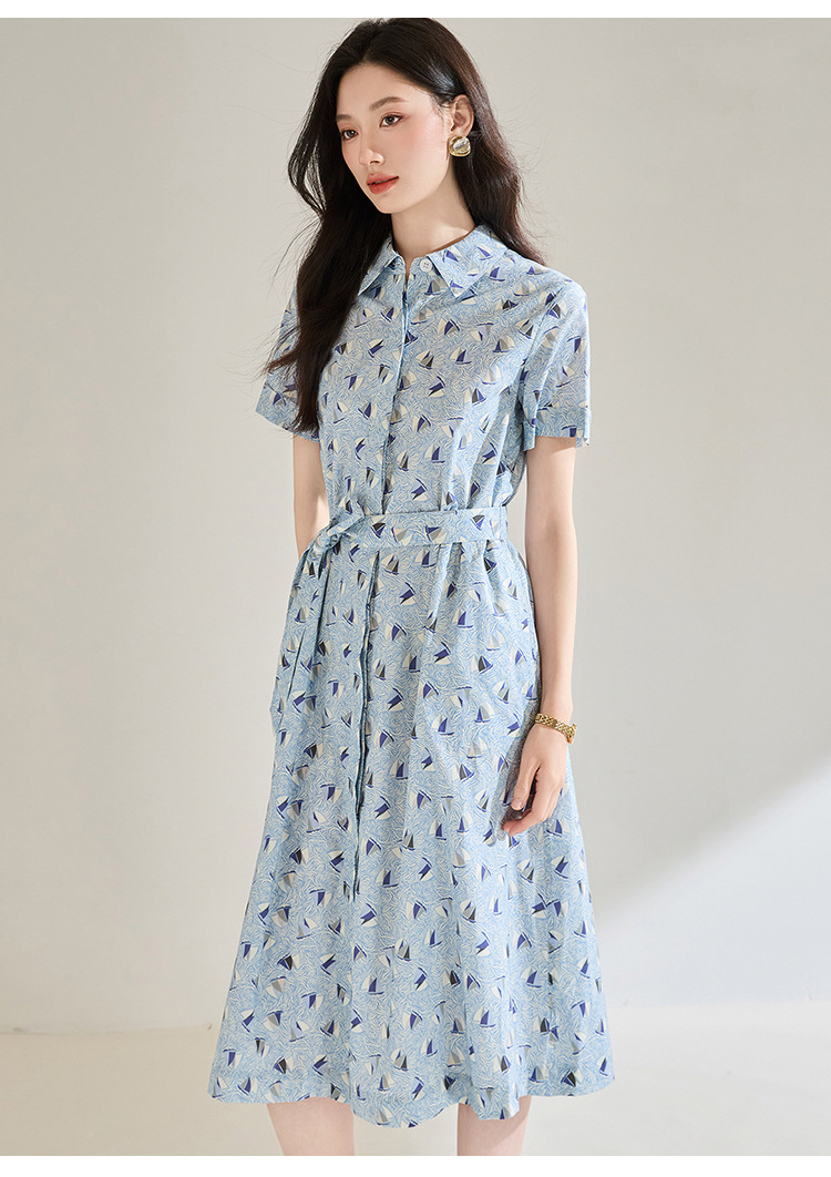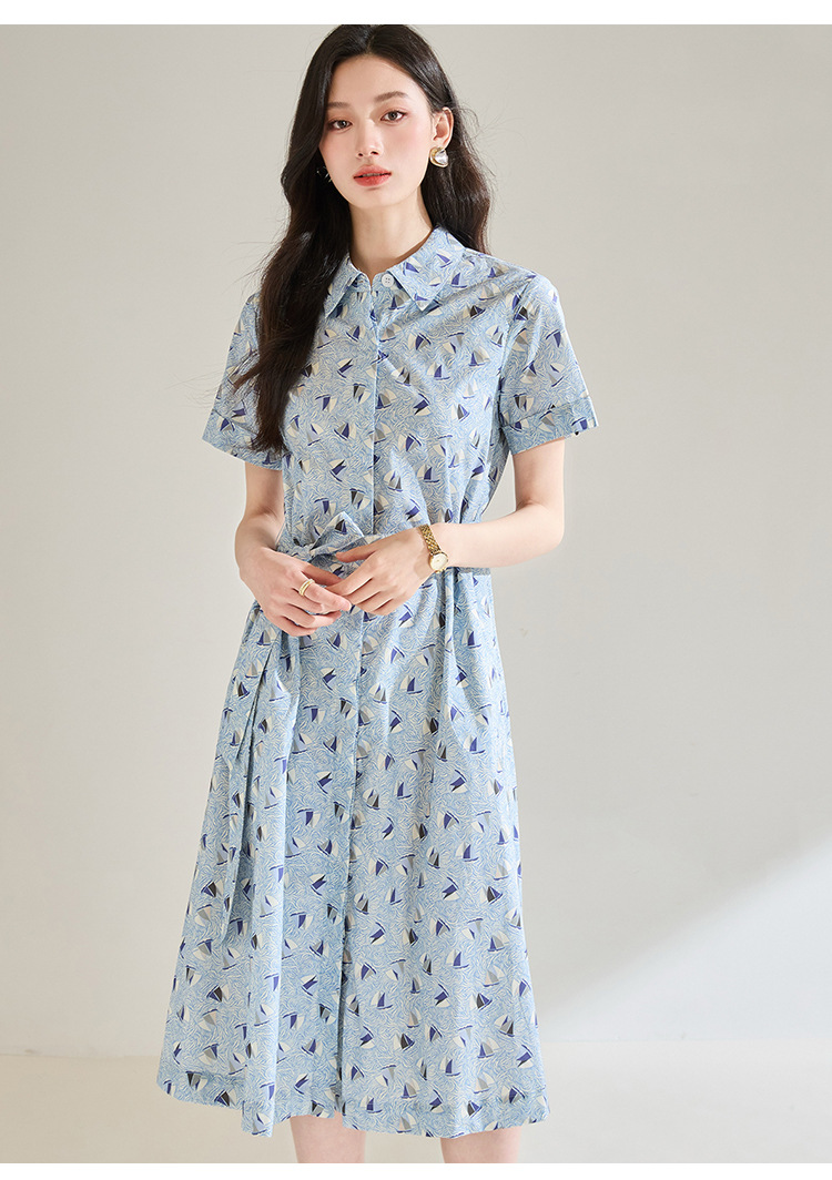 百媚生 夏季抗皱全棉印花蓝色帆船圆领长款连衣裙18830