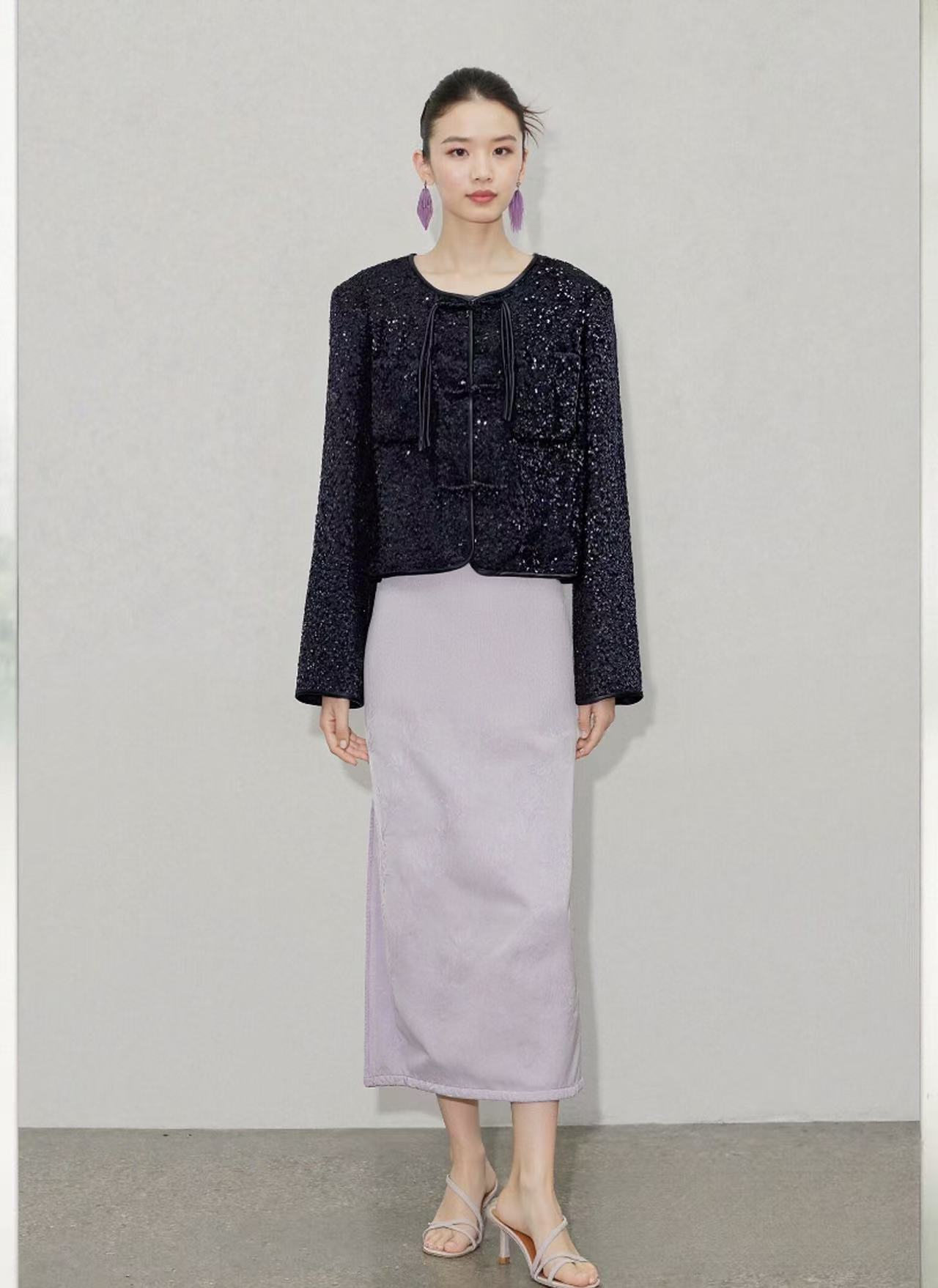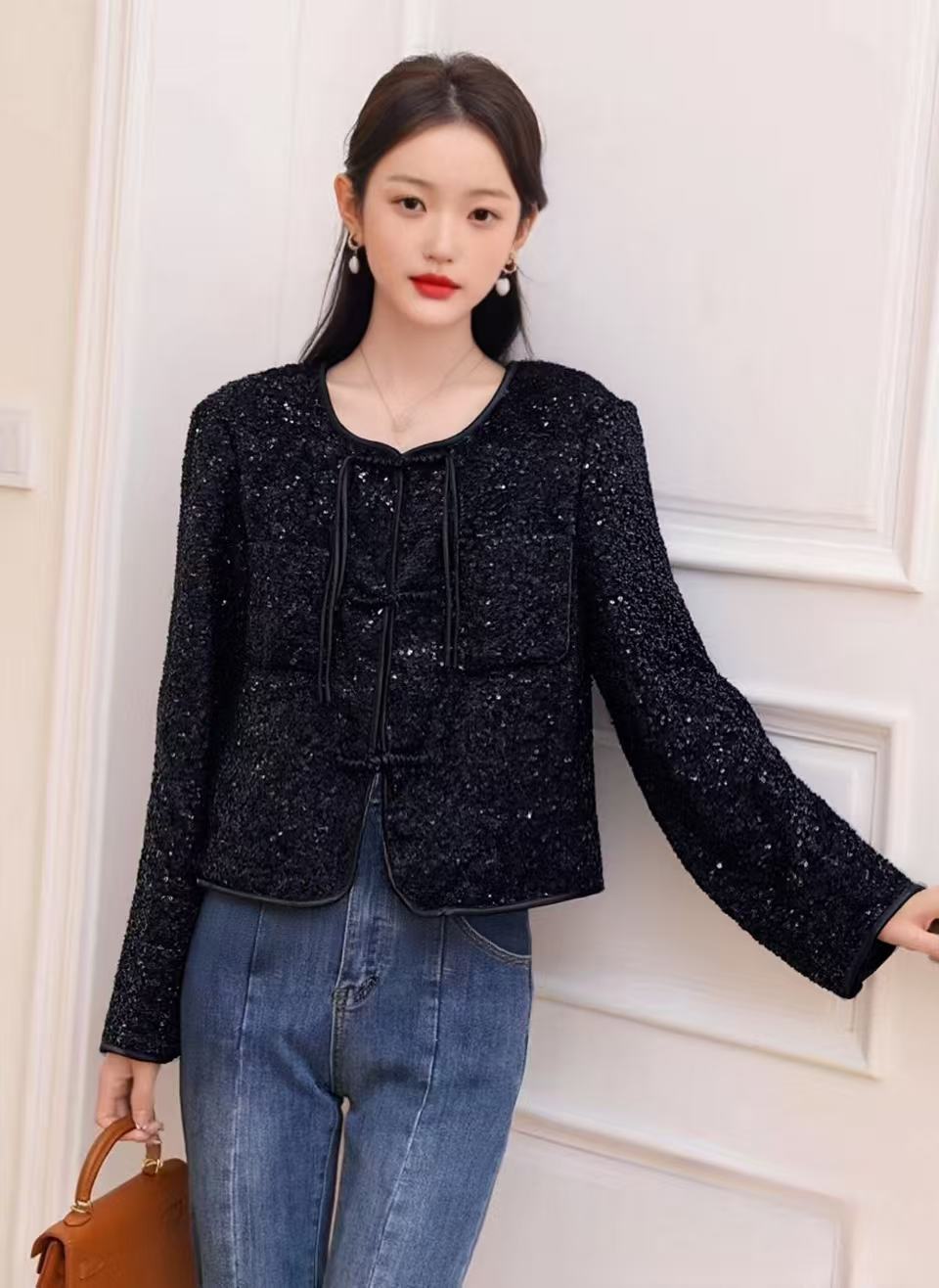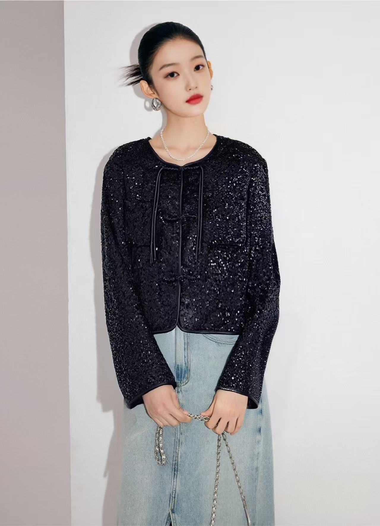 重工亮片外套!!28661圆领新中式盘扣亮片短款外套-喜出