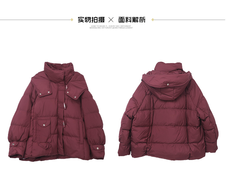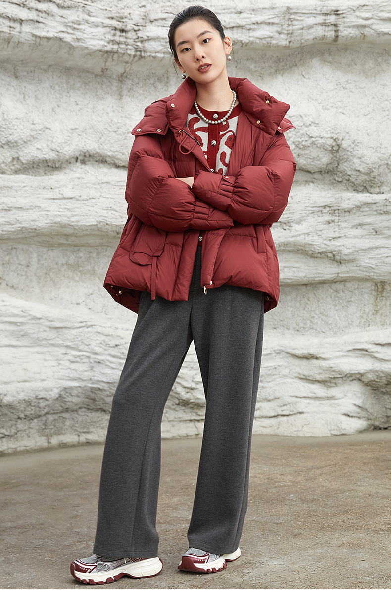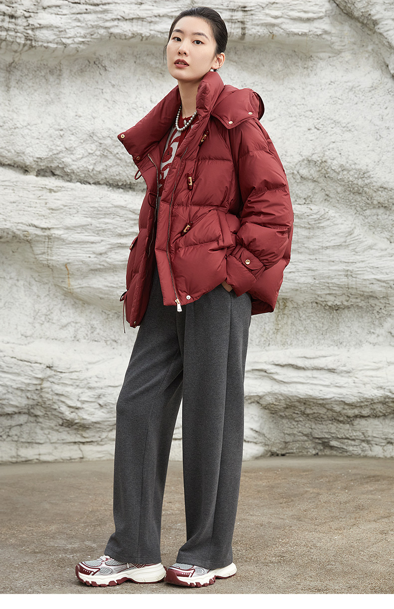 【冬季保暖神器】复古酒红色短款羽绒服女 连帽不可拆卸 90 白鸭绒填充 宽松显瘦面包服 防风抗寒外套