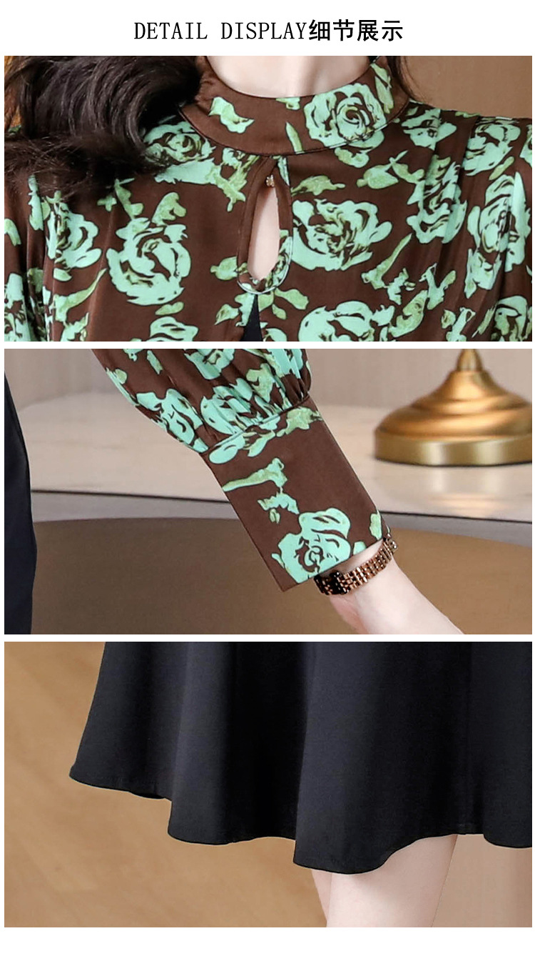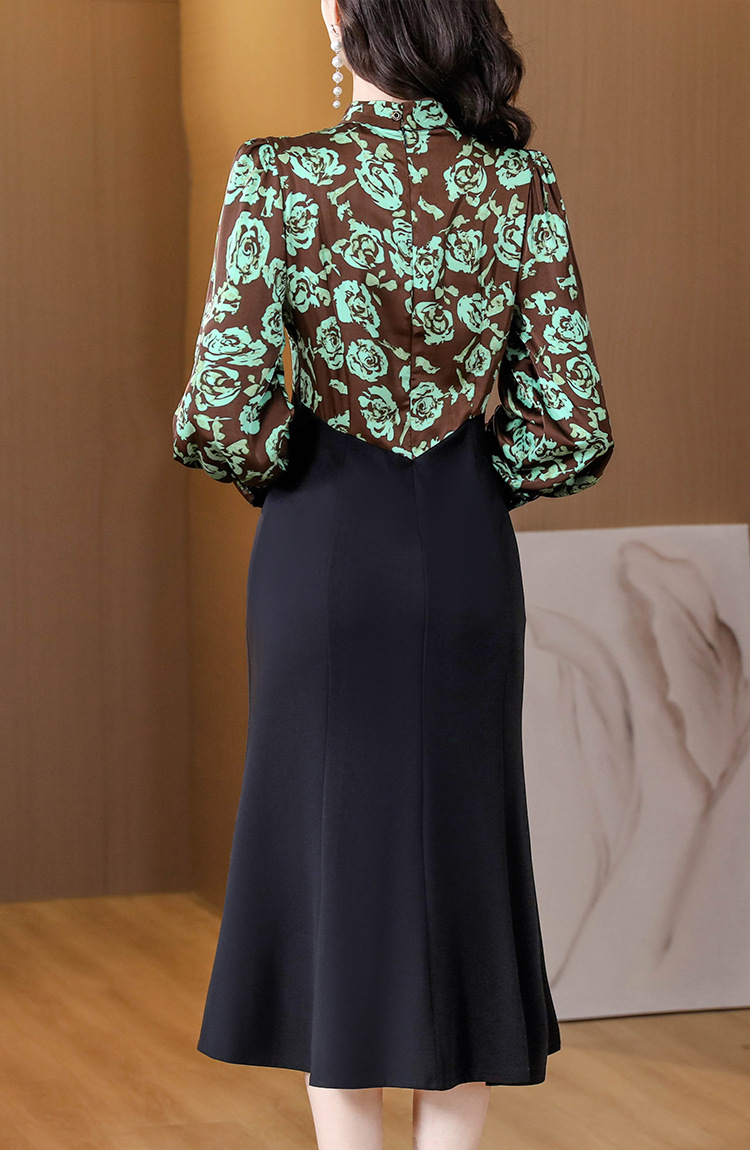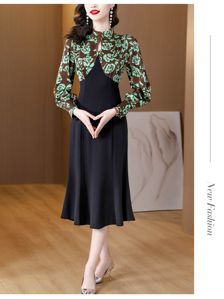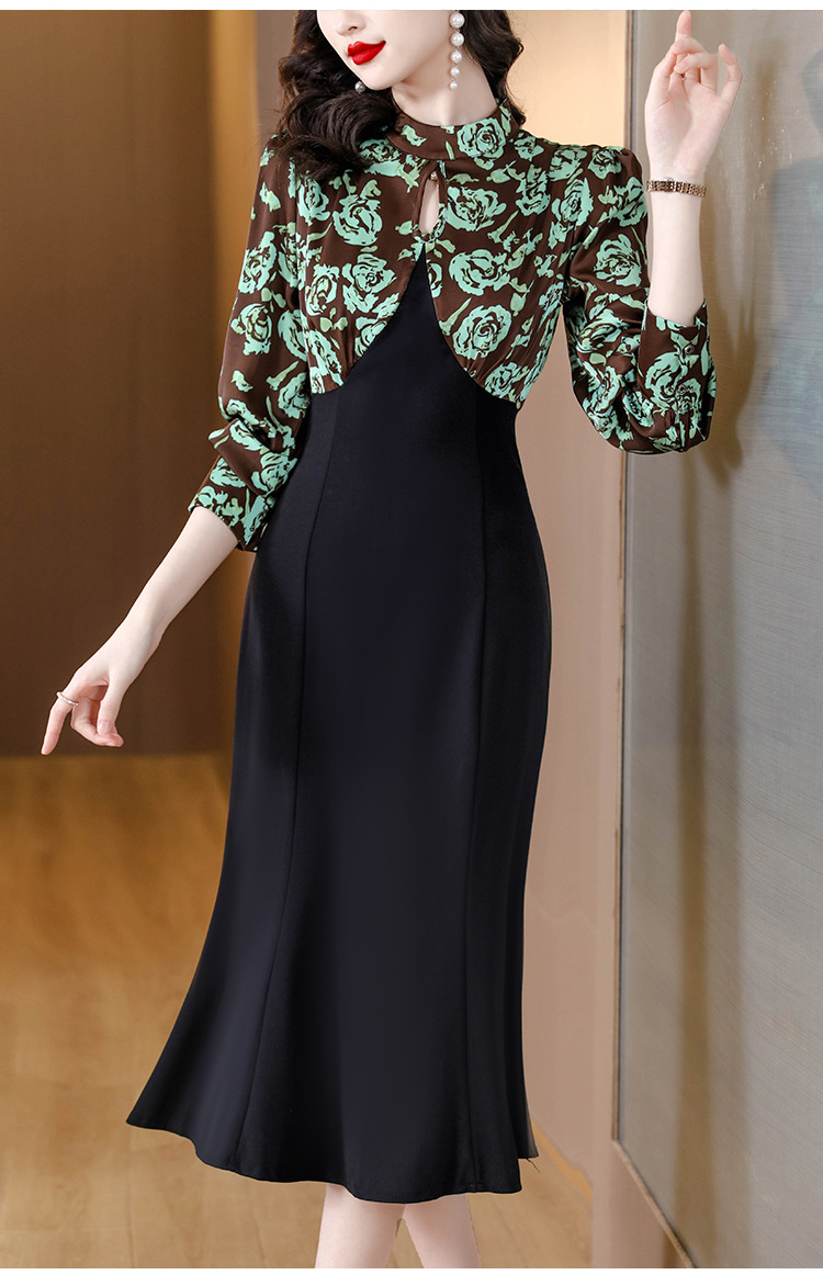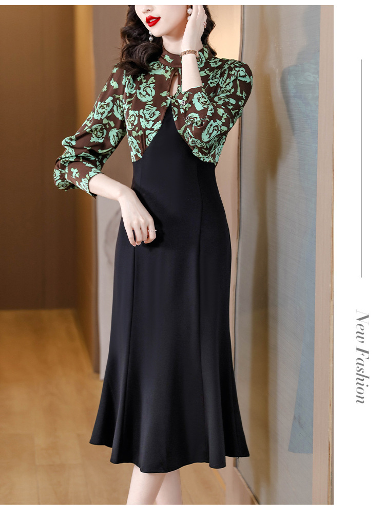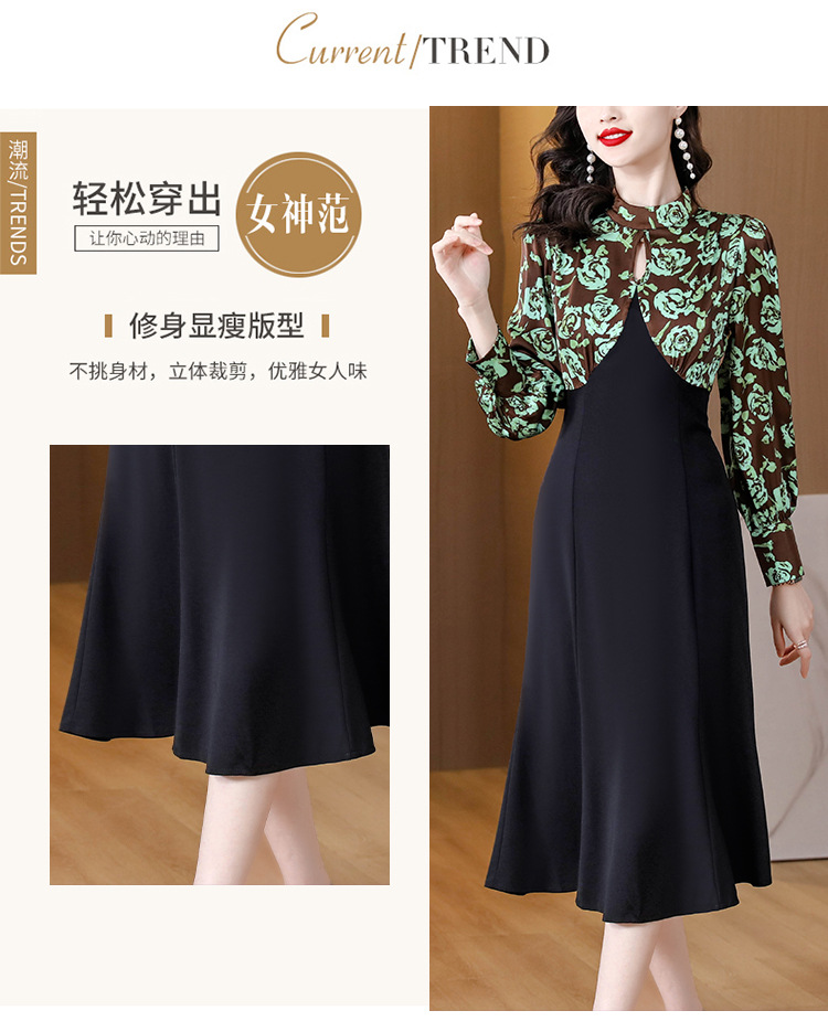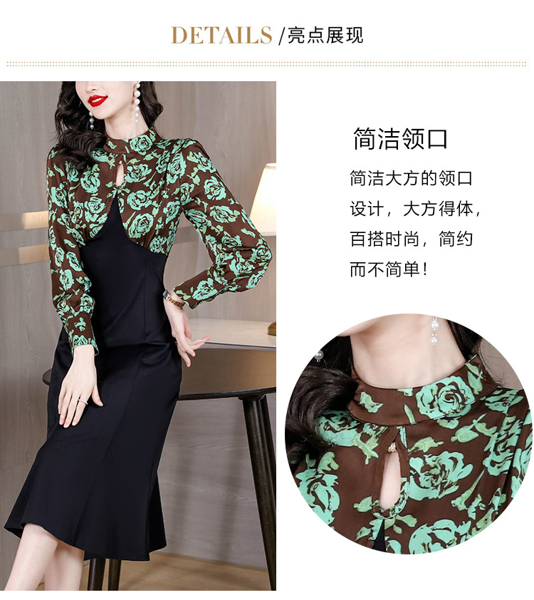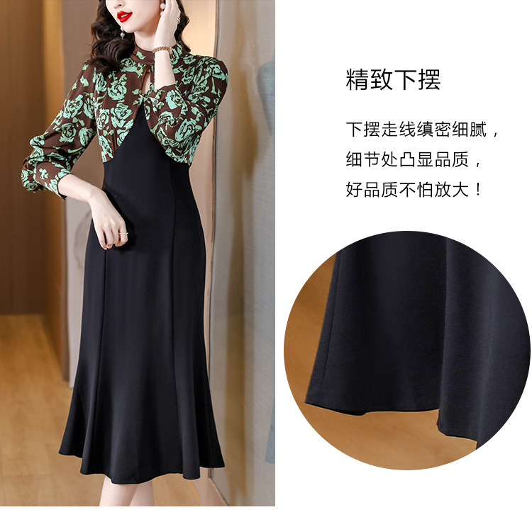 AHMhxyr8023大码印花真丝连衣裙女2023春季新款复古优雅圆领盘扣假两件鱼尾裙 商品图2