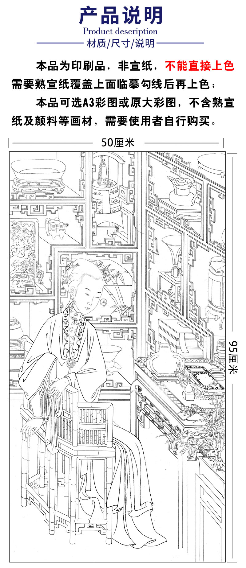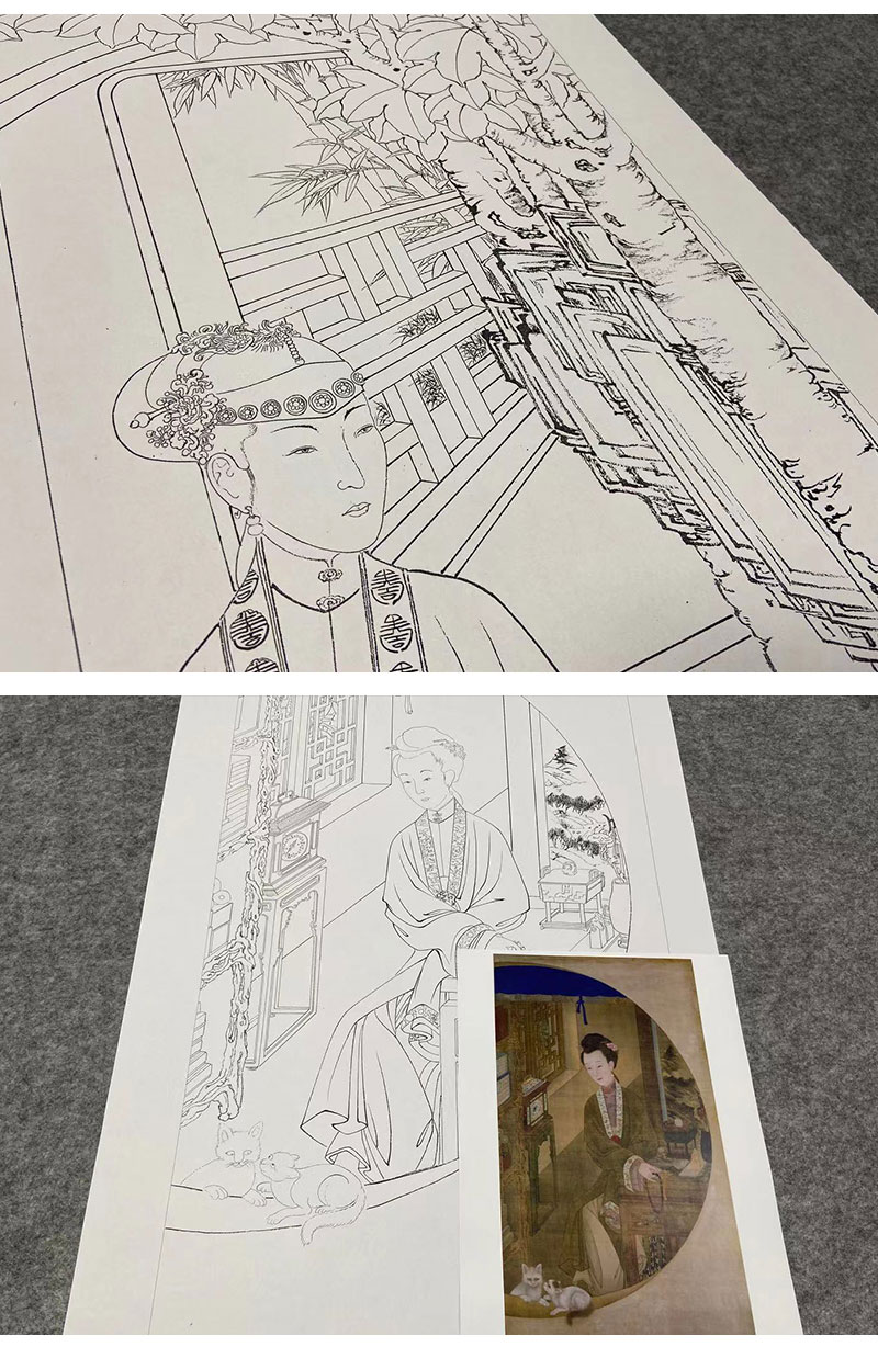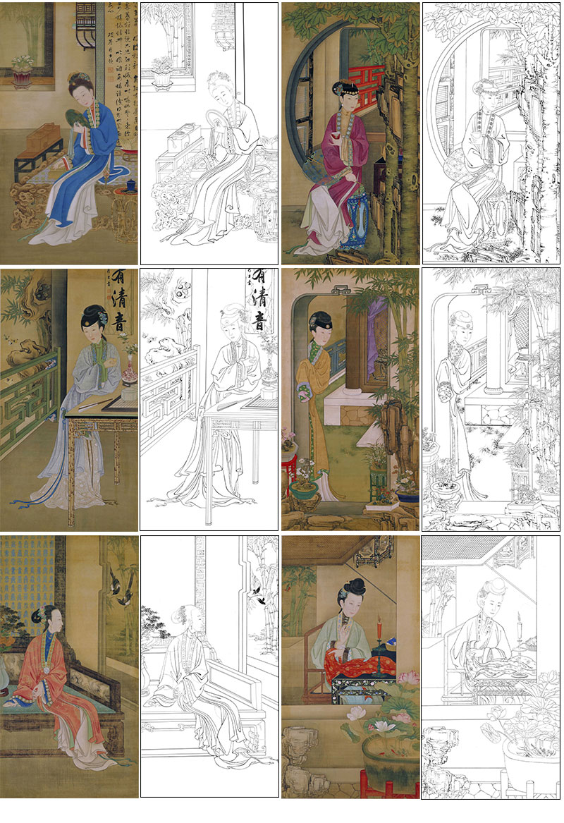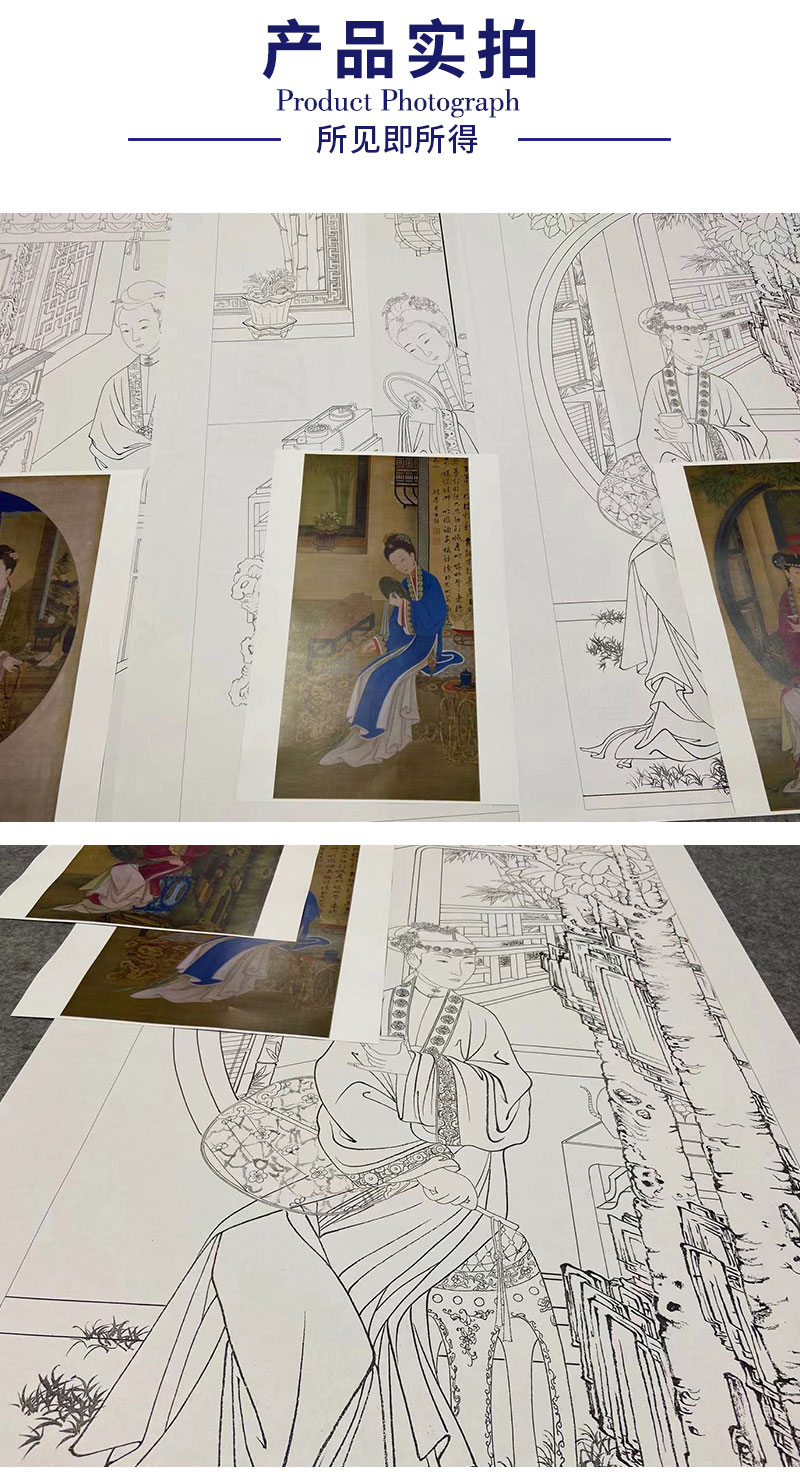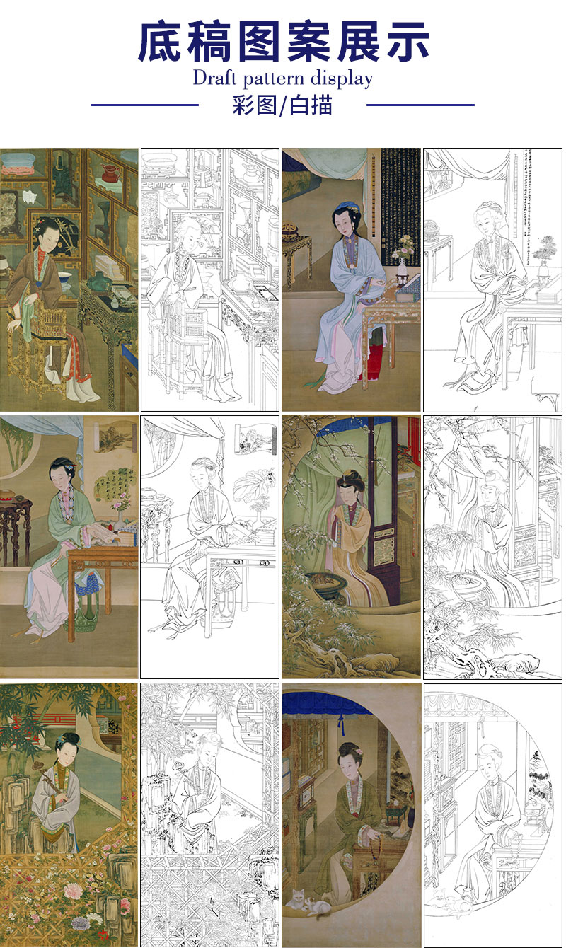 佚名工笔传统仕女人物画白描底稿正题书堂深居图一套十二幅册页尺寸50*95厘米MT21