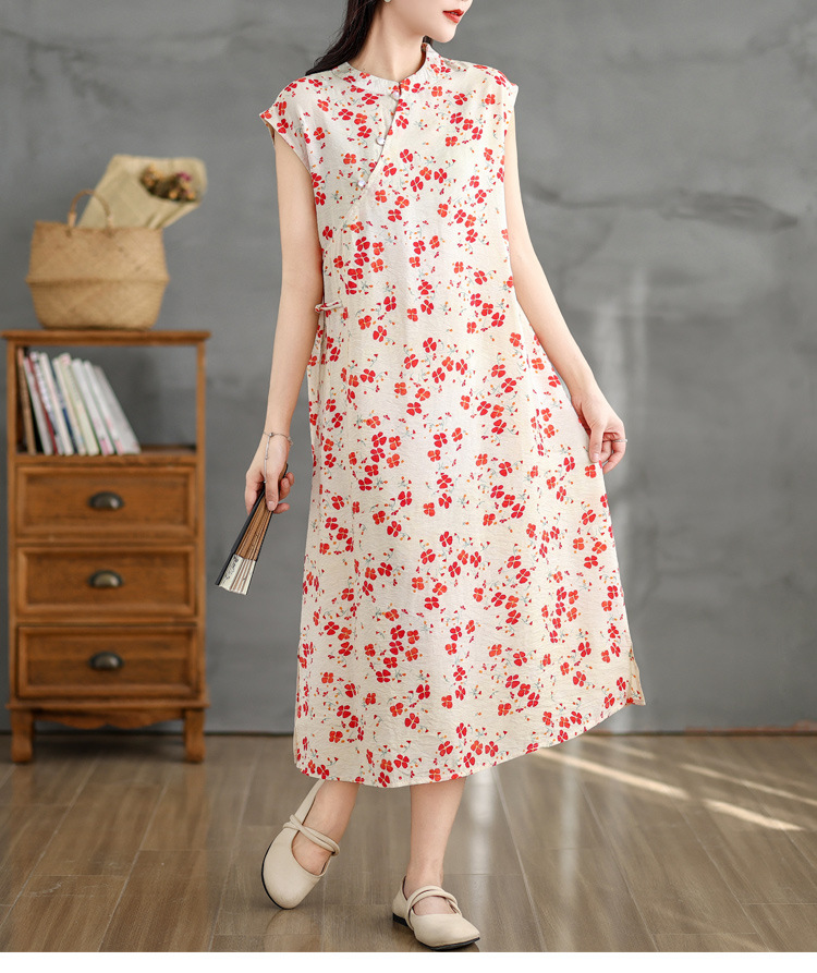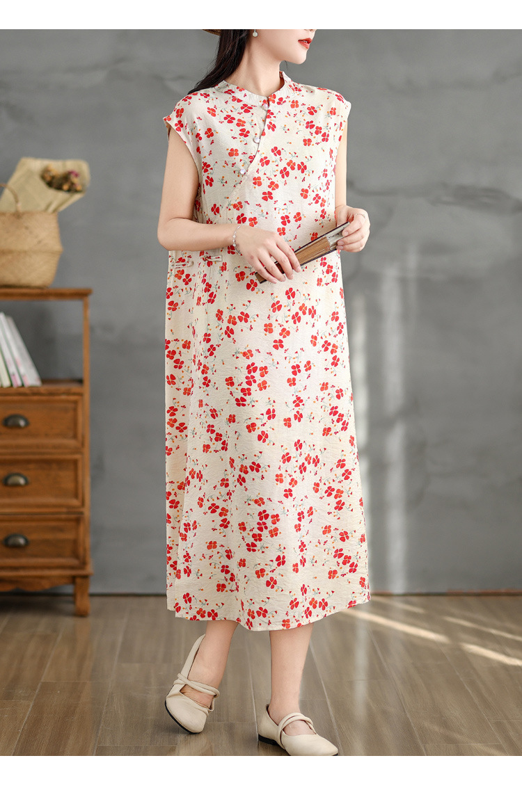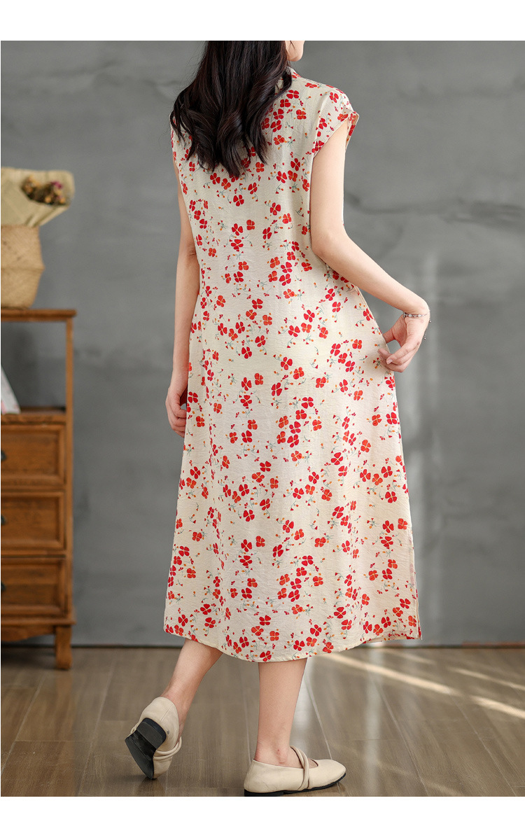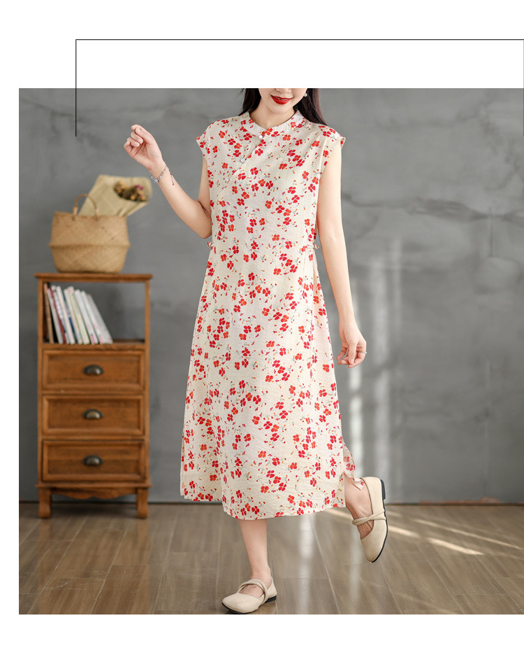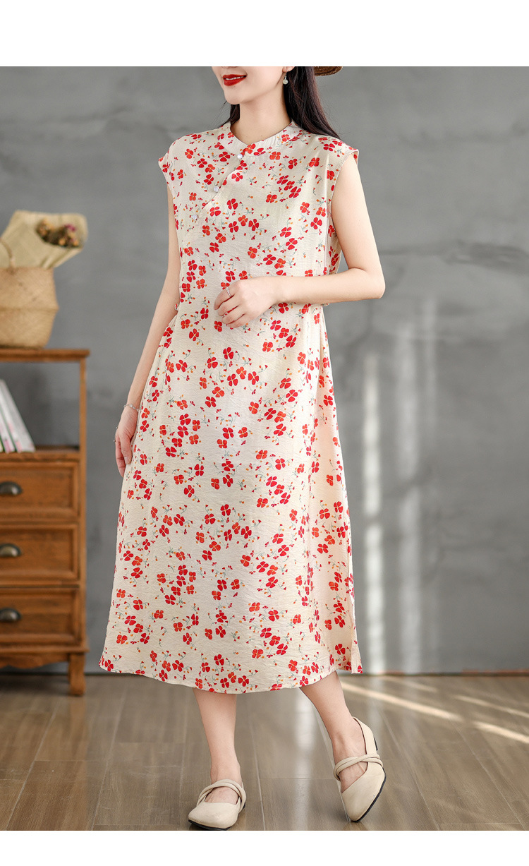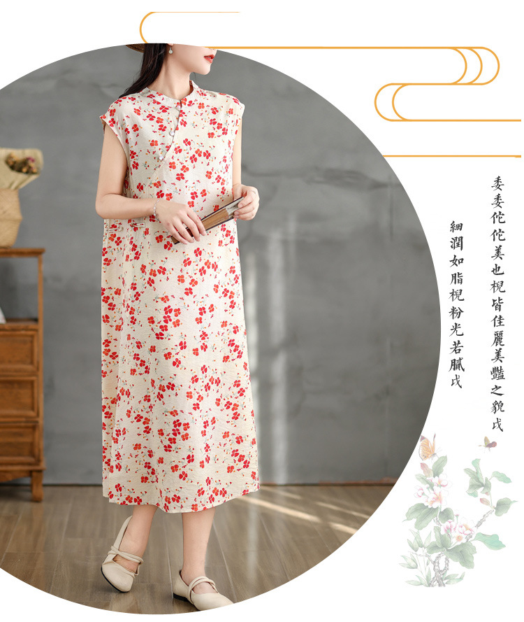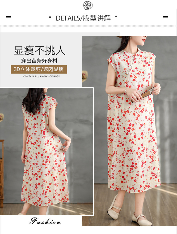 棉绸连衣裙女夏装大码阔太太妈妈装印花过膝大摆长裙