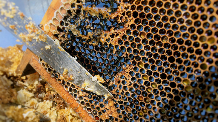 成熟蜂蜜会有一层蜜蜡在蜜巢上,在取蜜之前要先把蜜蜡削掉,这样在蜂巢中自然成熟的蜜又叫“封盖蜜”,我们是这种。