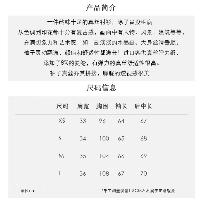 牛货,实物美爆了,GAO端小众纯尾,一线代工厂出,数码印花真丝弹力缎面料,袖子轻柔真丝乔其,花边领小宽松版型,袖口也做了荷边花边装饰,圆弧下摆前短后长设计,精致小包扣装饰,做工细节无可挑剔,低调有气质的一件美衣。