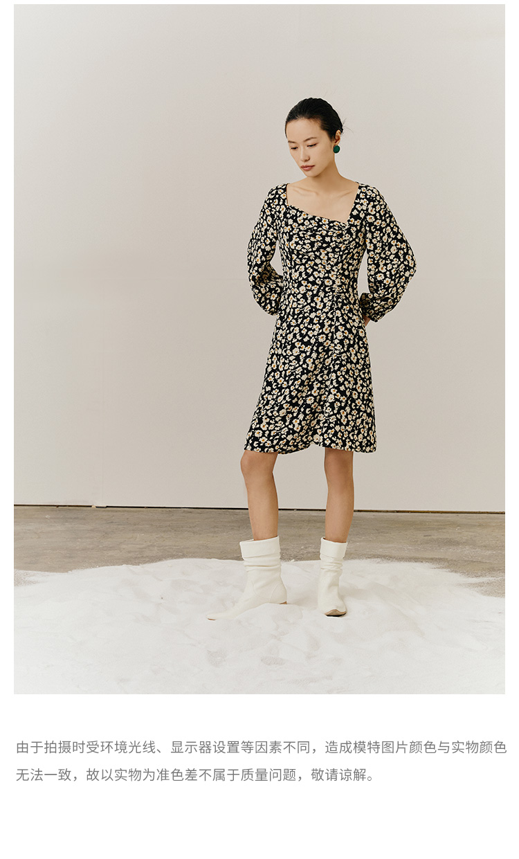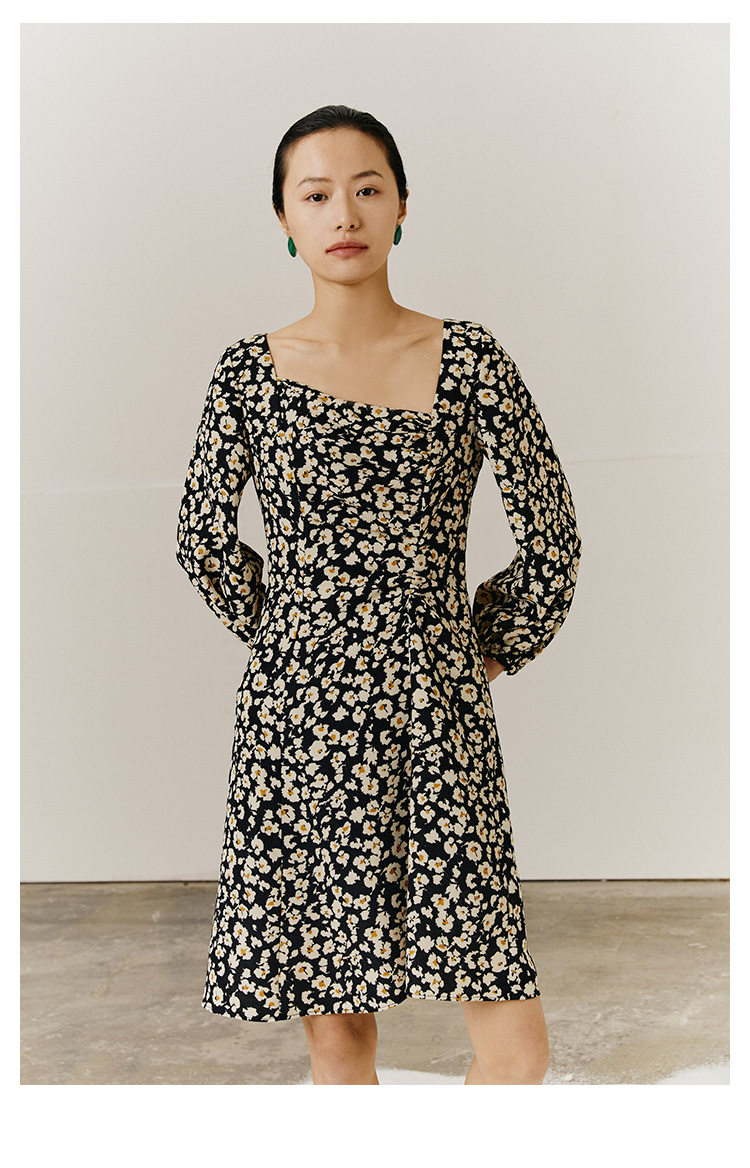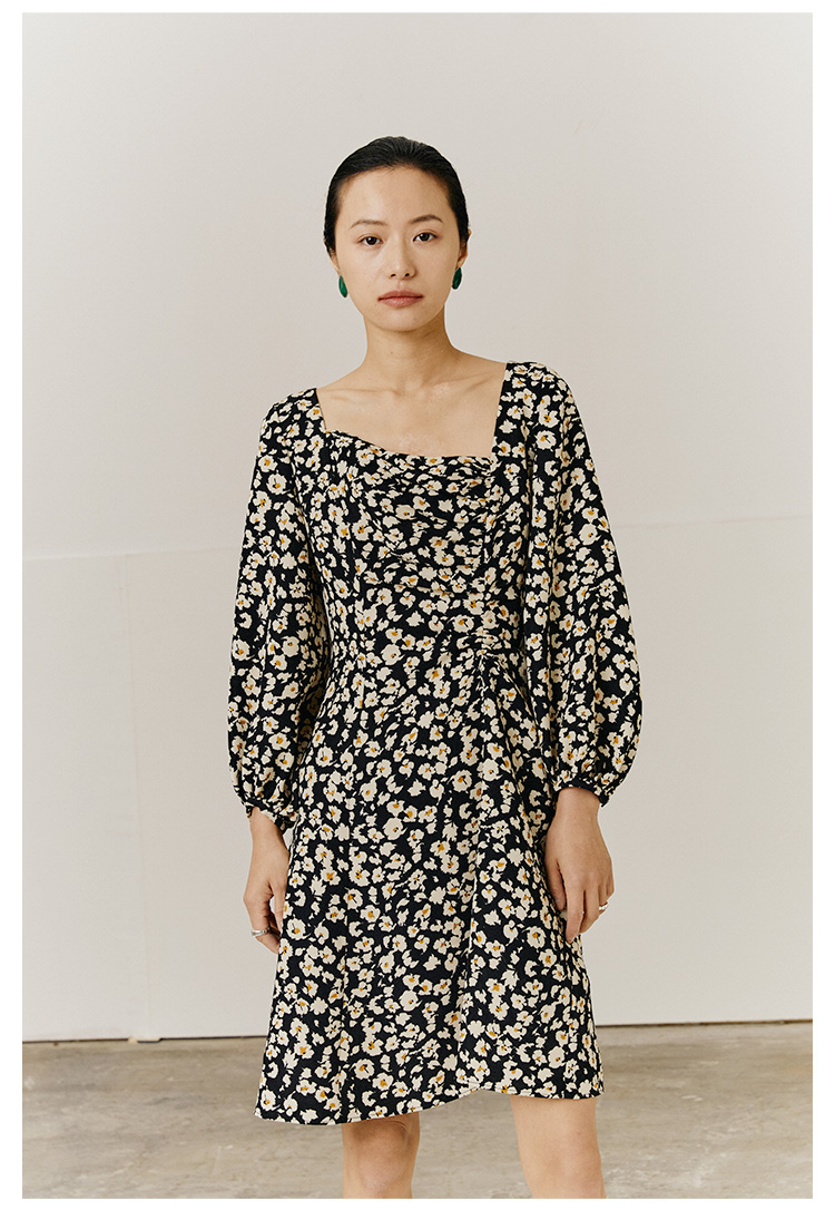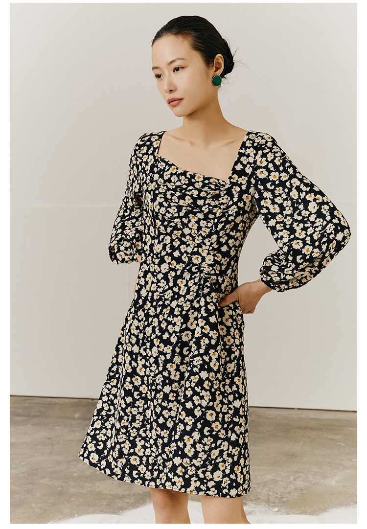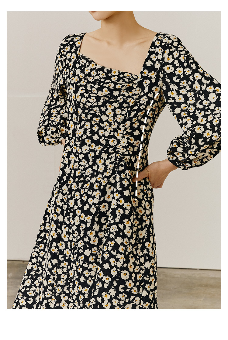 HeyDress斜领碎花连衣裙女抽褶显瘦设计感中长款裙子