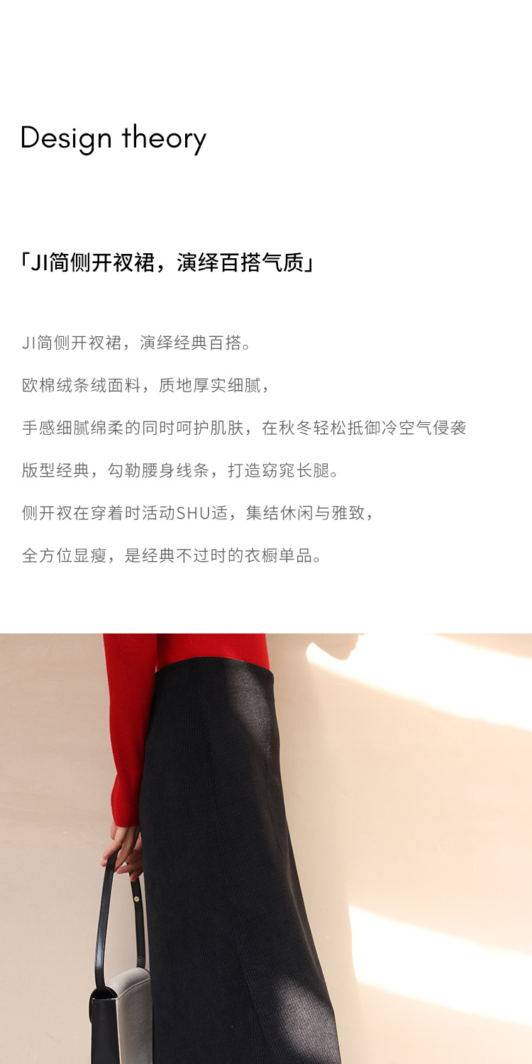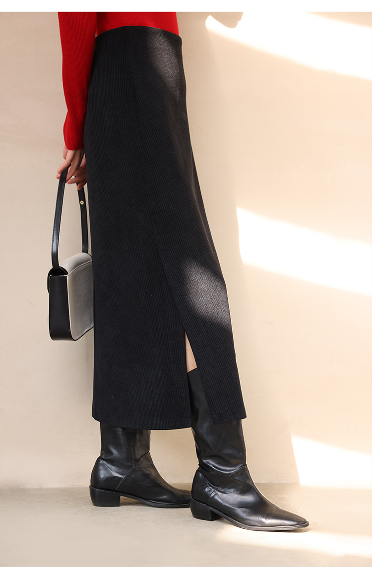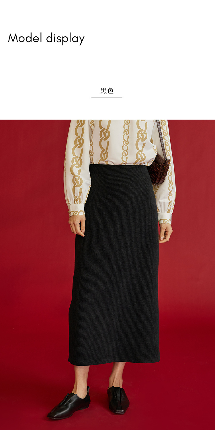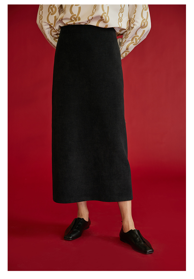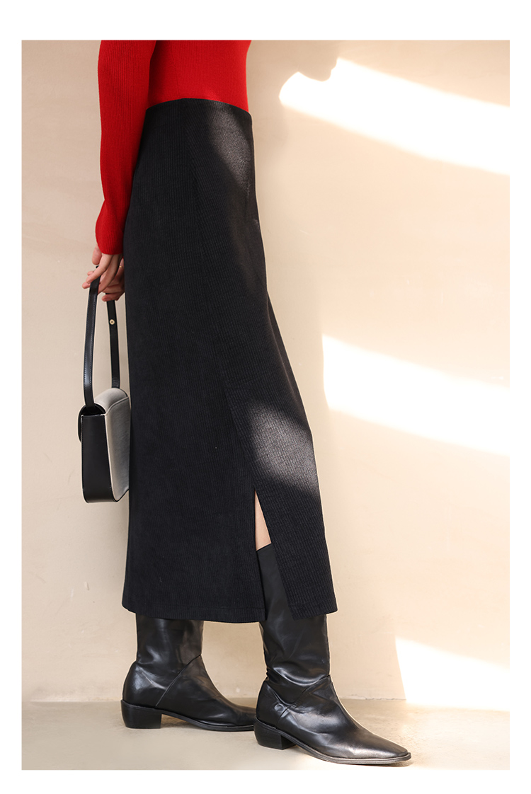 HeyDress黑色欧棉绒半身裙女秋冬法式复古高腰显瘦开叉直筒半裙