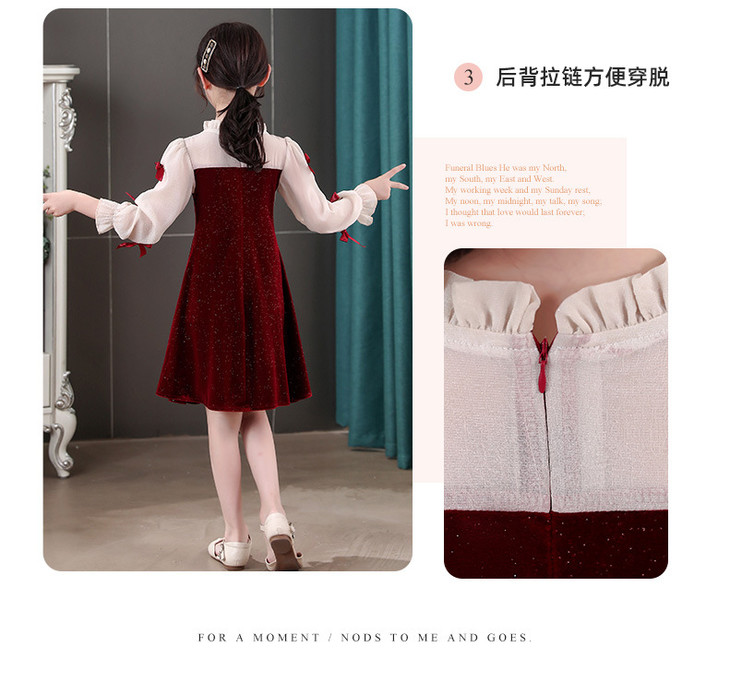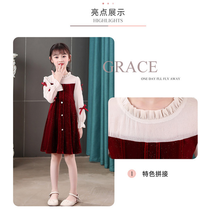 甜美洋气女童连衣裙,金丝绒长袖拼接蕾丝蝴蝶结儿童裙XWN-2520