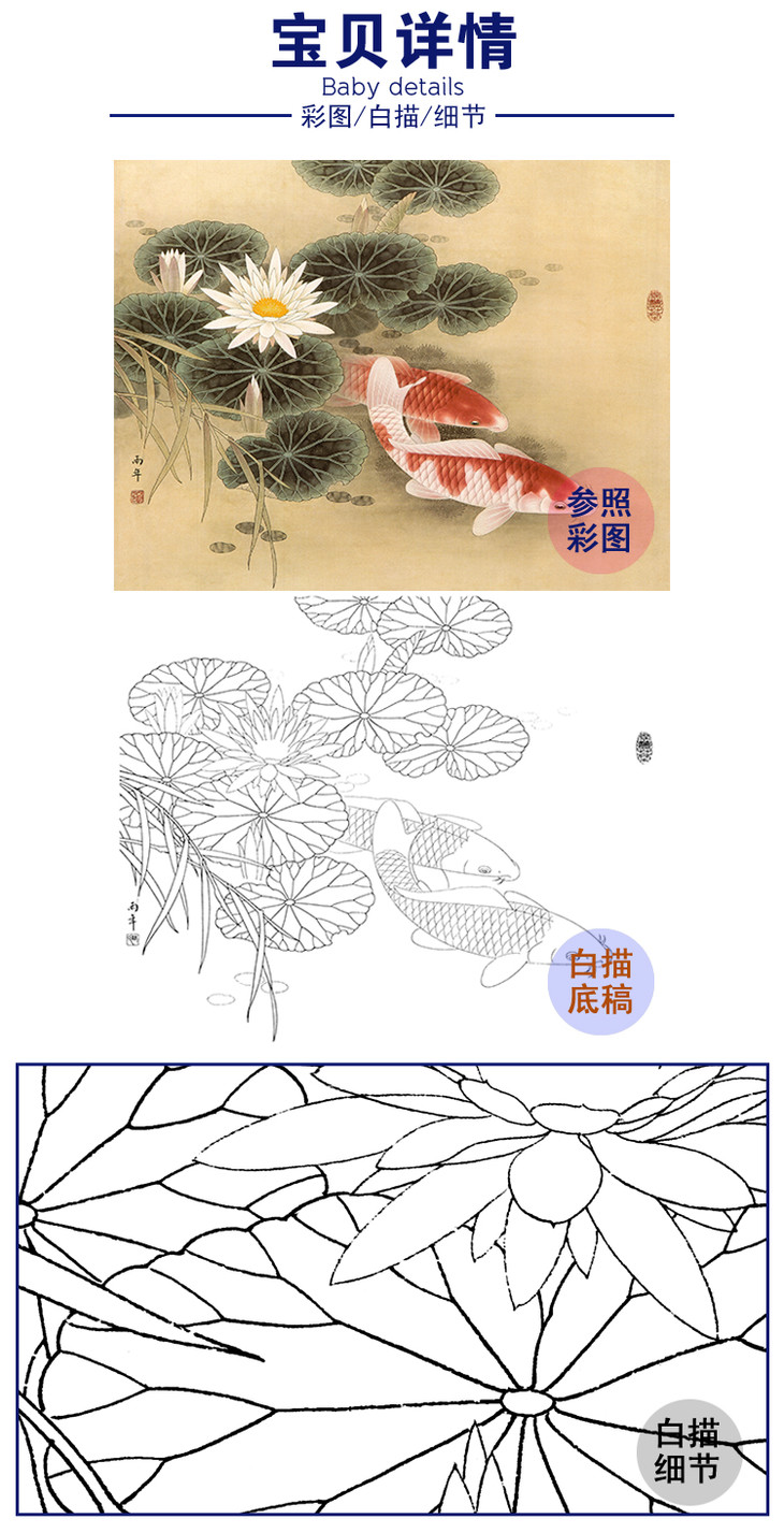 工笔花鸟白描底稿-路雨年-荷花鲤鱼-斗方小品册页-A247