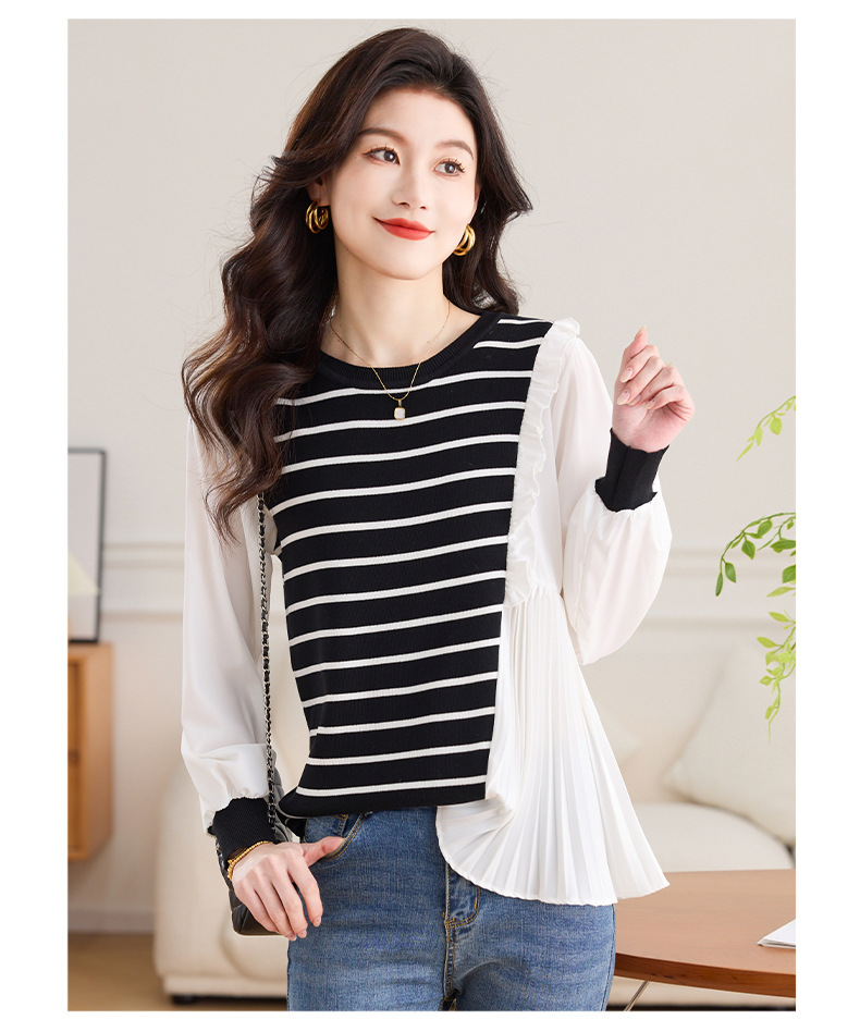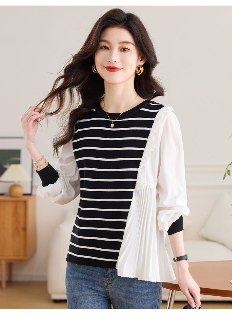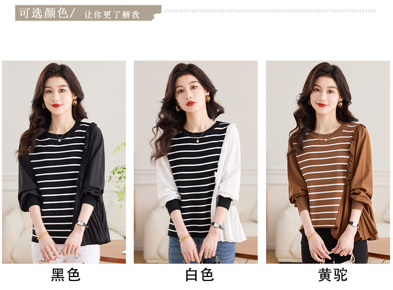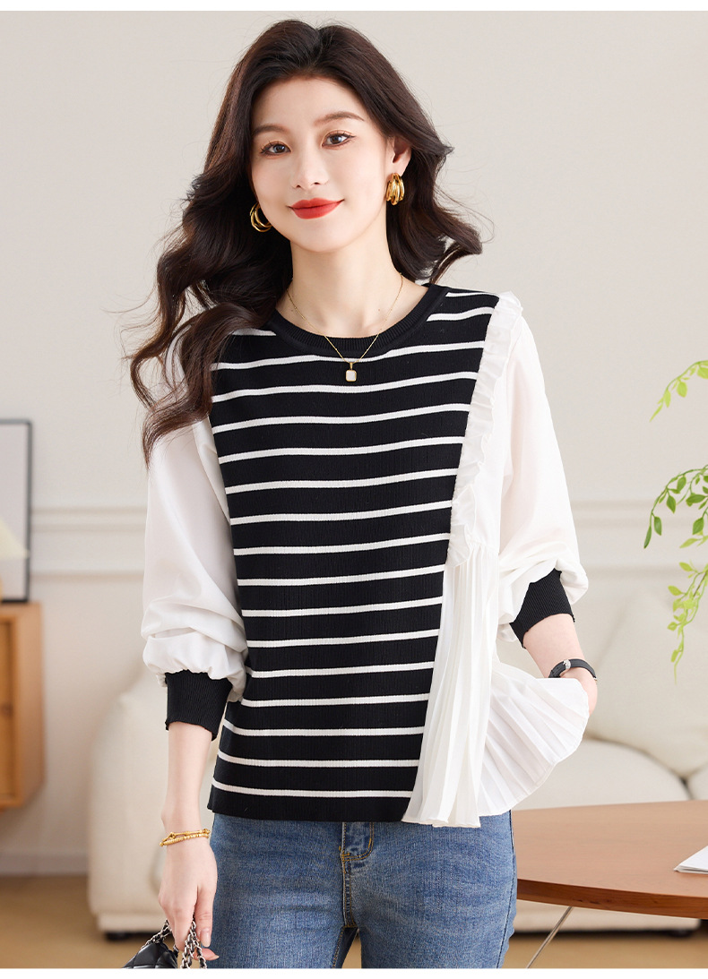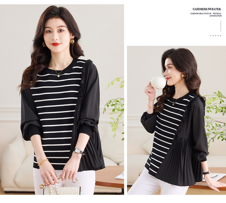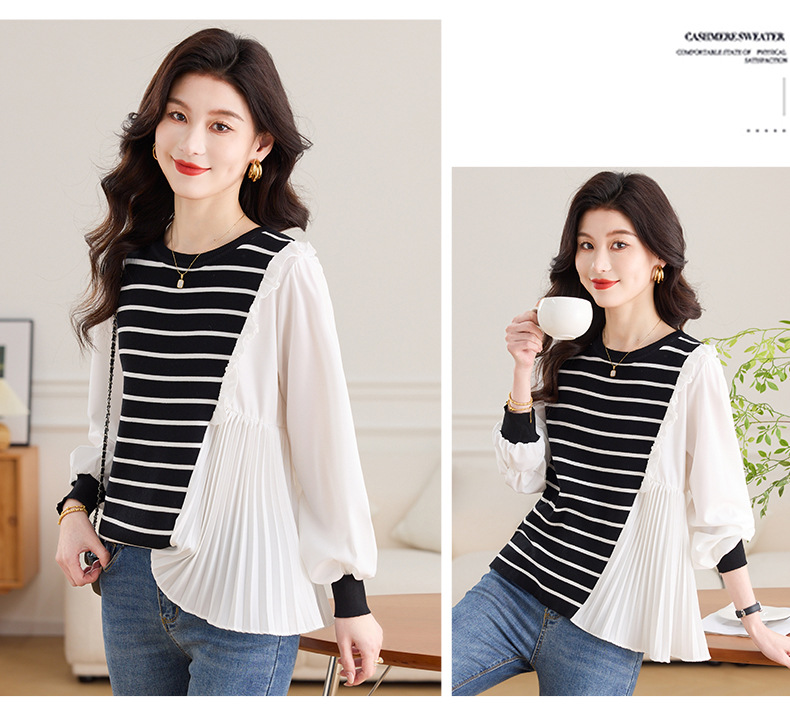 CC-13-2802假两件黑白条纹针织拼接衬衫女士长袖2025春秋季新款宽松遮肉上衣