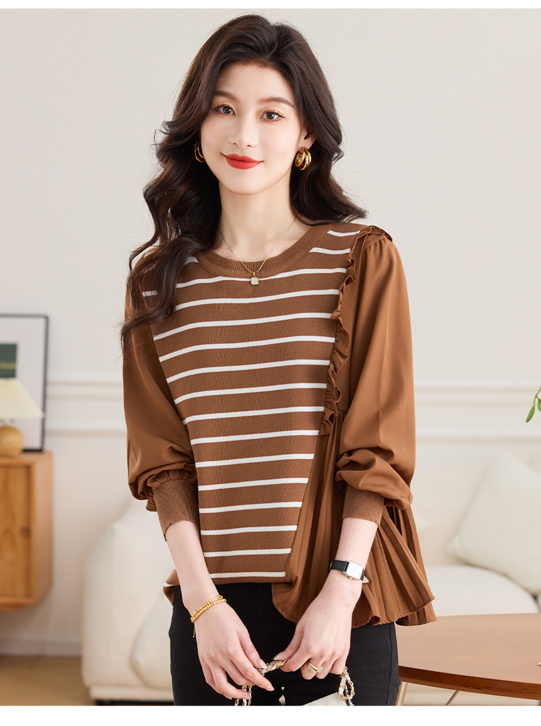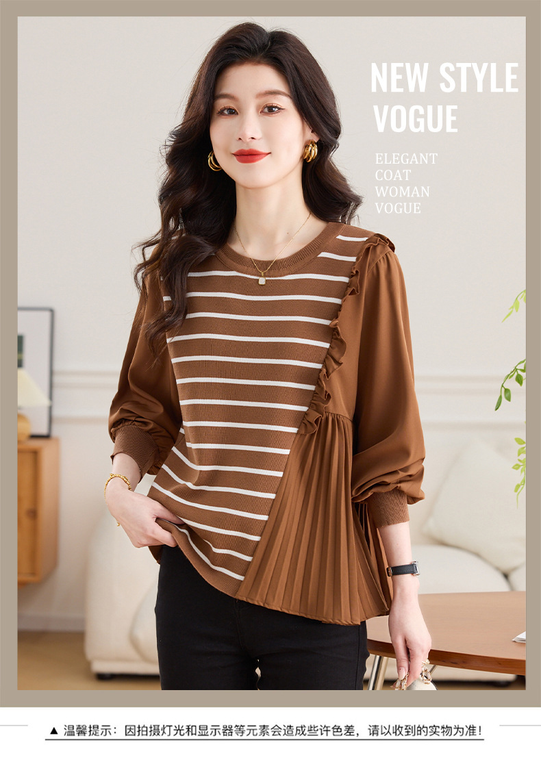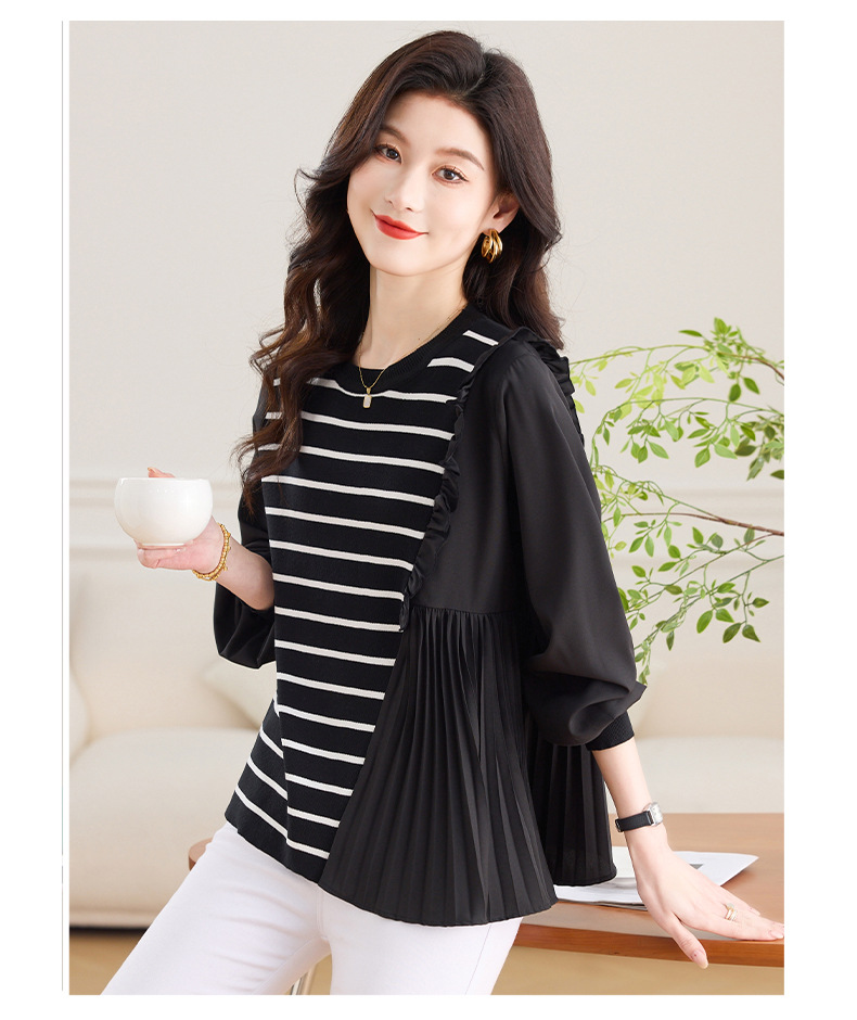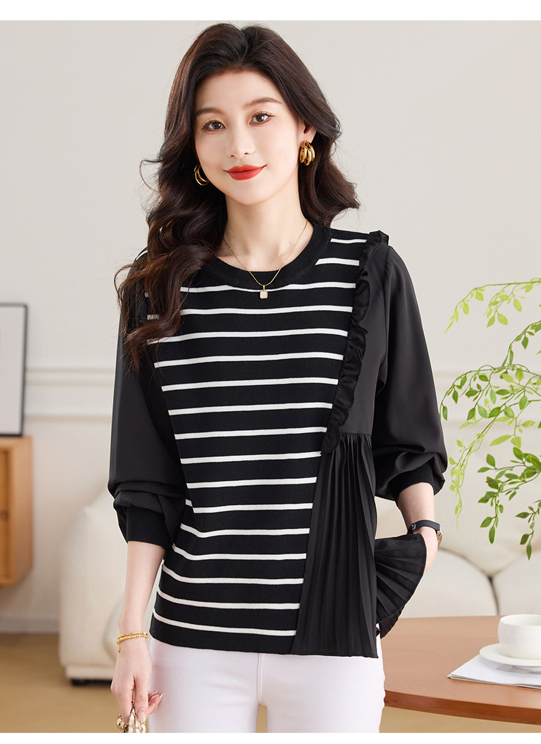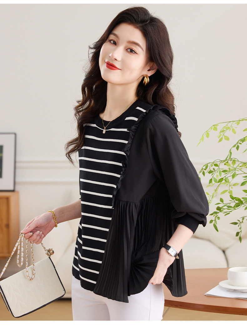 CC-13-2802假两件黑白条纹针织拼接衬衫女士长袖2025春秋季新款宽松遮肉上衣