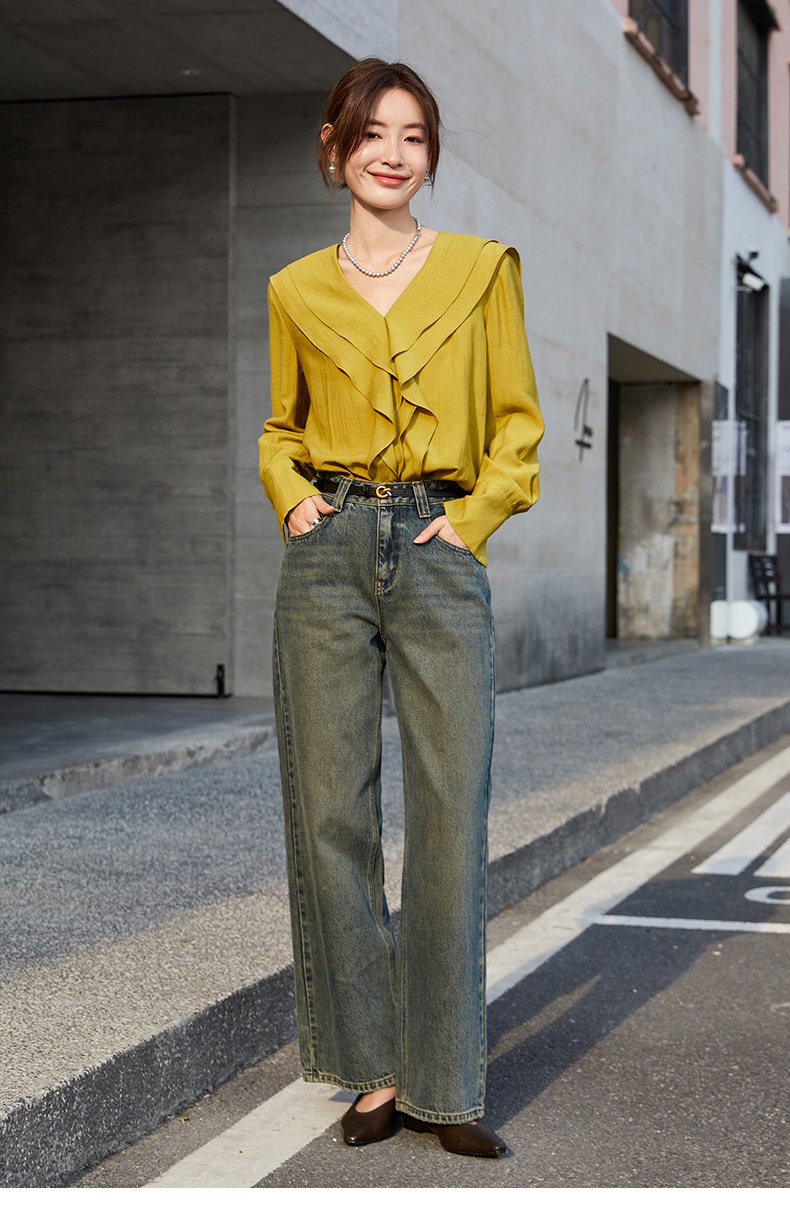 亮眼姜黄色 V 领衬衫!荷叶边设计 小众又时髦