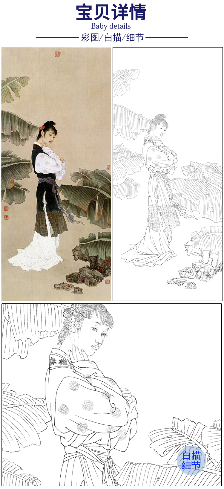 王美芳竖幅工笔传统仕女人物白描底稿《解语花之一》-多种白描尺寸可选-B175