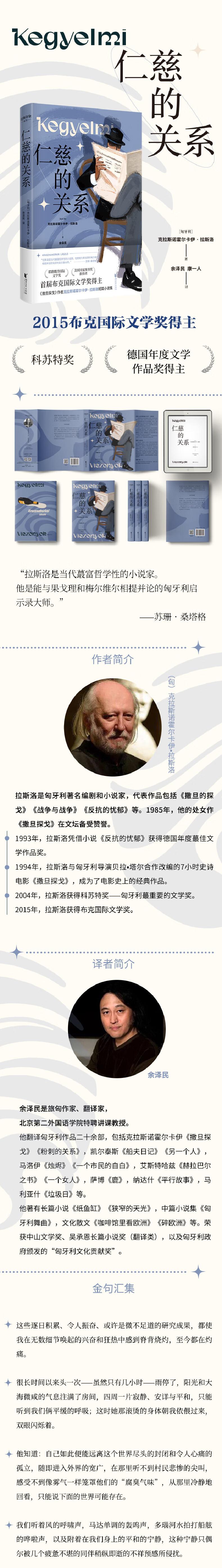 《仁慈的关系》是匈牙利作家克拉斯诺霍尔卡伊•拉斯洛的中短篇小说集,收录了包括其代表作《茹兹的陷阱》《理发师的手》在内的八个故事。他的作品常常被归入后现代派小说,因为其句型结构怪异,地点含糊,意思难以捉摸,情节跳跃性极强,结构常常呈放射性,叙事者总是模糊不清,结局充满神秘意味。除此之外,余泽民老师为作品所作的序也十分精彩,不仅详细讲述了作者的创作历程,也用基于自身经历的一手资料剖析了拉斯洛那近乎疯狂的“中国情结”,毫无疑问,这将拉近读者和作品之间的距离。