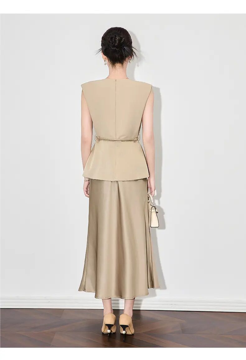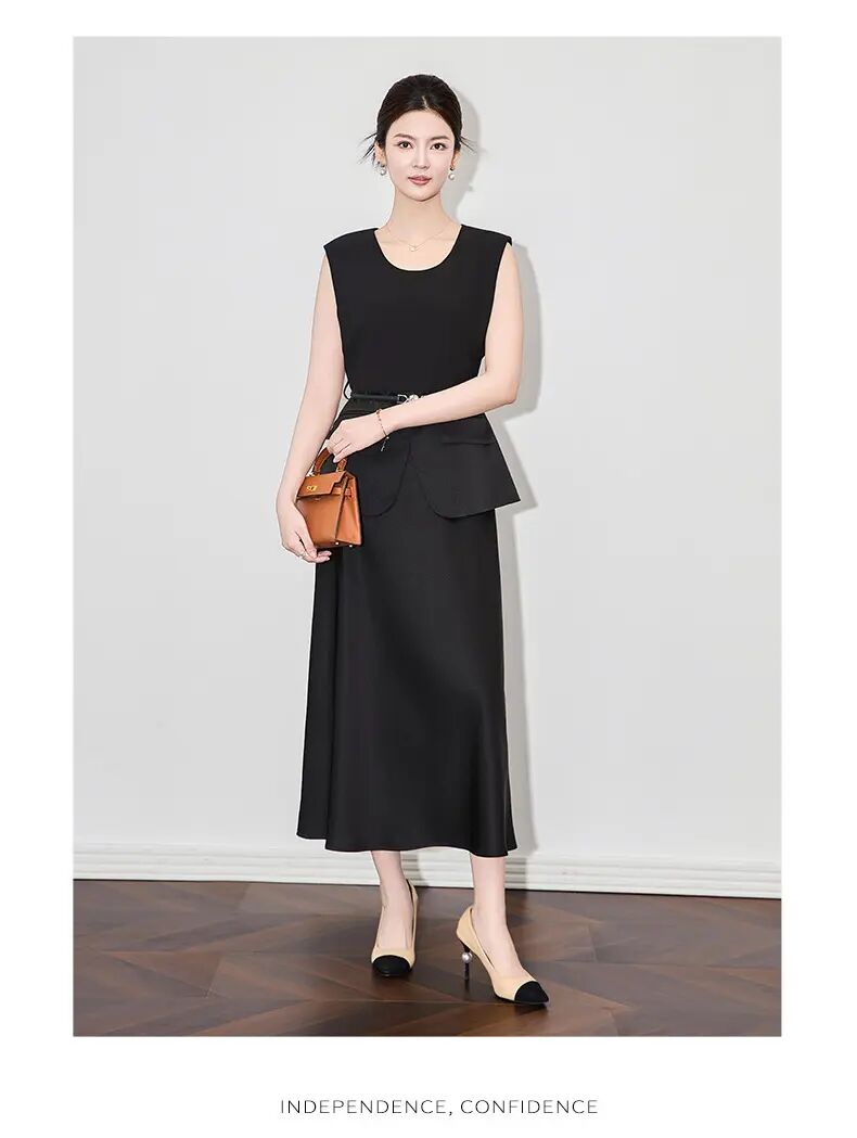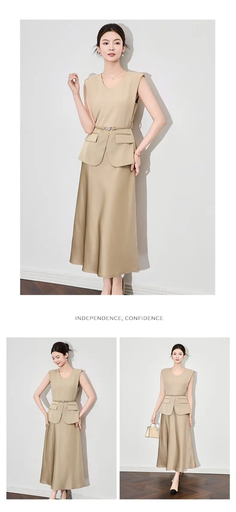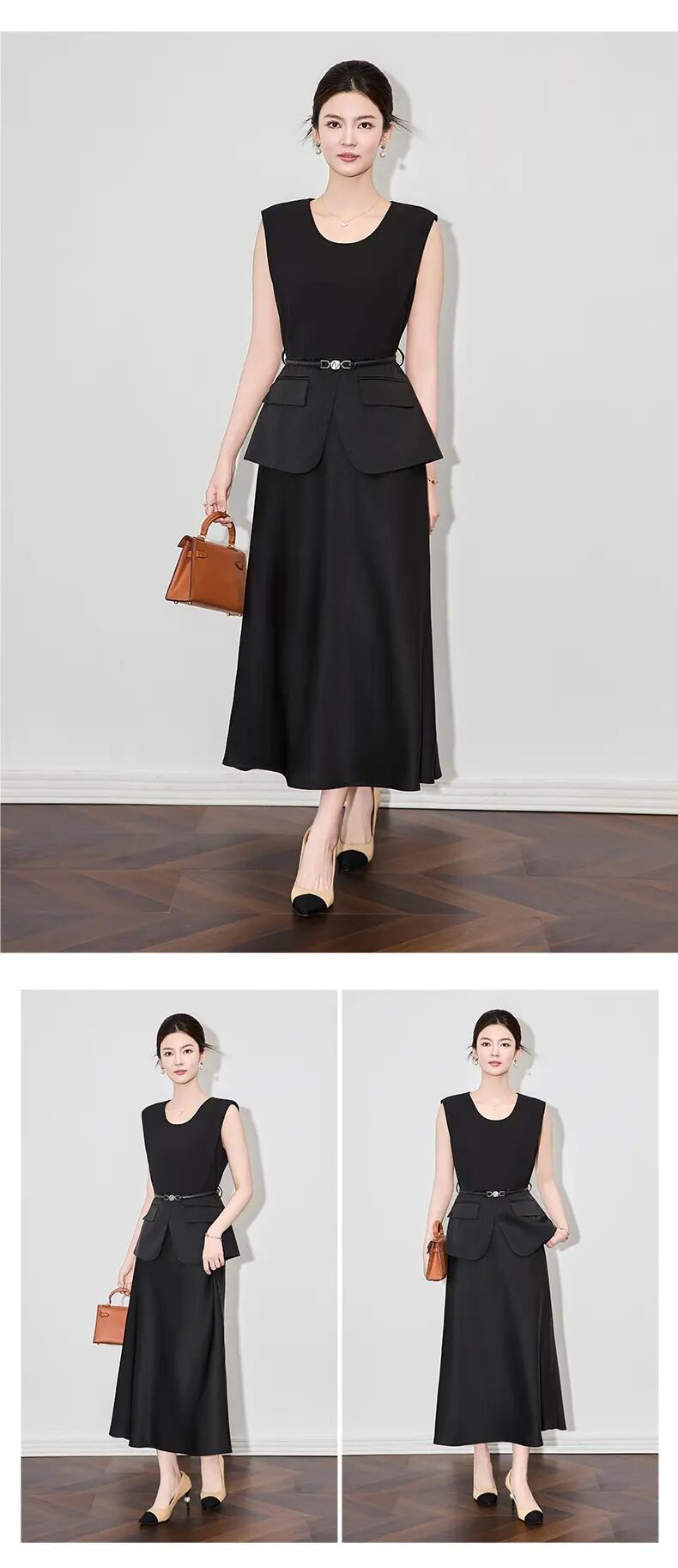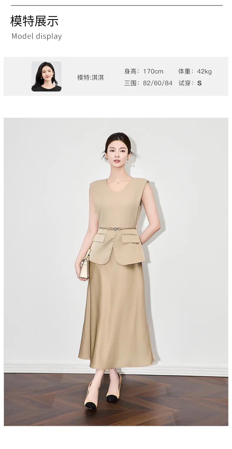 「高货wl」全新升级【铂金会员358/天猫479/差价121】(99513)洛诗琳轻熟风气质假两件连衣裙2025夏季无袖醋酸缎收腰裙子99513
