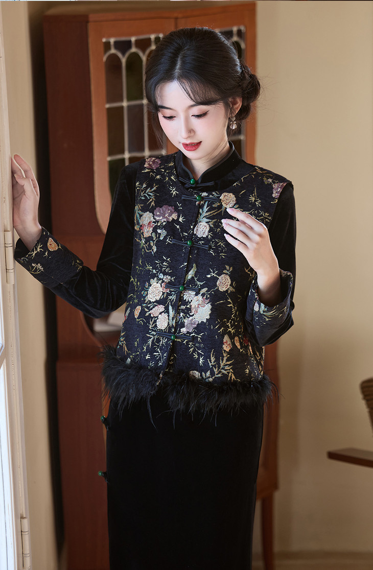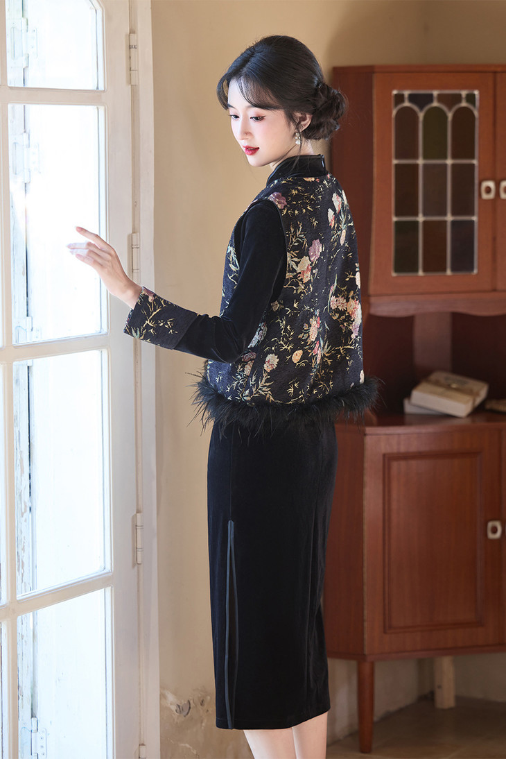 黑色丝绒国风新中式马甲长袖旗袍LSB4150