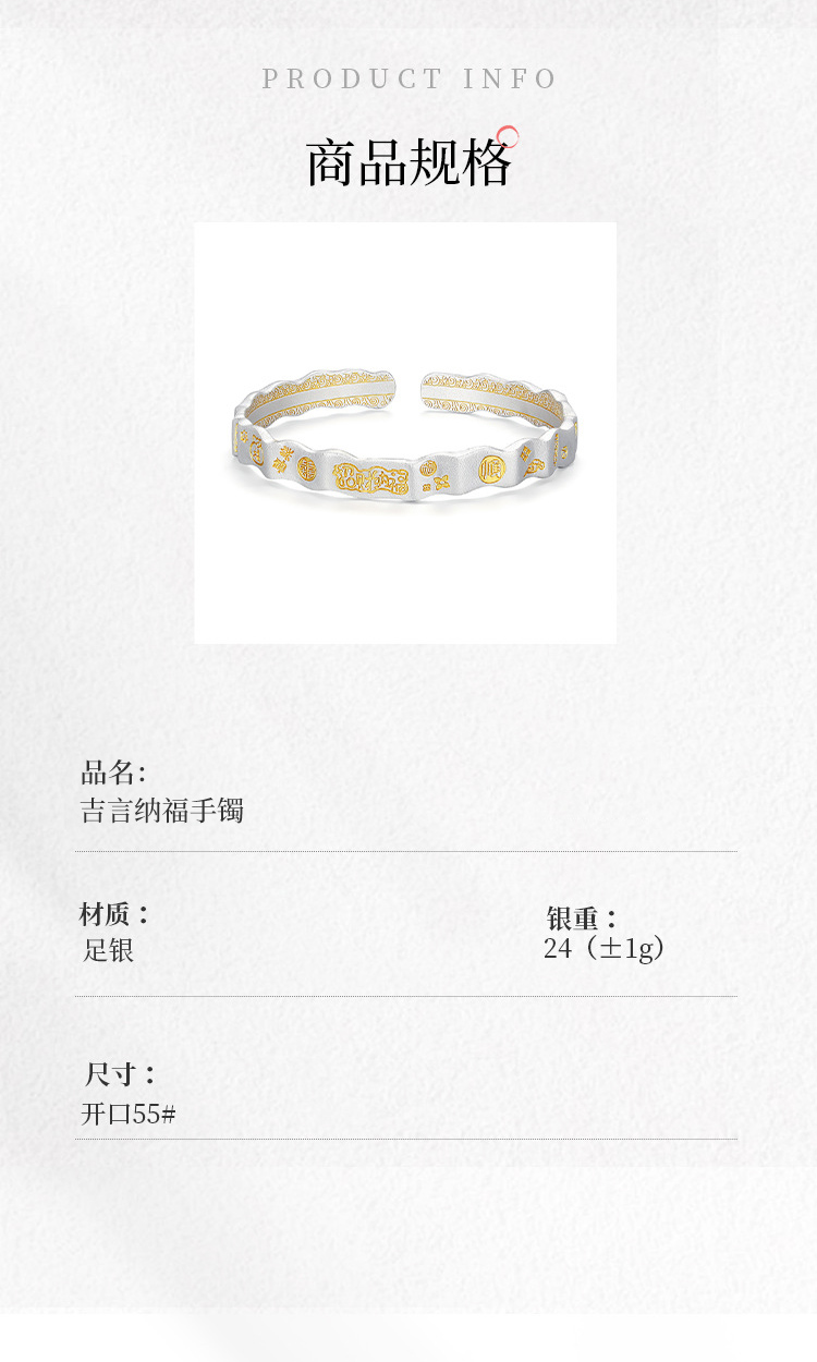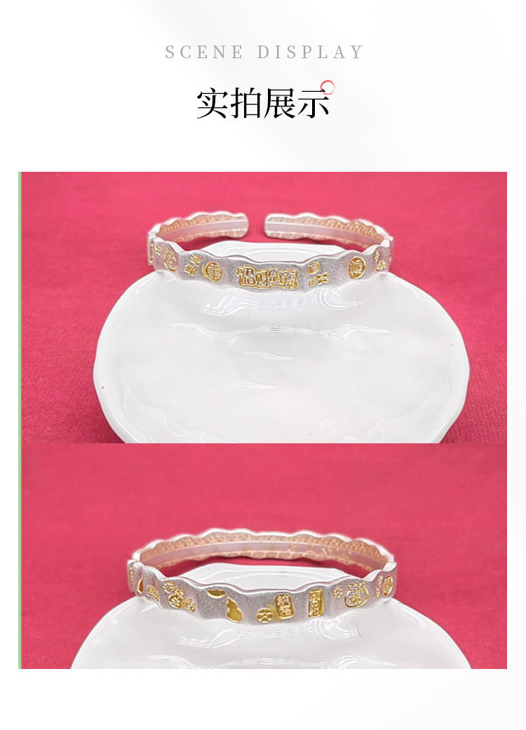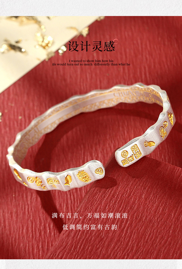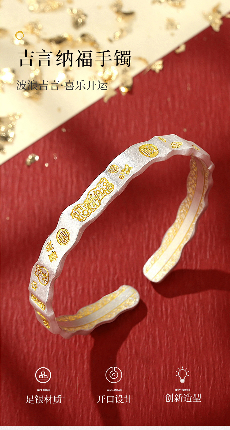 Winy999银吉言纳福手镯银色描金配证书送女友闺蜜节日生日礼物