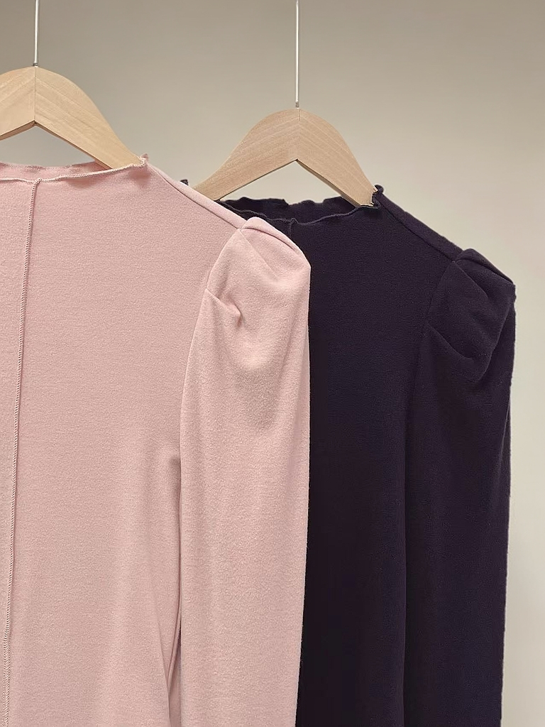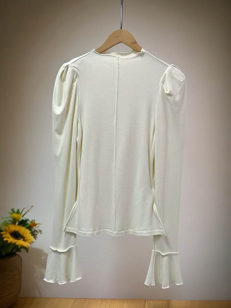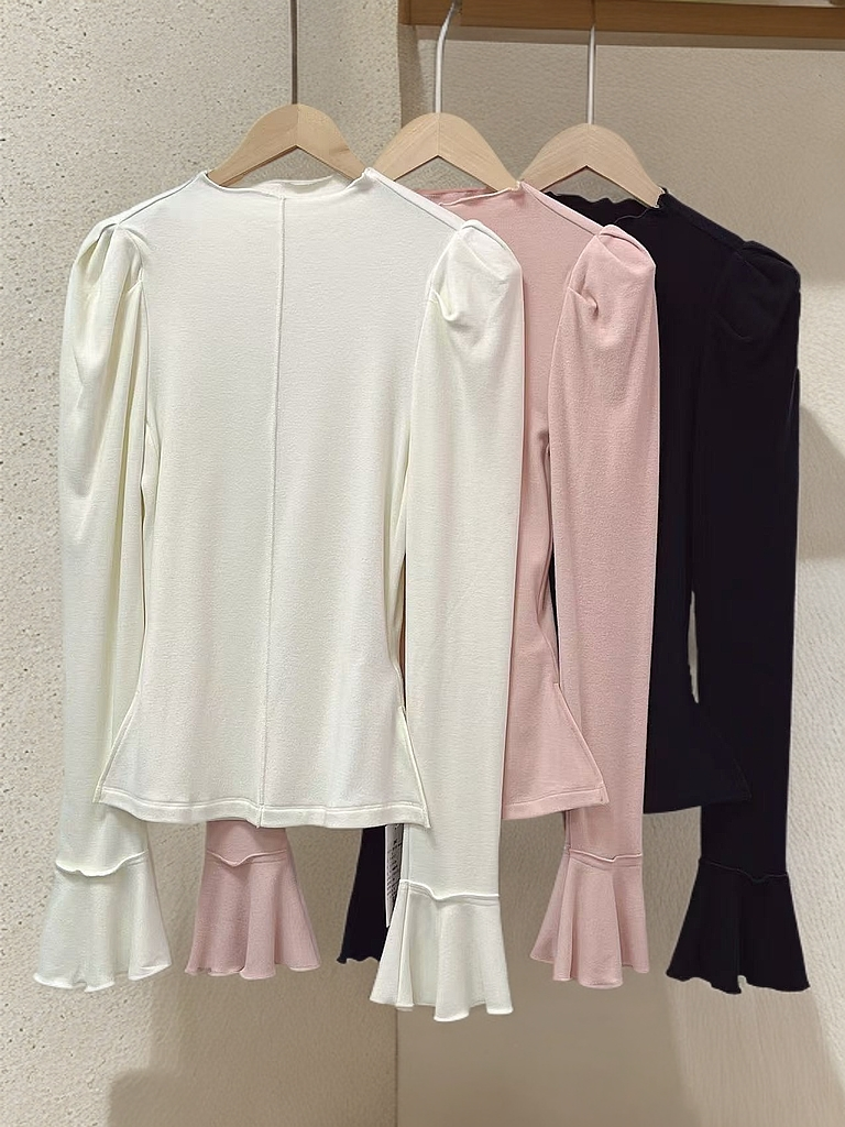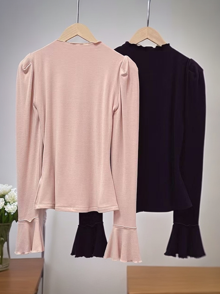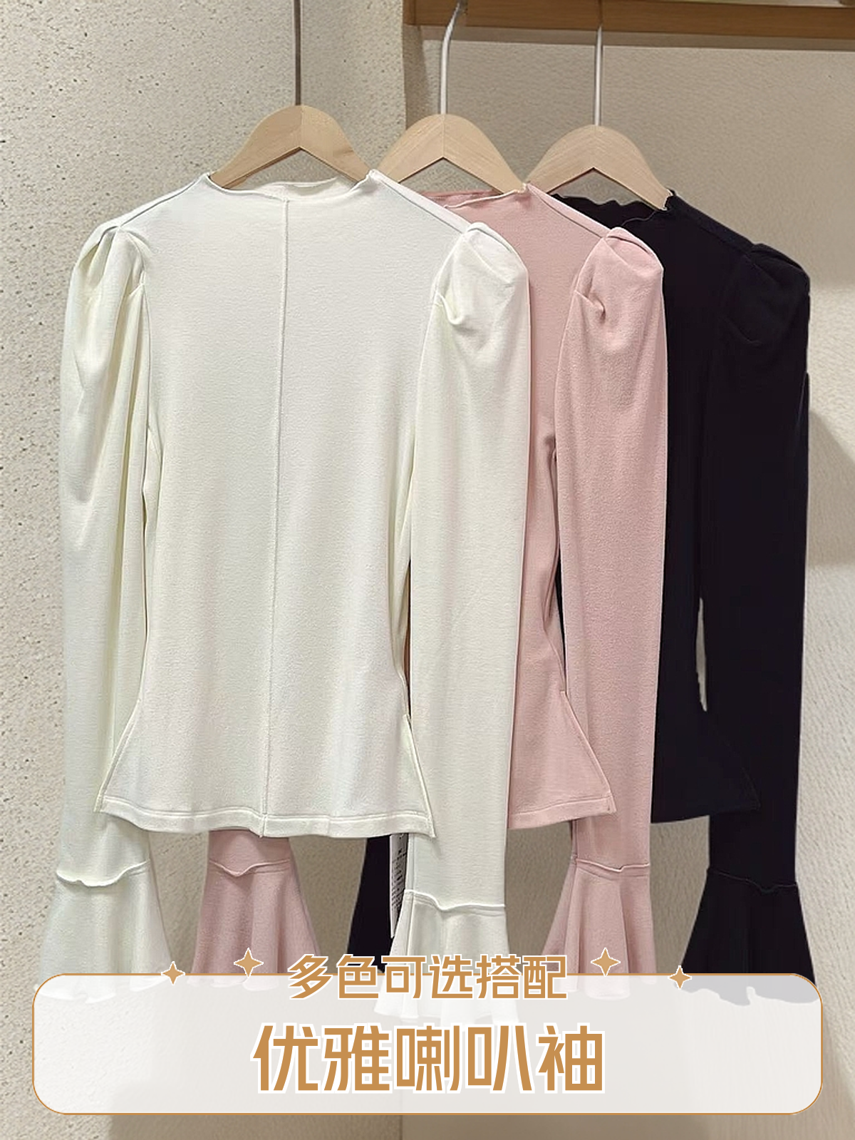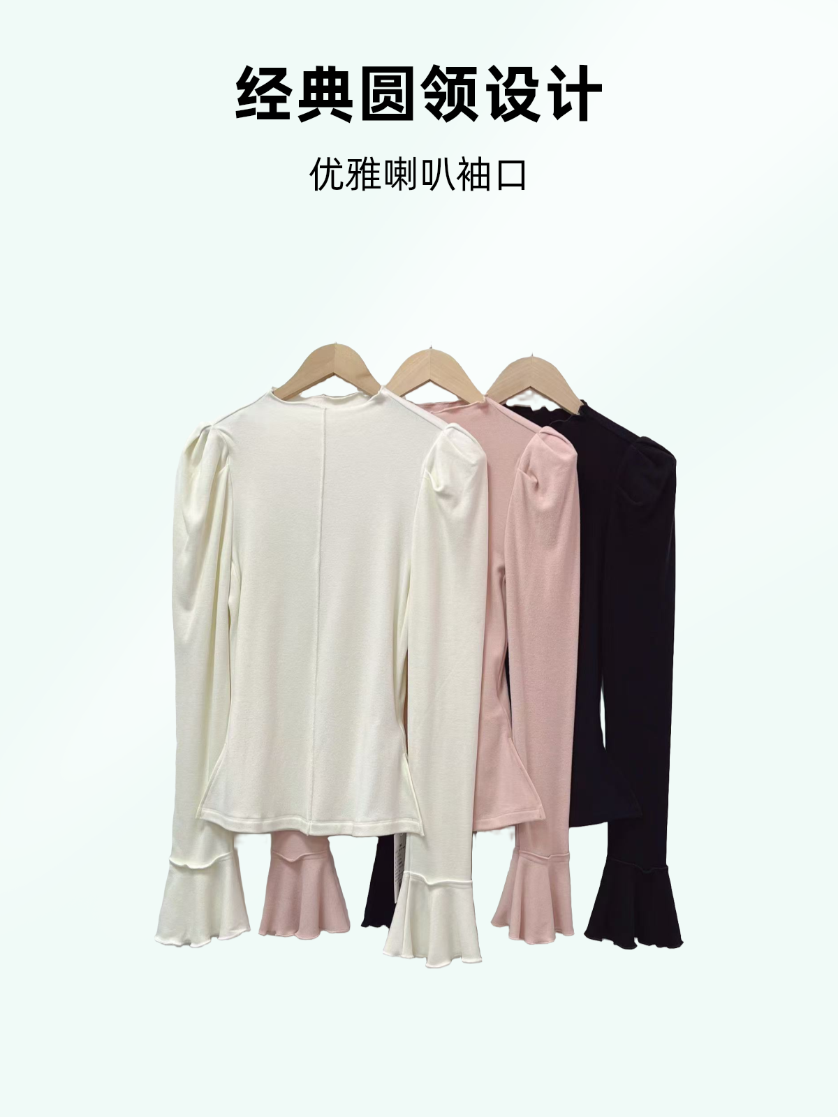 12.12错过没有!清货不退不参与退货-德绒修身喇叭袖包边泡泡袖打底衫4523-喜出