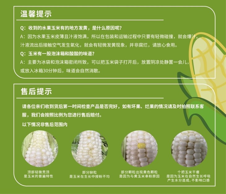 4.玉米须本身有吸附性,收到玉米反馈有包装材料味道的,不予售后。收货后尽快取出放入冰箱会逐渐消失。不影响食用。