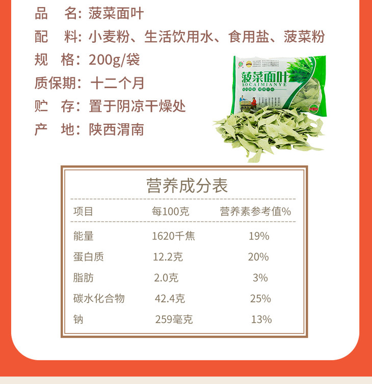 【陕富面业】菠菜挂面 200g*5袋装 刀削面片蔬菜杂粮干面条旗花整箱面叶