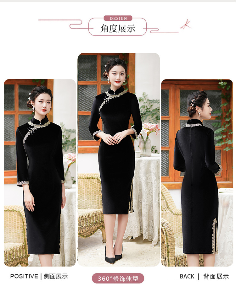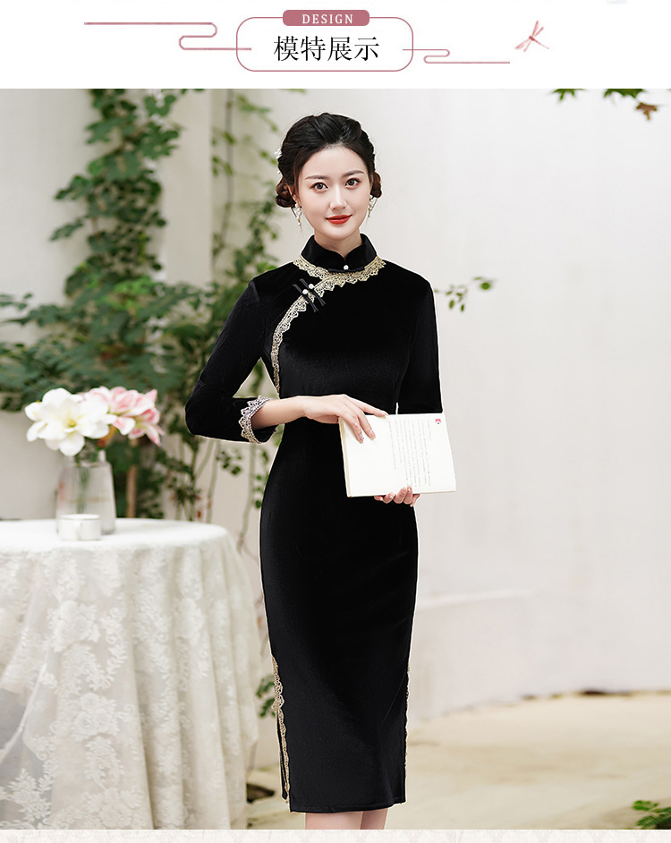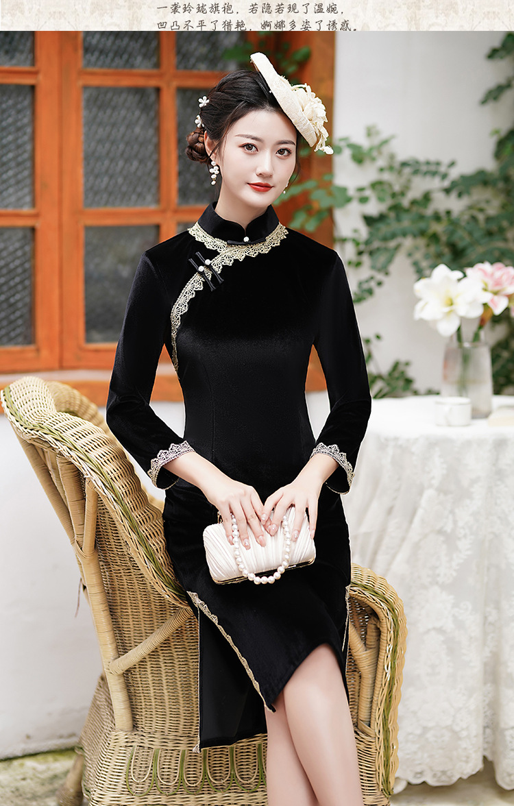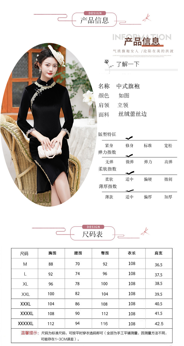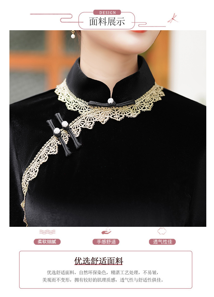 妈妈装秋款旗袍,新款女改良版黑色丝绒旗袍款秋季气质蕾丝边MX-70097