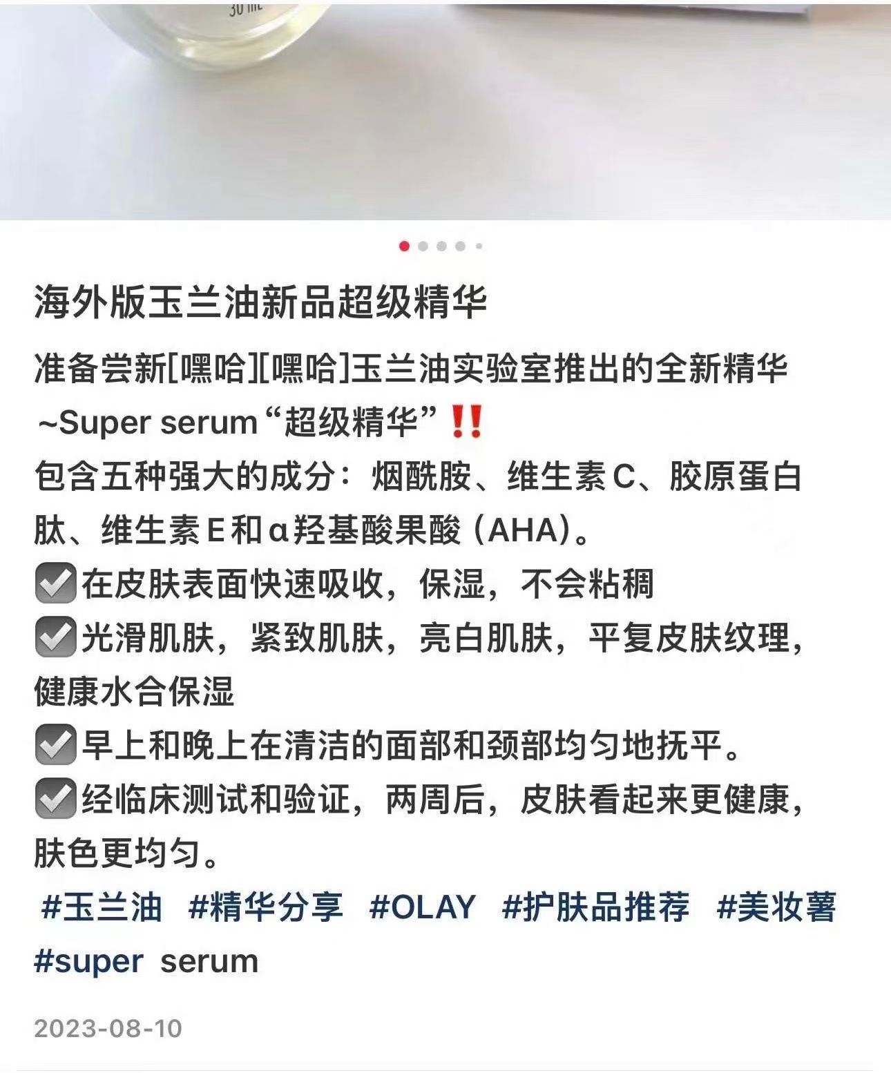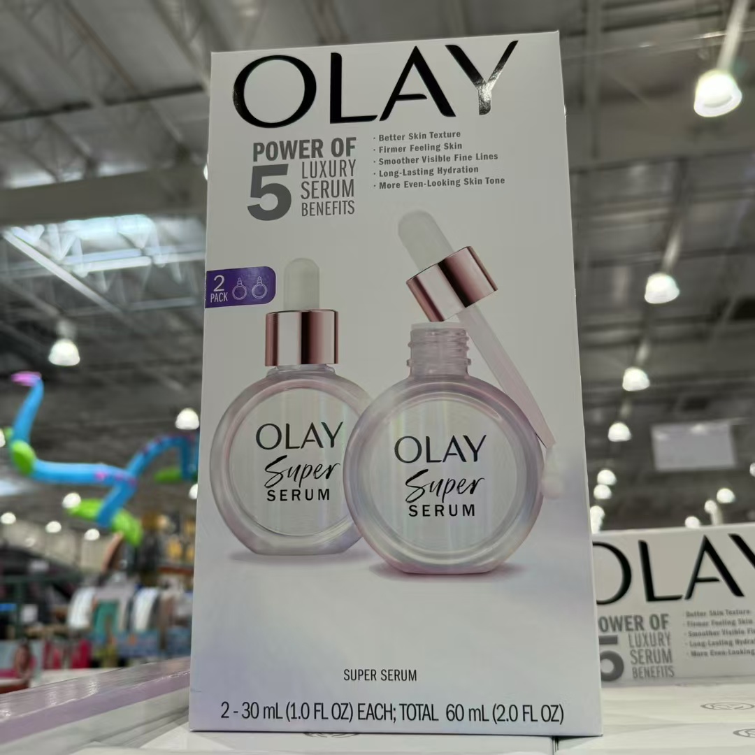 新款上市,OLAY 流光瓶精华液30ml,精华素集 5 大精华素优势于一身:1. 改善皮肤纹理 2. 肤色更均匀 3. 肌肤感觉更紧致 4. 平滑明显细纹 5. 持久保湿我们的浓缩配方含有 5 种强效成分:烟酰胺、维生素 C、胶原蛋白肽、维生素 E 和 α 羟基酸 (AHA),可深入渗透到皮肤表面并快速吸收,不会留下粘腻感,让肌肤在第一天就看起来更健康。Olay玉兰油流光瓶修复精华30ml*2瓶