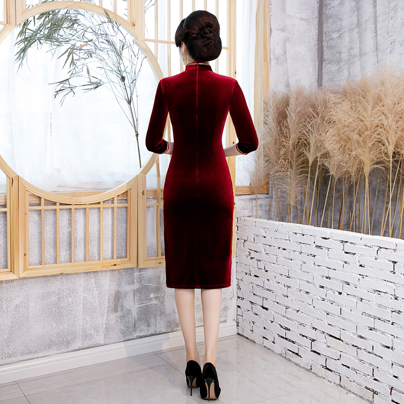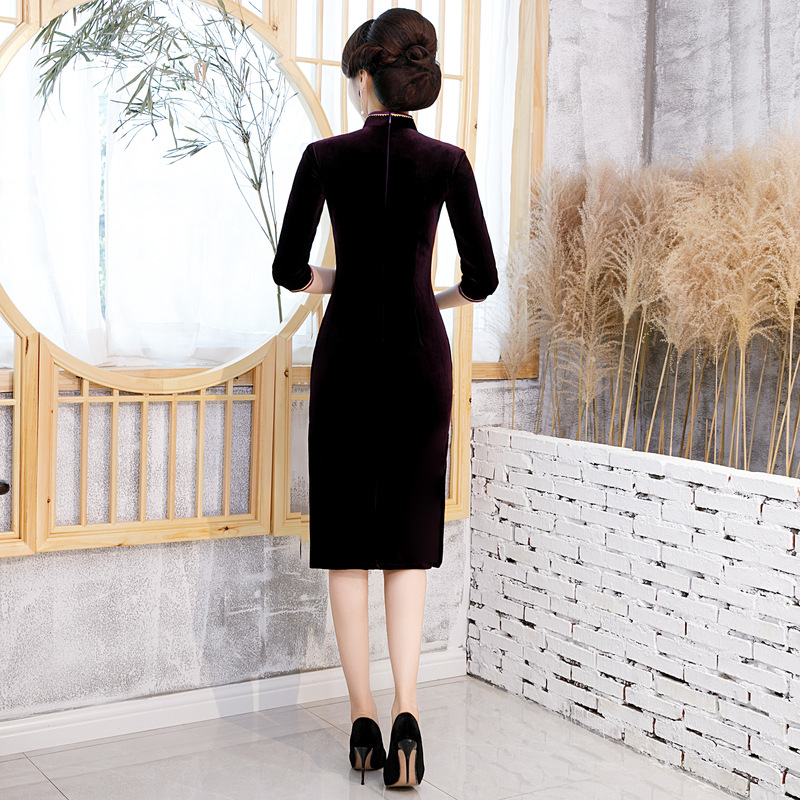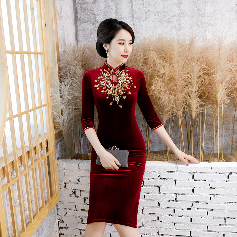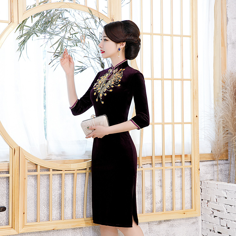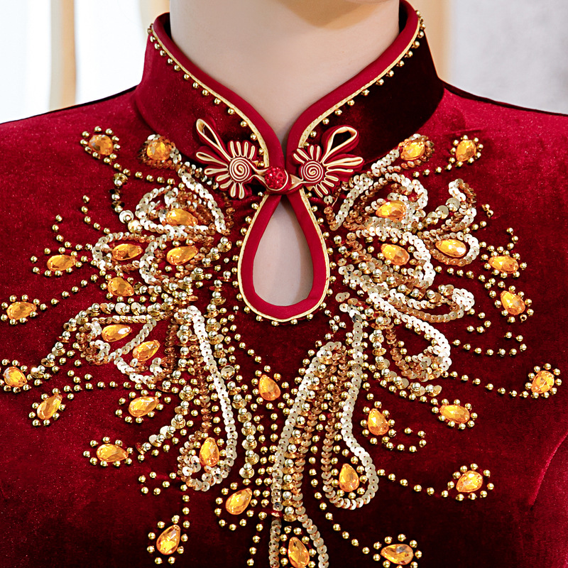 ZAYS-亮晶晶 金丝绒钉珠中长七分袖旗袍日常宴会礼服复古立领连衣裙旗袍