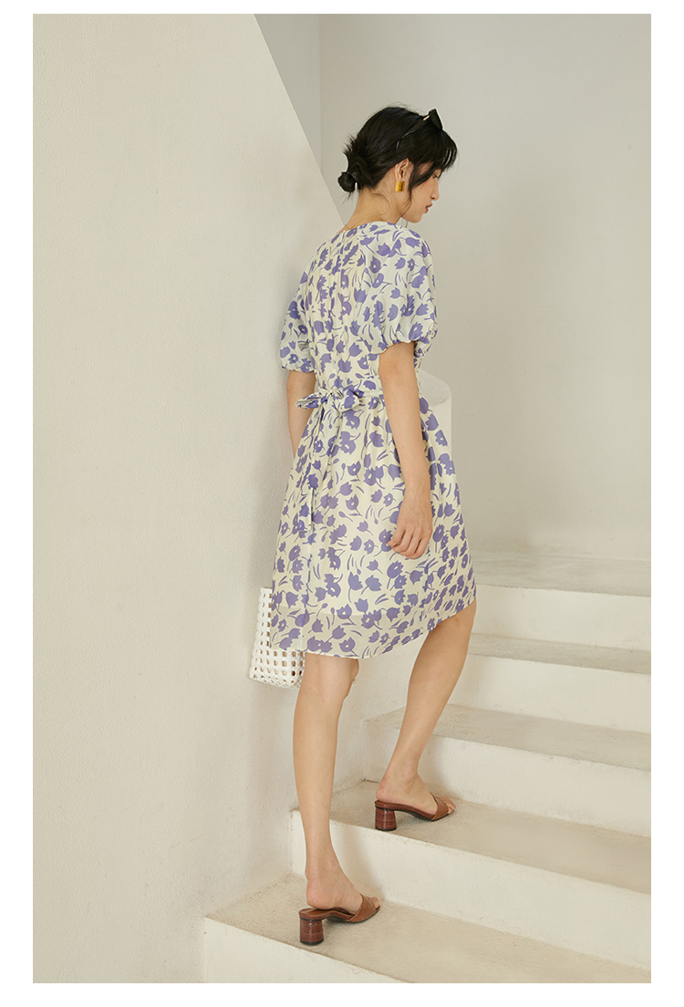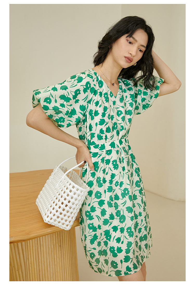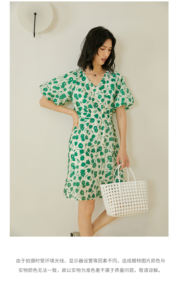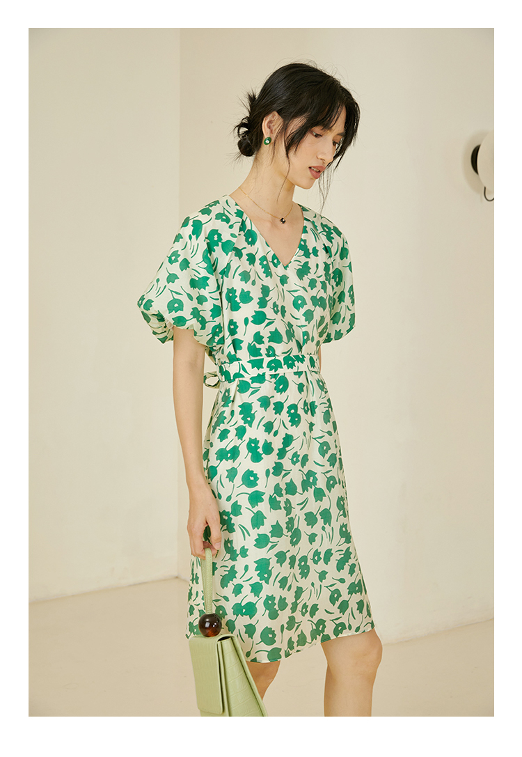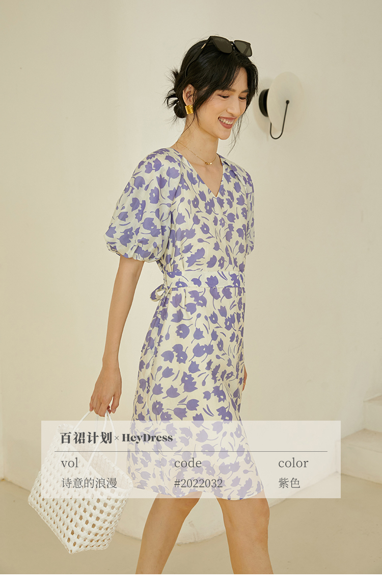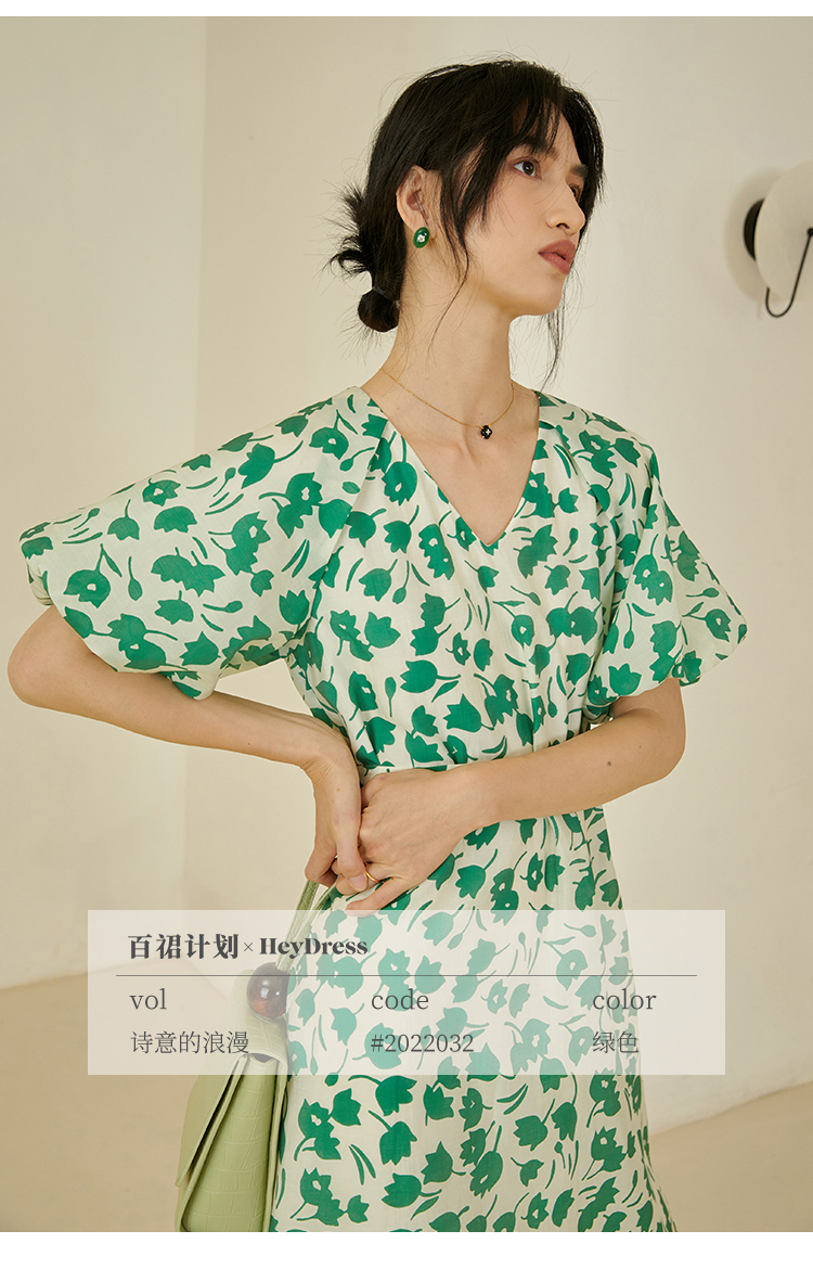 HeyDress郁金香碎花连衣裙女夏季法式复古v领收腰泡泡袖天丝裙子