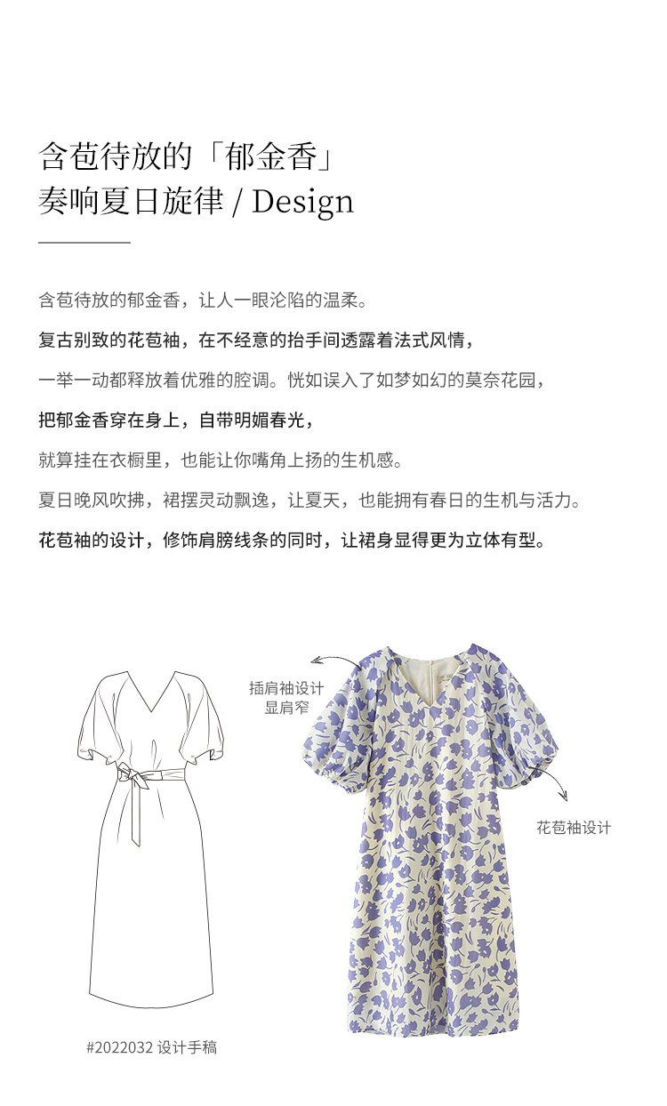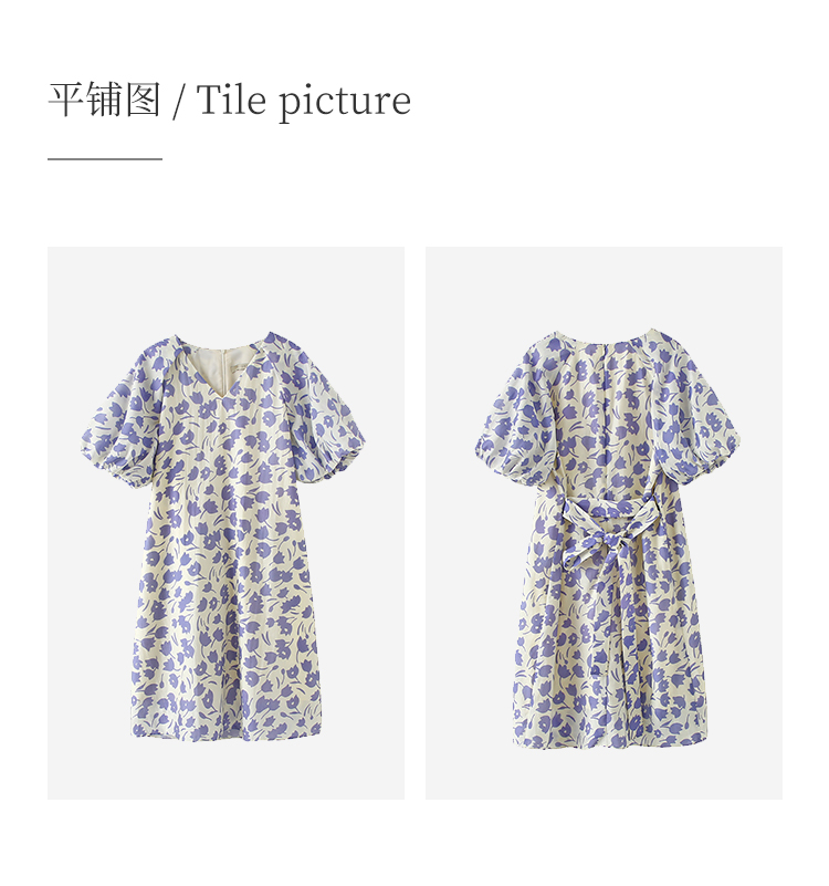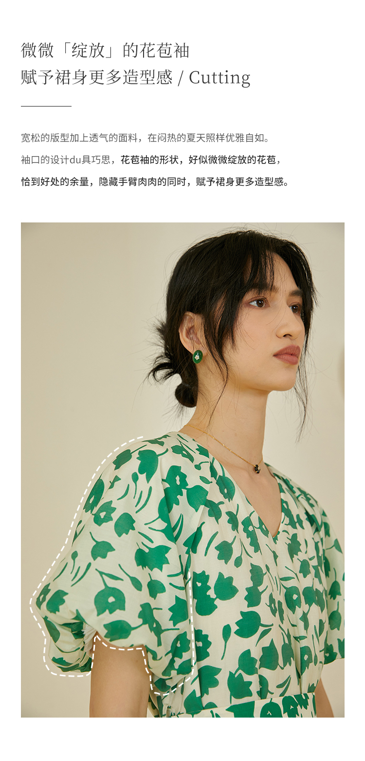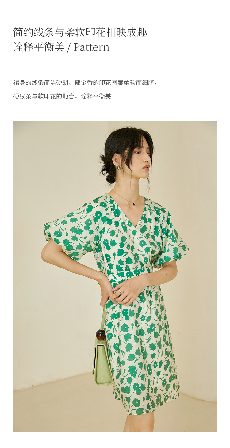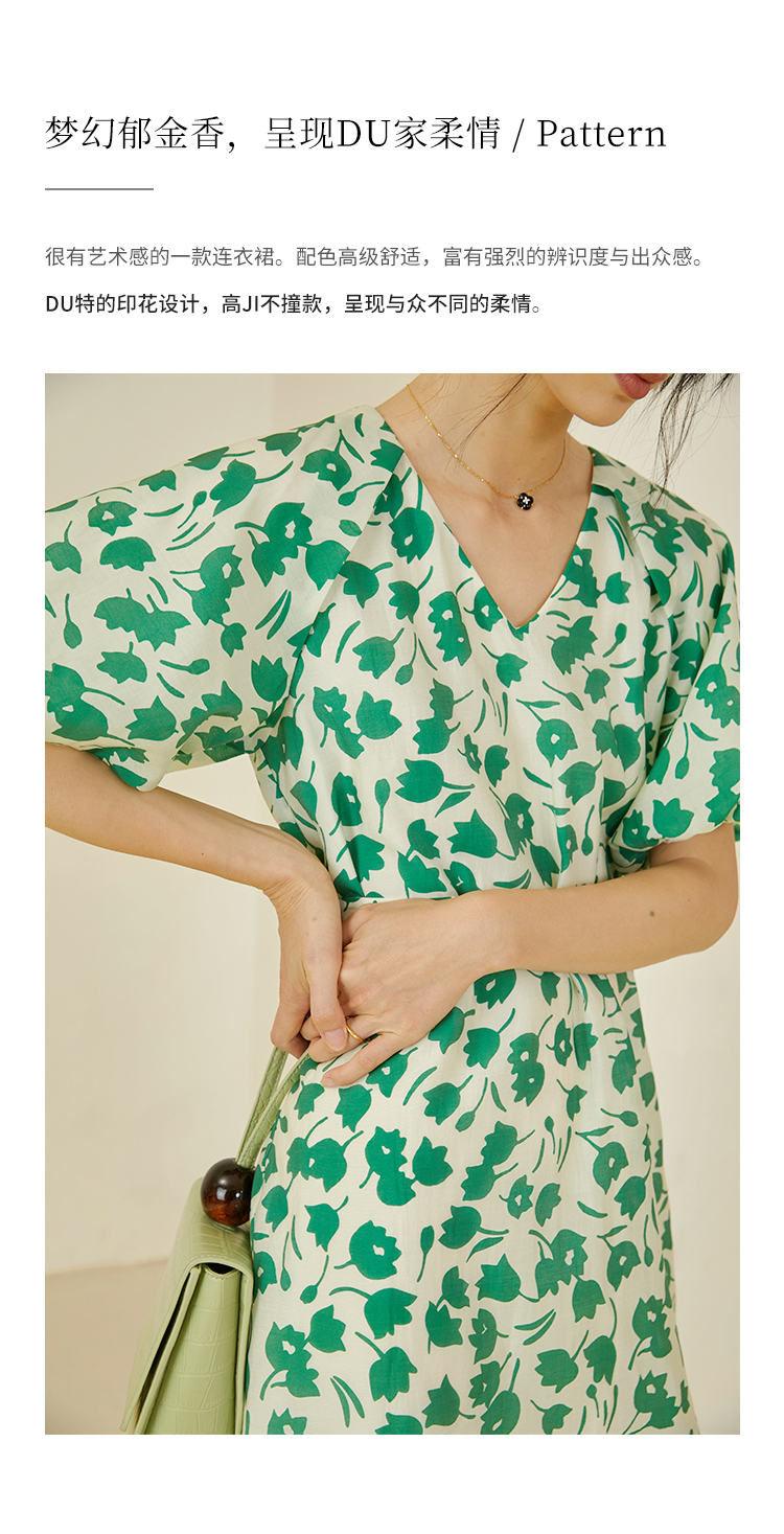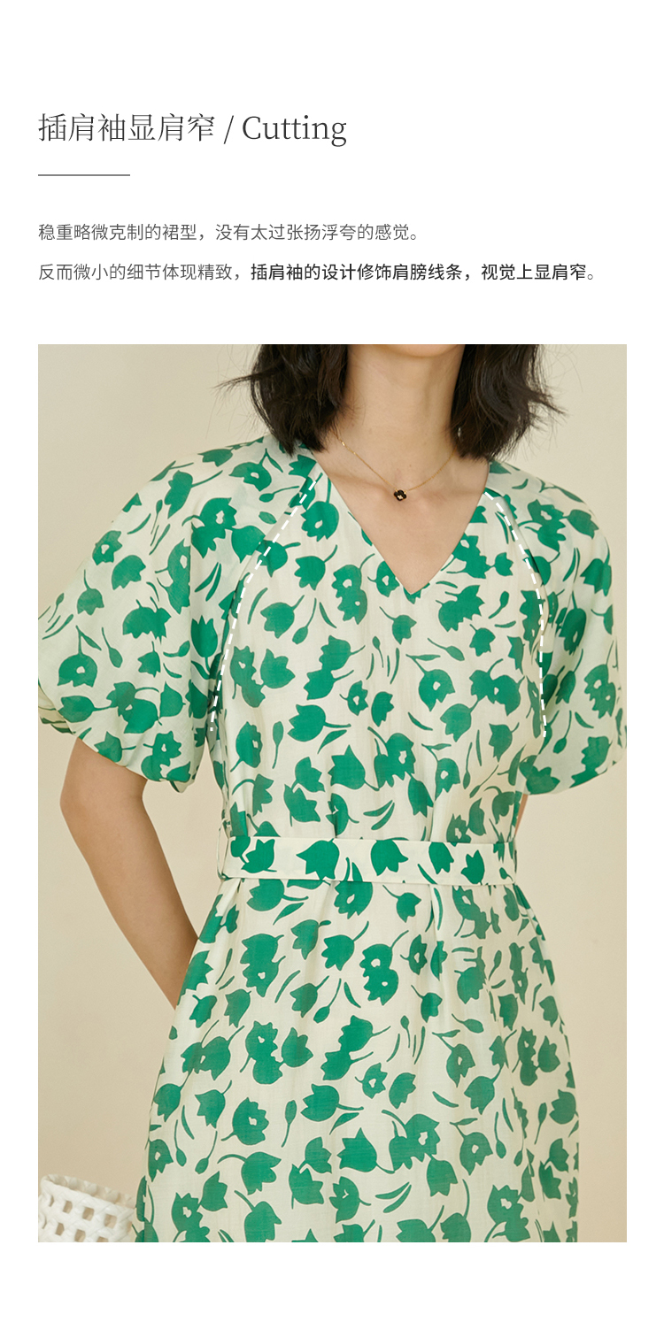 HeyDress郁金香碎花连衣裙女夏季法式复古v领收腰泡泡袖天丝裙子