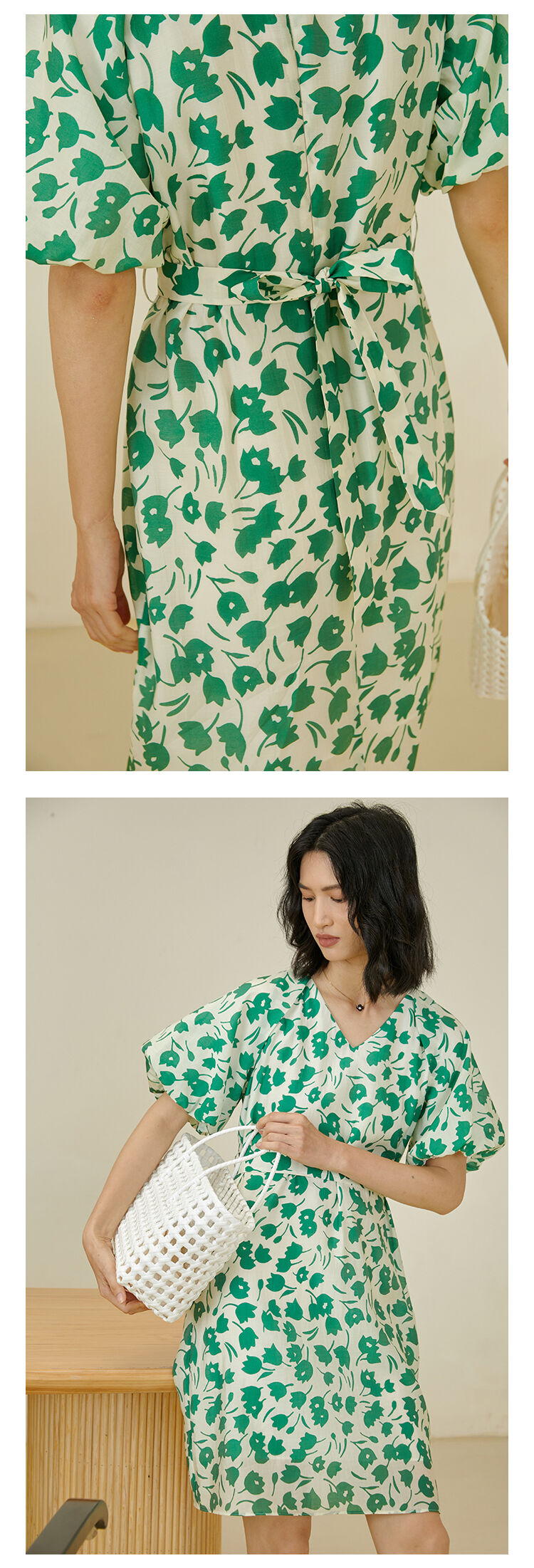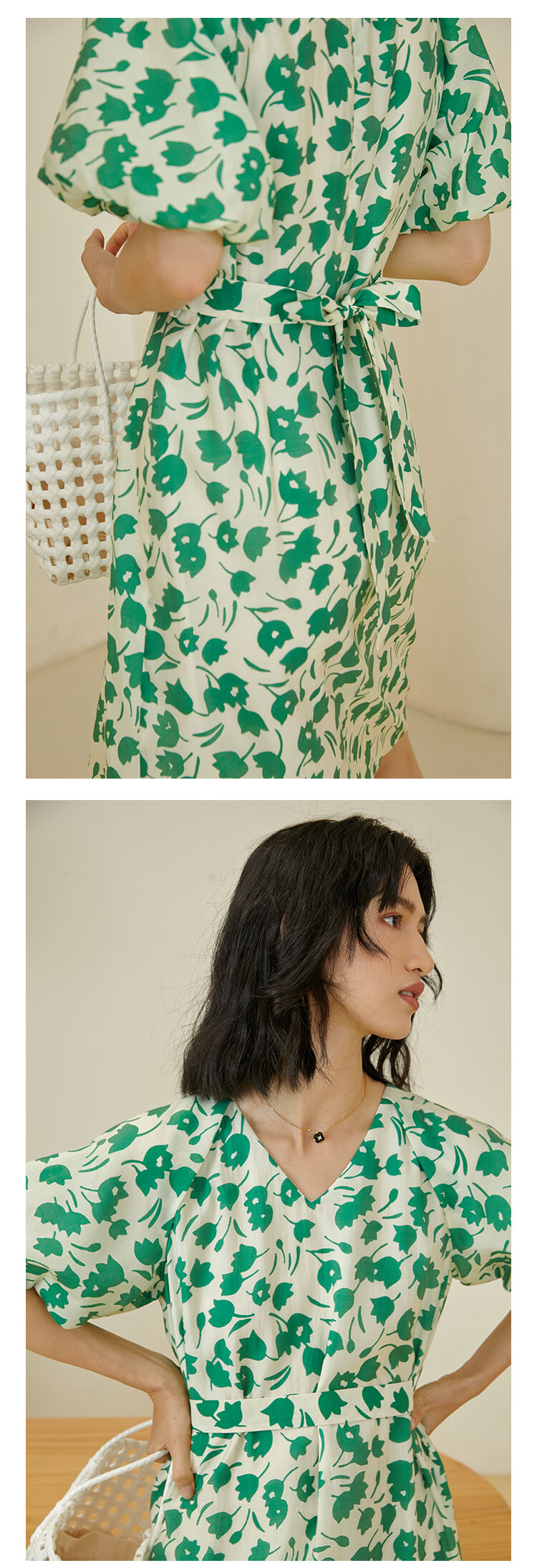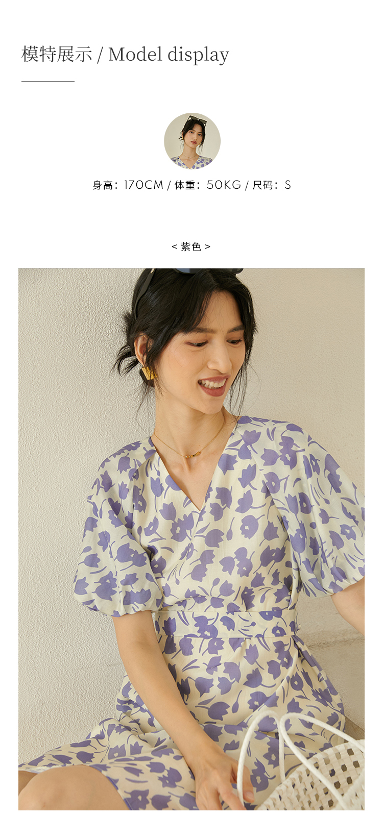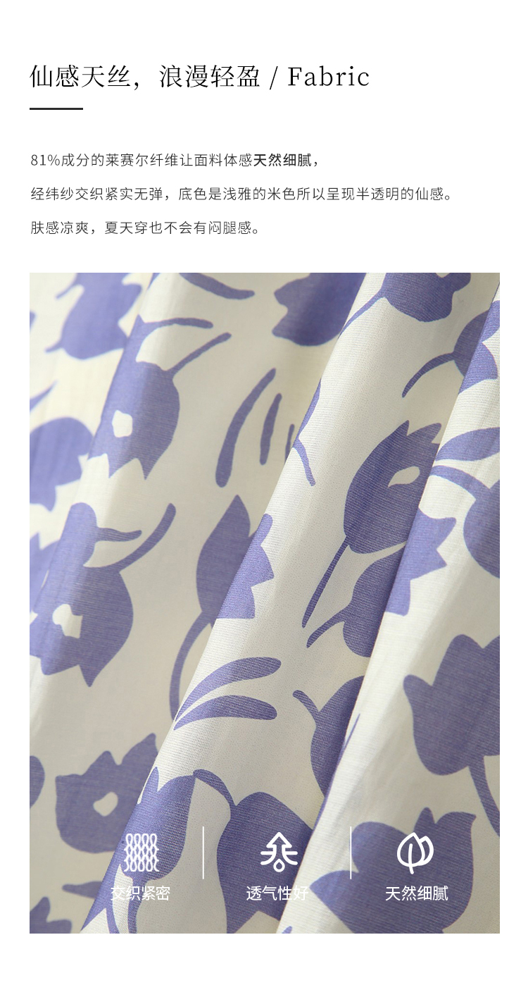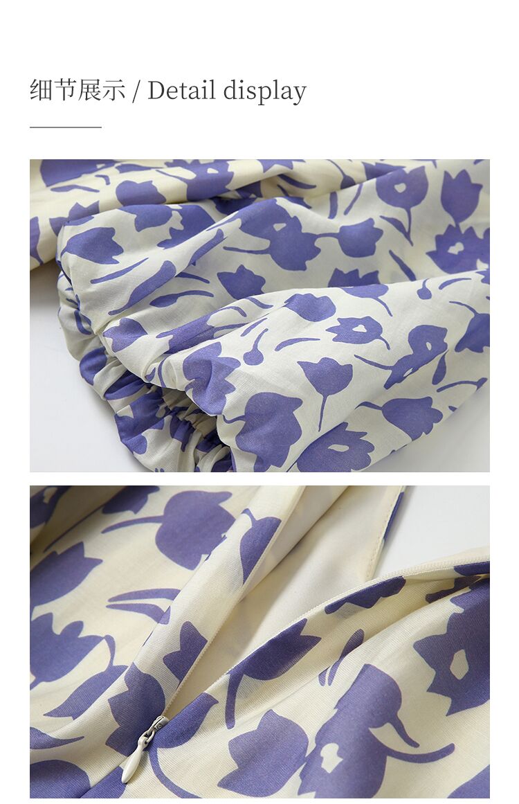 HeyDress郁金香碎花连衣裙女夏季法式复古v领收腰泡泡袖天丝裙子