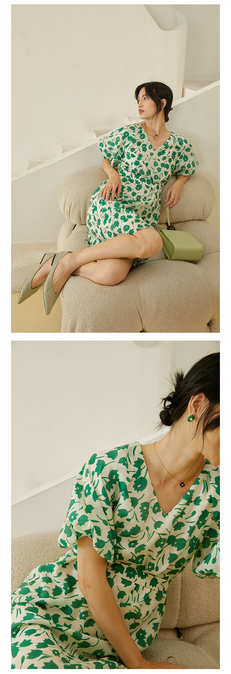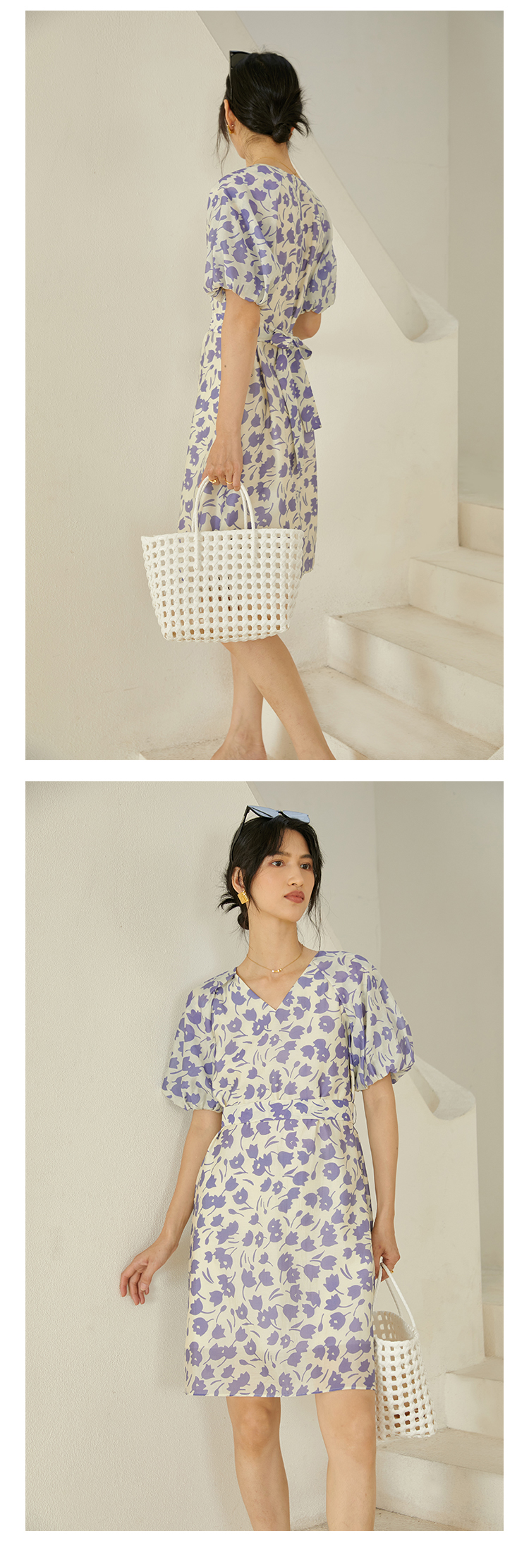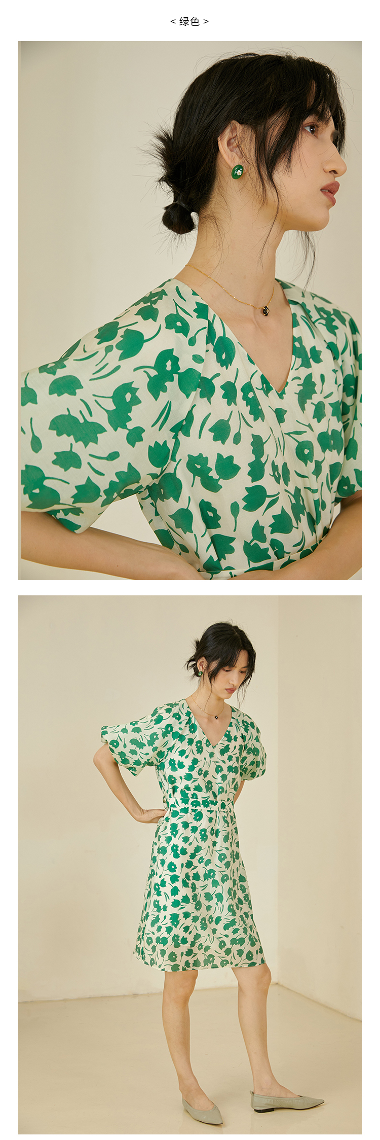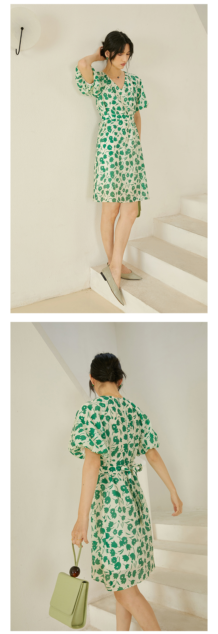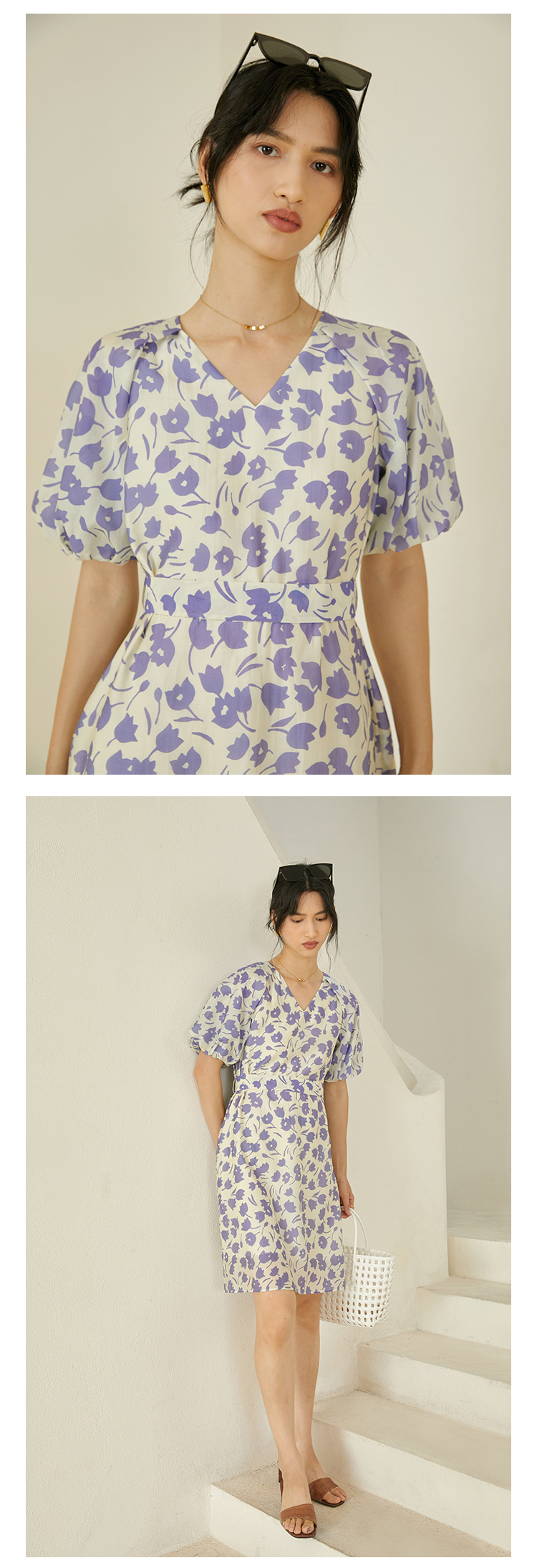 HeyDress郁金香碎花连衣裙女夏季法式复古v领收腰泡泡袖天丝裙子