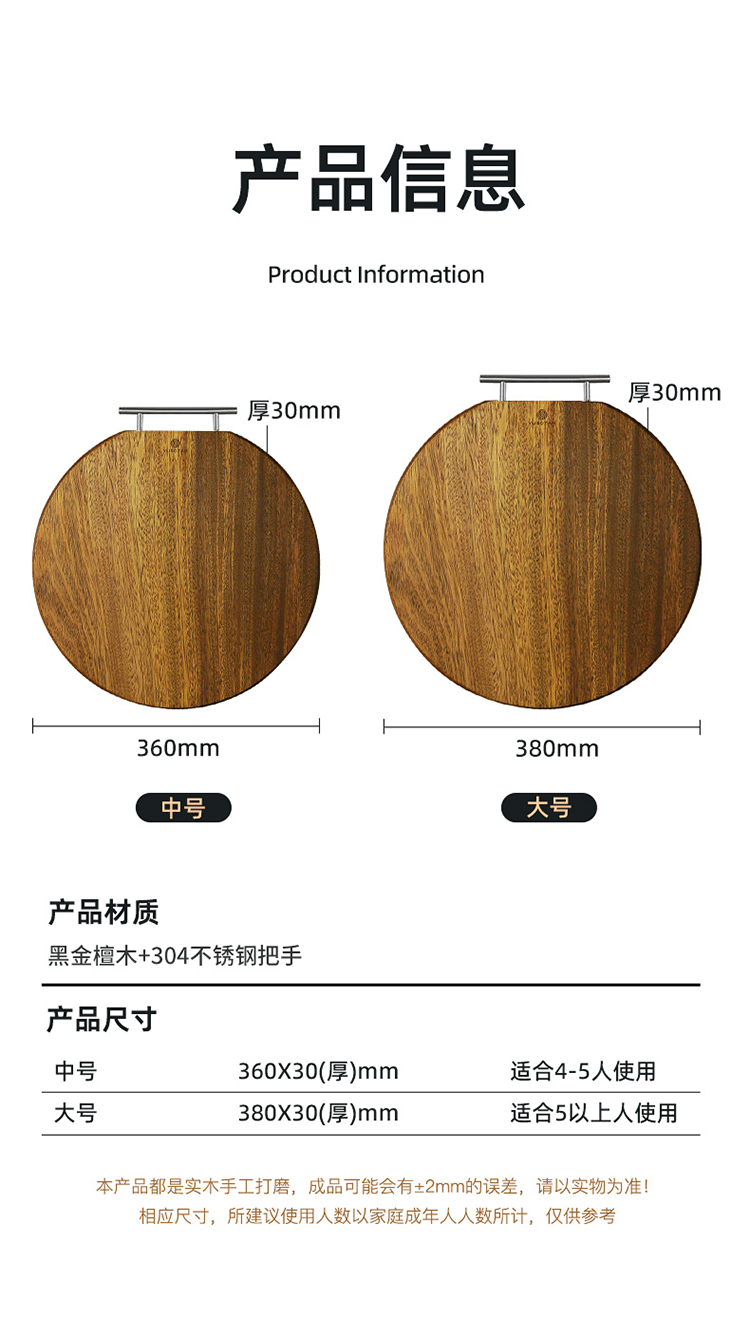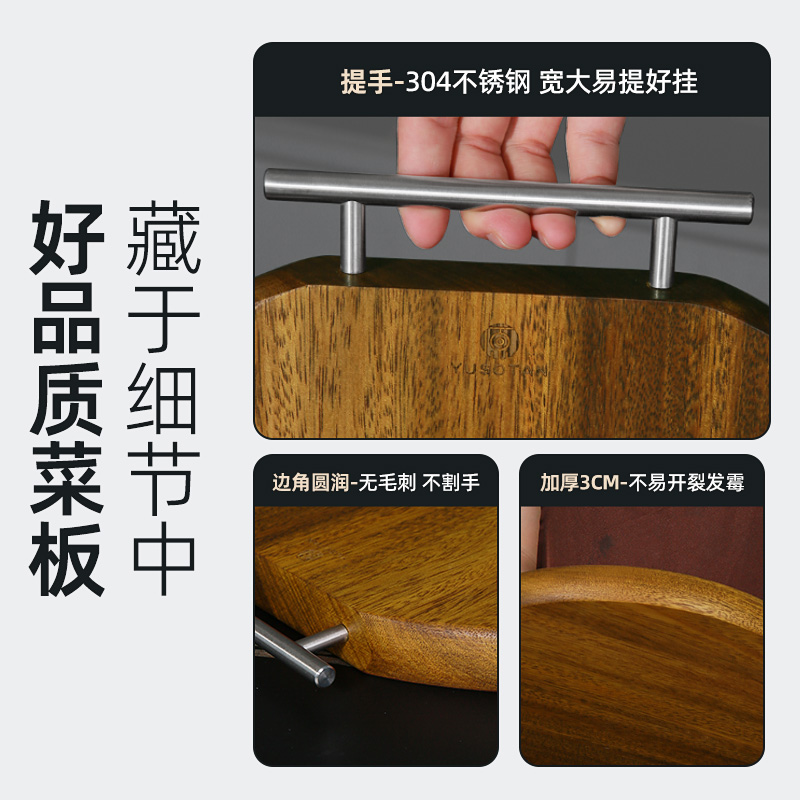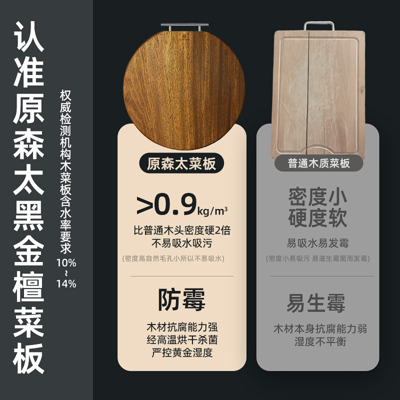 1.名贵黑金檀木整板整切,无胶水无甲醛,不上漆不打蜡,高硬度高密度,耐砍又耐剁!