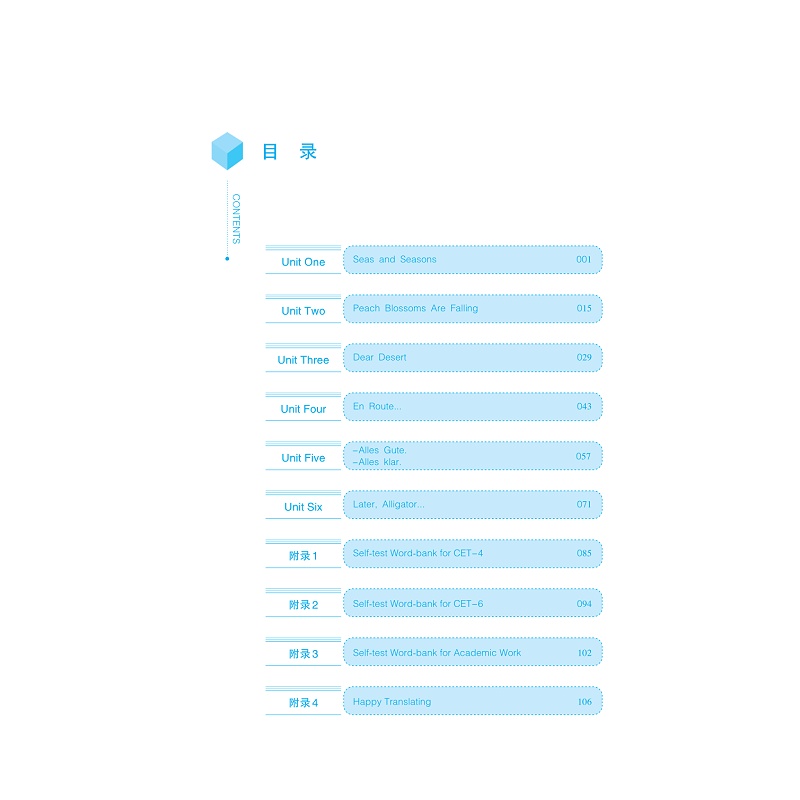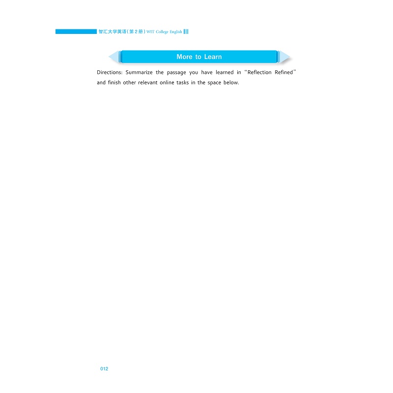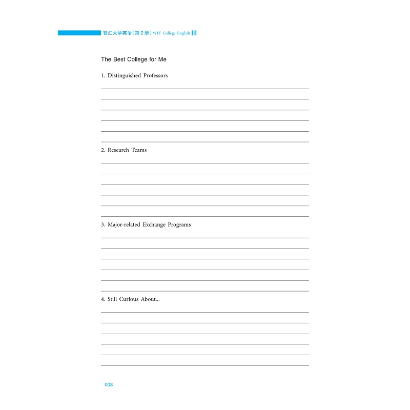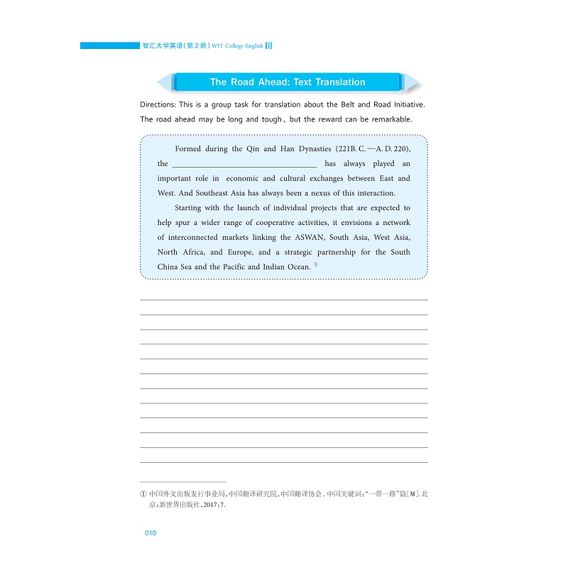 智汇大学英语(WIT College English),基于网络的、综合的、分类大学智慧生态,本教程共两册,每册6单元,每单元均以二十四节气开篇,在时间维度上串联起两册书,每个单元讲两个节气。第2册以后12个节气为主。常设版块包括:自我认知,地方志,认识世界,一带一路,应用英语,多元互鉴等。切实培养学生在“不忘本来,吸收外来”的基础上面向未来。侧重本书配套建设有慕课。本书适用于非英语专业大一、大二学生;大学阶段需要学习二外英语课程的小语种专业学生;有高中英语基础的市民。