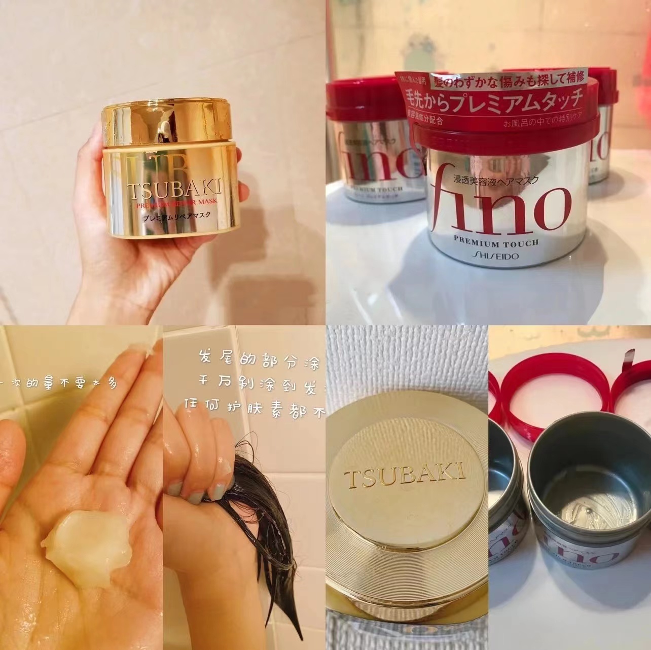 两款发膜都非常水润顺滑,小金罐TSUBAKI零秒发膜质地轻薄,非常全面,但尤其适合染烫发质;小红罐FINO发膜比较经典,细软发质选它。