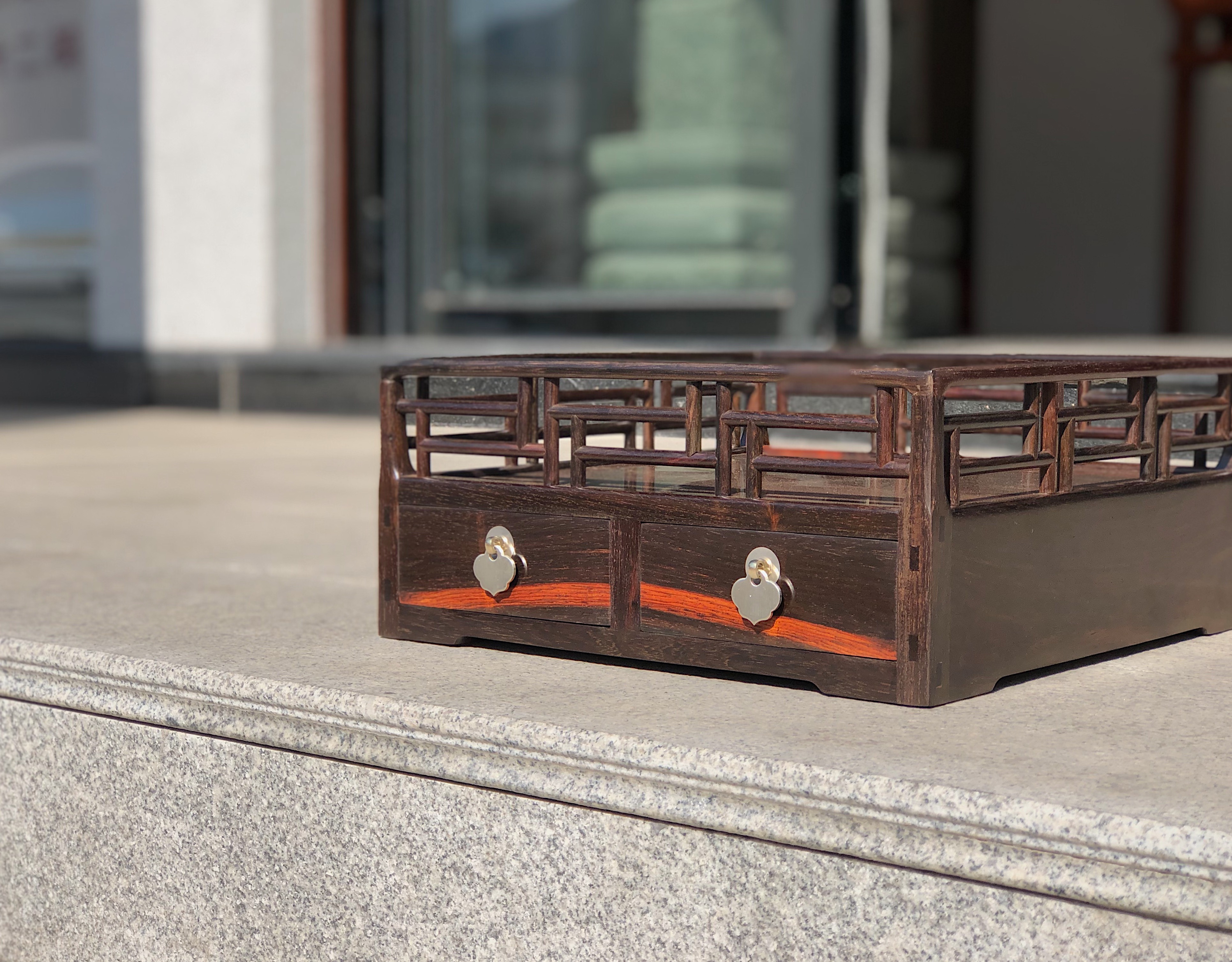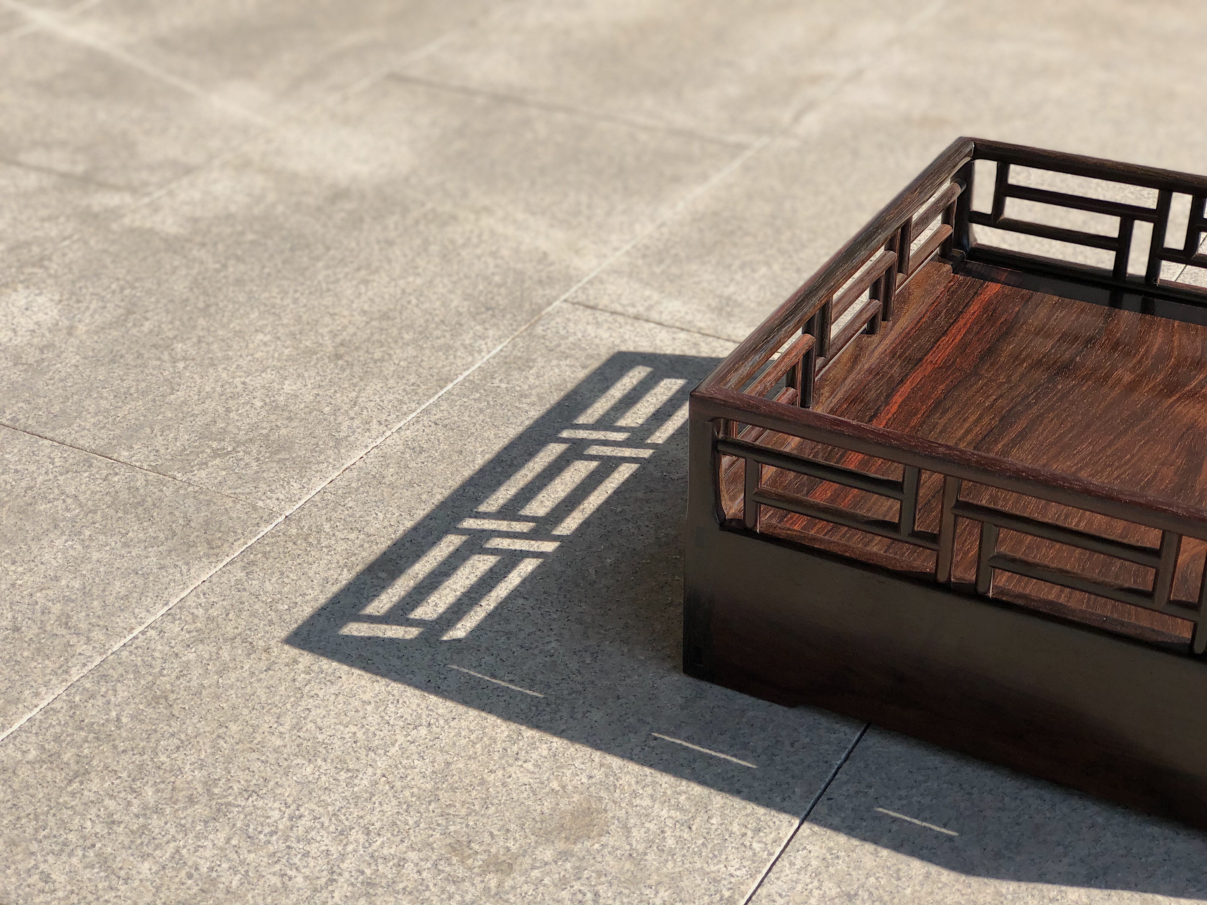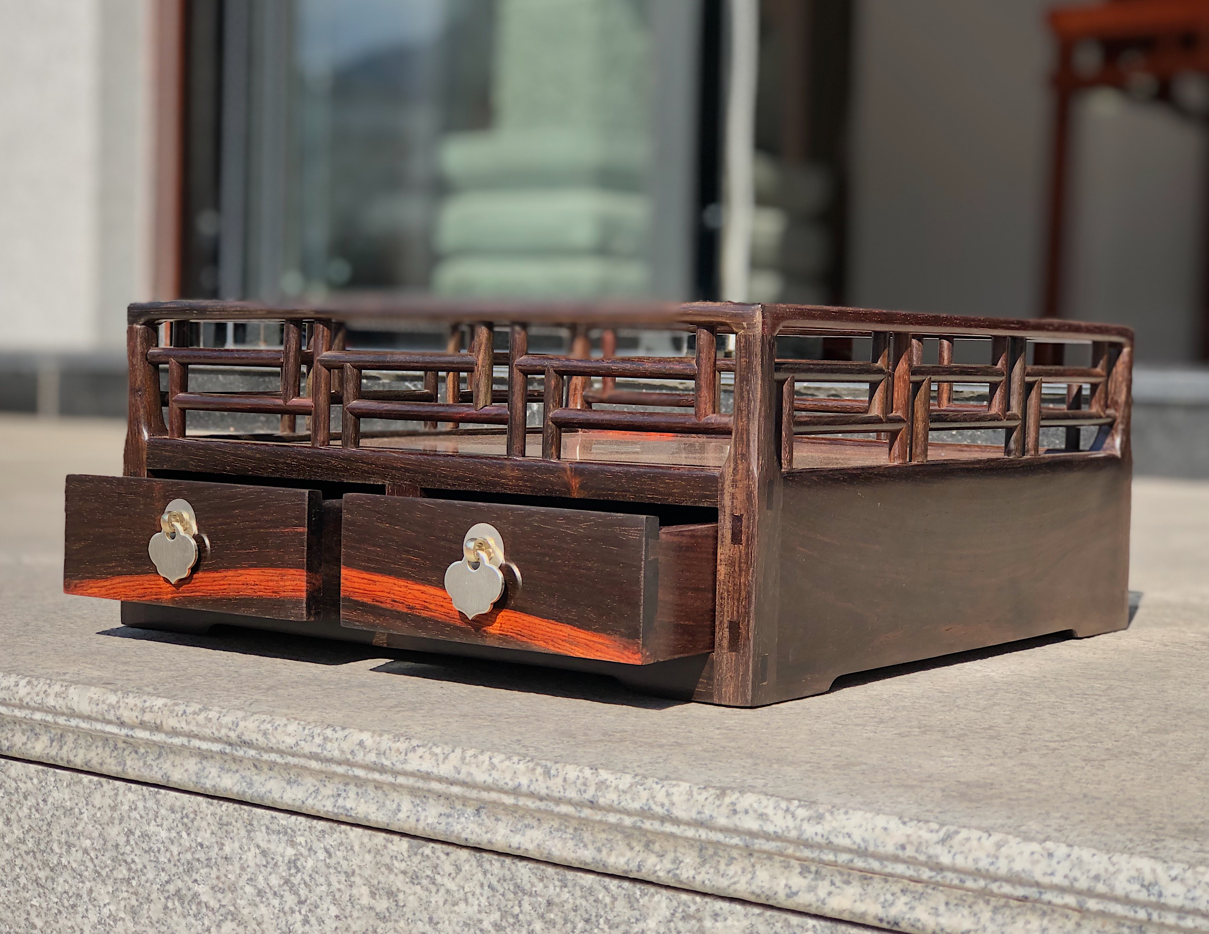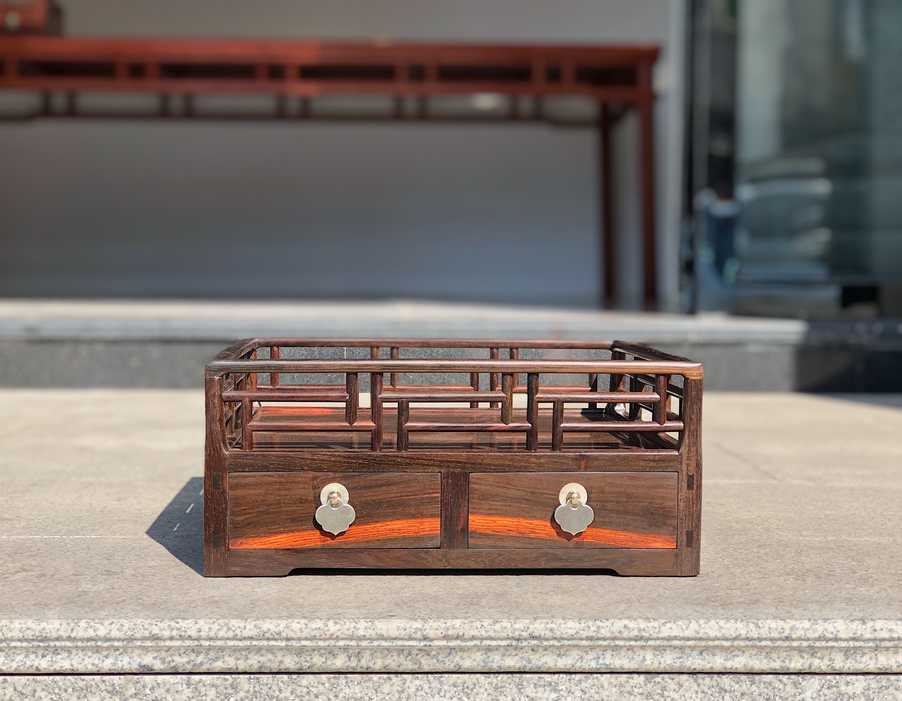 王世襄先生,书房中有一件鸡翅木都承盘后藏于上海博物馆,收录于《明式家具研究》戊26,此器为典型明式风格,呈方形四面井字棂格,亦称“风车式”,棂格圆木做飘肩丁字结合,尤为吃工,其结构为四根栏杆望底直通,形成角柱,三面盘墙用整版,板端出榫,和角柱透榫相交,与常见的攒框打槽装板方式不同,此缅甸花梨复刻款,屉亦用厚独板,器小弥珍之态度,沉甸压手,从传世情况看,都承盘在清代比明代更为流行,故此复刻款殊为难得,至于案头,更添风雅。