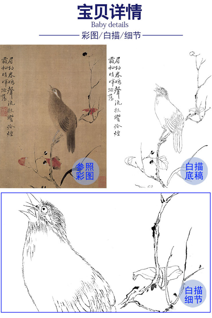 【有步骤、大彩图】王震工笔画白描底稿博古斗方小品《清供(春)》花瓶猫初学者临摹花鸟线稿WZ30